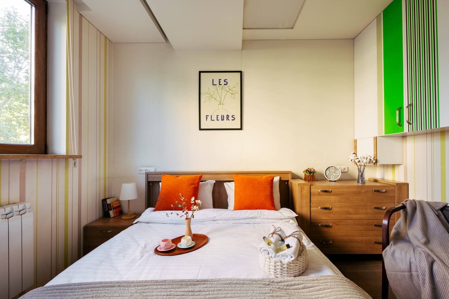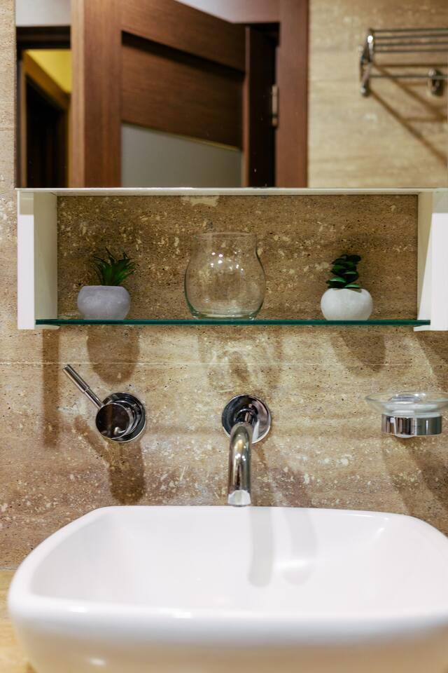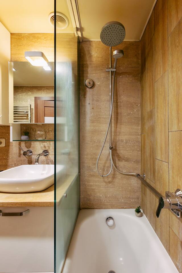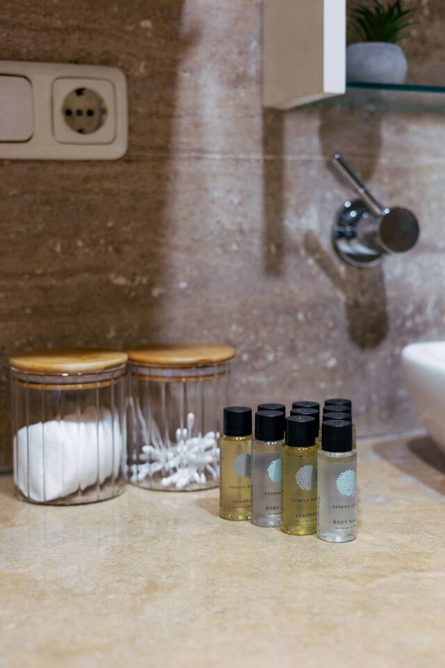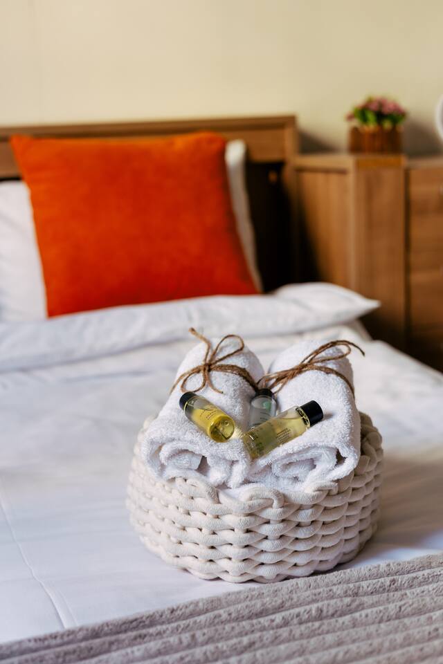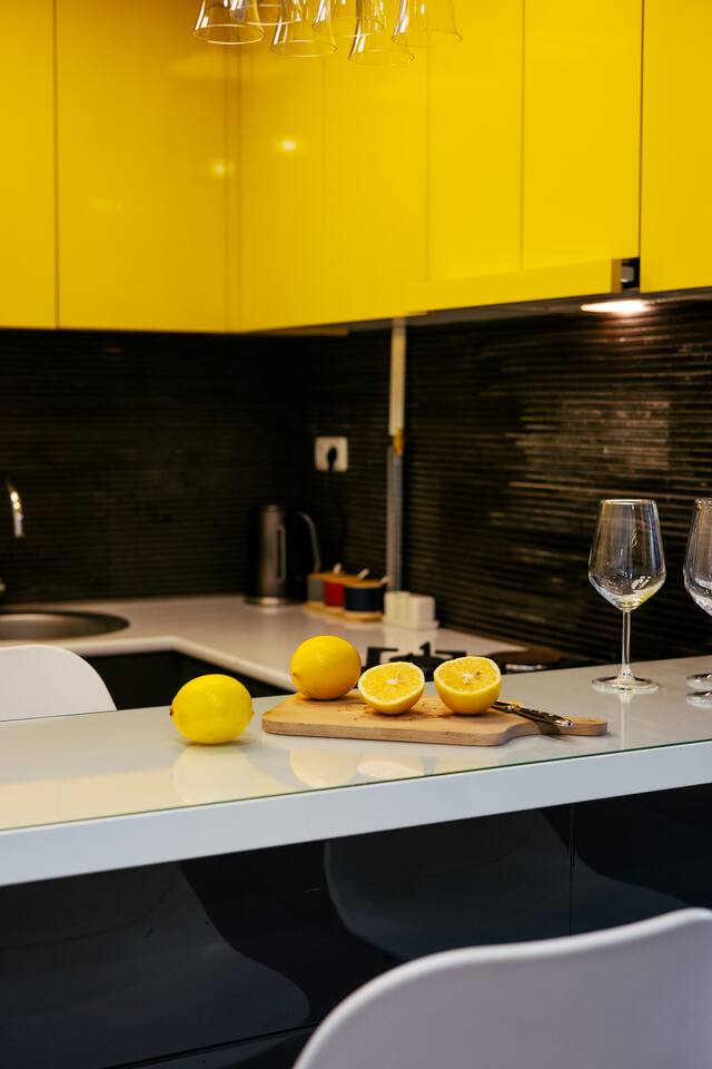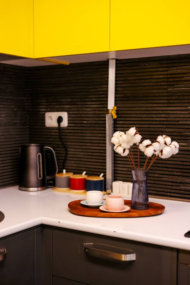 Welcome to Amber by Hotelise, a warm, inviting space in the heart of Yerevan’s vibrant center. Located at 10 Sayat Nova, this apartment combines a central location with a cozy peach and cream color scheme, just minutes from Swan Lake, the Opera Theatre, and Northern Avenue. With the city’s best cafes, art spots, and nightlife at your fingertips, Amber is the perfect base for exploring Yerevan. Living Room and Kitchen: Amber’s living area features a spacious L-shaped sofa, great for hanging out or watching TV, with an inviting French balcony that brings in natural light. The amber tones and wooden feature wall create a relaxed, warm atmosphere. The open kitchen is both functional and stylish, with cheerful yellow accents, a breakfast bar, and full amenities, including a dishwasher, microwave, kettle, and toaster. Bedroom 1: This room has a single bed and an armchair that opens up into an extra sleeping space. Roller blinds keep the light out when you need a quiet, restful sleep. Bedroom 2: A comfortable king-size bed with a quality mattress, top-to-bottom mirrored wardrobe, roller blinds, and a chest of drawers make this bedroom practical and inviting, with plenty of storage and tasteful decor. Bathroom: A full bathtub adds a rare touch of comfort, paired with high-quality tiles, strong water pressure, and a washing machine. There’s plenty of space for all your essentials. With its warm ambiance, central location, and thoughtful design, Amber offers a perfect blend of comfort and convenience for your Yerevan stay. At Hotelise, we’re committed to creating spaces that feel like home while adding a touch of style and charm.