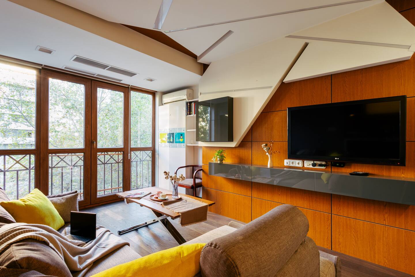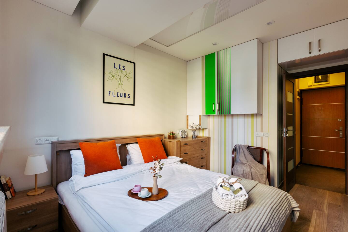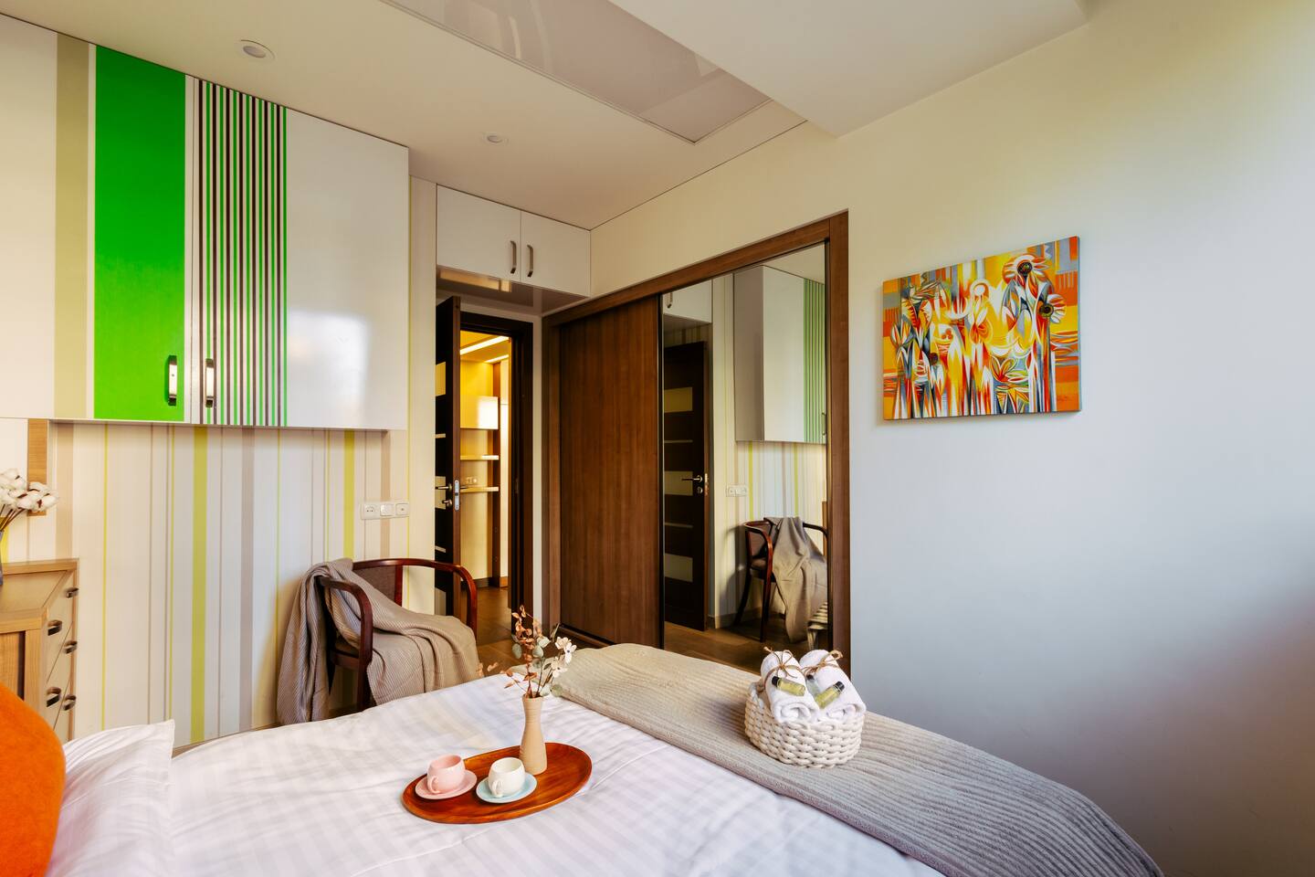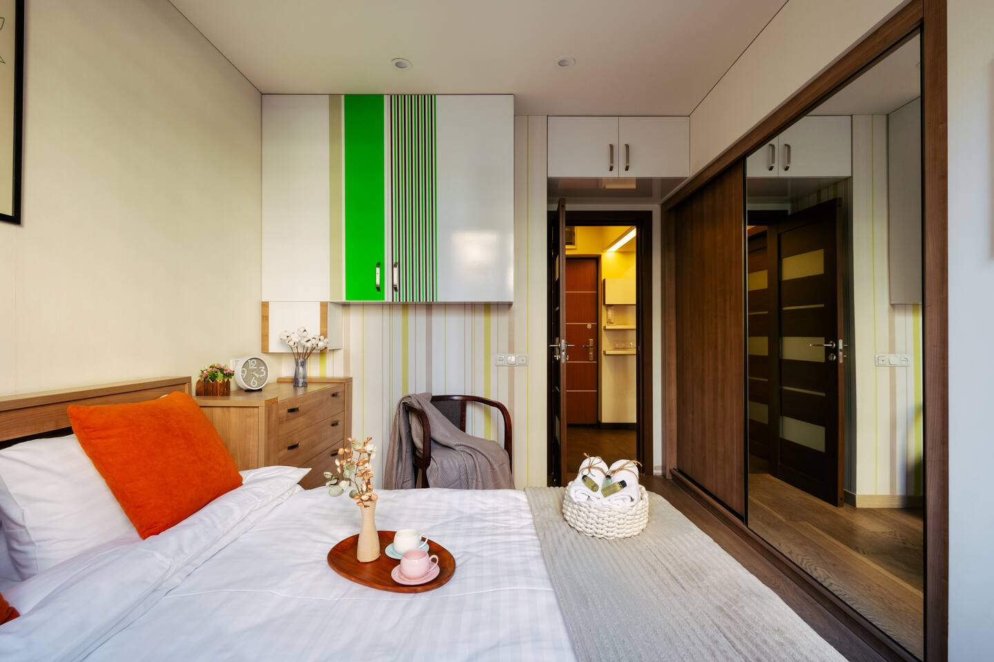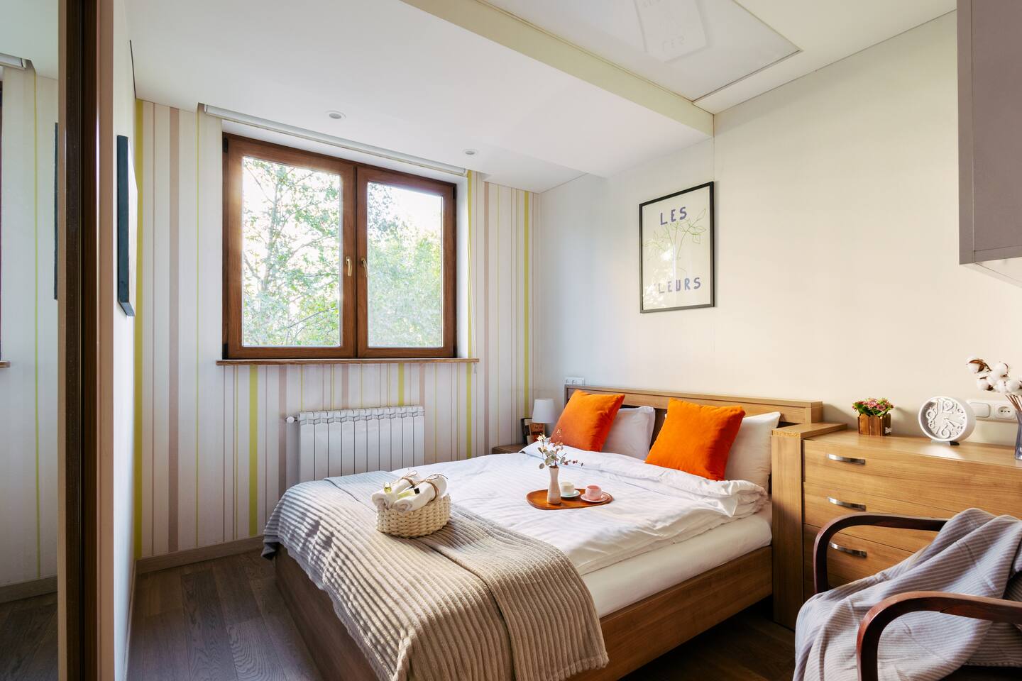Welcome to Amber by Hotelise, a warm, inviting space in the heart of Yerevan’s vibrant center. Located at 10 Sayat Nova, this apartment combines a central location with a cozy peach and cream color scheme, just minutes from Swan Lake, the Opera Theatre, and Northern Avenue. With the city’s best cafes, art spots, and nightlife at your fingertips, Amber is the perfect base for exploring Yerevan. Living Room and Kitchen: Amber’s living area features a spacious L-shaped sofa, great for hanging out or watching TV, with an inviting French balcony that brings in natural light. The amber tones and wooden feature wall create a relaxed, warm atmosphere. The open kitchen is both functional and stylish, with cheerful yellow accents, a breakfast bar, and full amenities, including a dishwasher, microwave, kettle, and toaster. Bedroom 1: This room has a single bed and an armchair that opens up into an extra sleeping space. Roller blinds keep the light out when you need a quiet, restful sleep. Bedroom 2: A comfortable king-size bed with a quality mattress, top-to-bottom mirrored wardrobe, roller blinds, and a chest of drawers make this bedroom practical and inviting, with plenty of storage and tasteful decor. Bathroom: A full bathtub adds a rare touch of comfort, paired with high-quality tiles, strong water pressure, and a washing machine. There’s plenty of space for all your essentials. With its warm ambiance, central location, and thoughtful design, Amber offers a perfect blend of comfort and convenience for your Yerevan stay. At Hotelise, we’re committed to creating spaces that feel like home while adding a touch of style and charm.