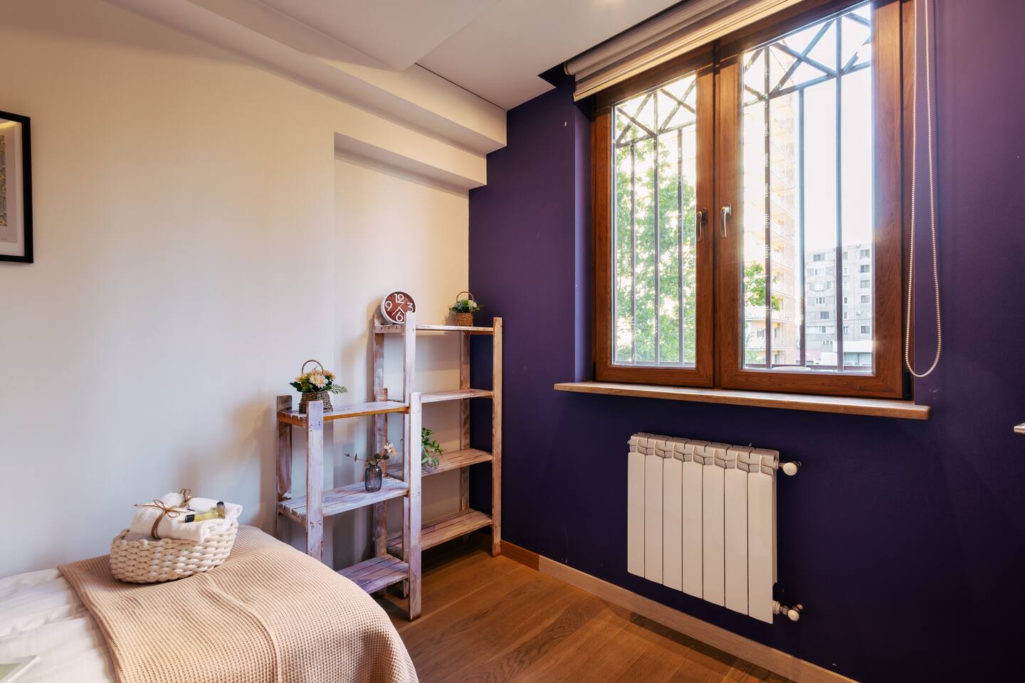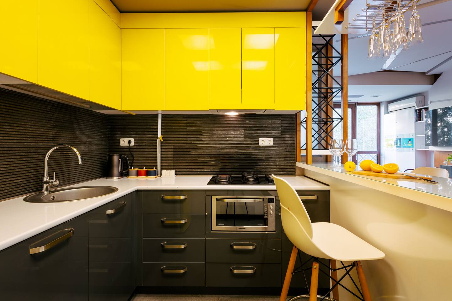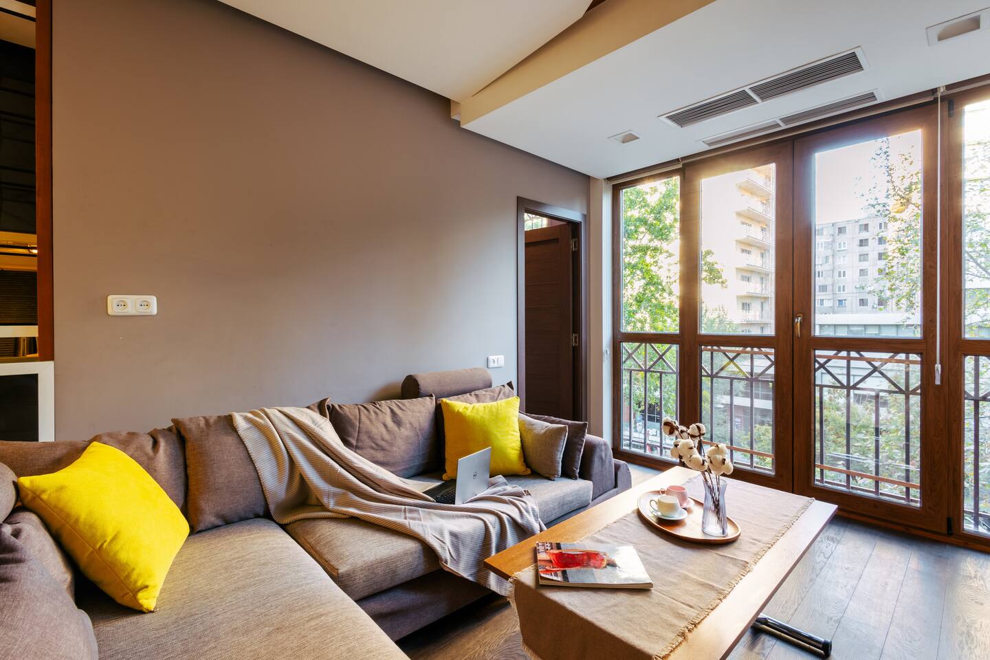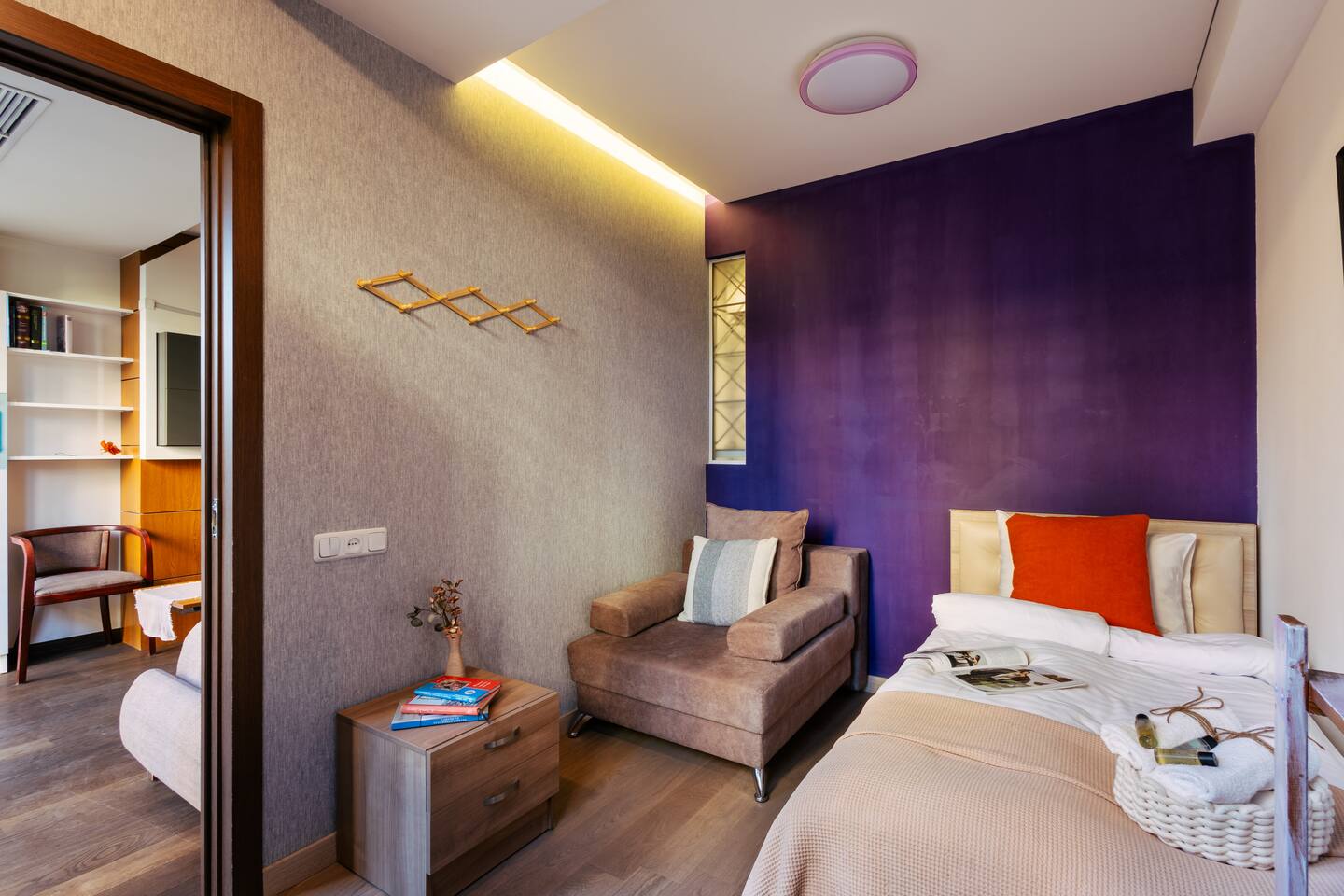 Welcome to Amber by Hotelise, a warm, inviting space in the heart of Yerevan’s vibrant center. Located at 10 Sayat Nova, this apartment combines a central location with a cozy peach and cream color scheme, just minutes from Swan Lake, the Opera Theatre, and Northern Avenue. With the city’s best cafes, art spots, and nightlife at your fingertips, Amber is the perfect base for exploring Yerevan. Living Room and Kitchen: Amber’s living area features a spacious L-shaped sofa, great for hanging out or watching TV, with an inviting French balcony that brings in natural light. The amber tones and wooden feature wall create a relaxed, warm atmosphere. The open kitchen is both functional and stylish, with cheerful yellow accents, a breakfast bar, and full amenities, including a dishwasher, microwave, kettle, and toaster. Bedroom 1: This room has a single bed and an armchair that opens up into an extra sleeping space. Roller blinds keep the light out when you need a quiet, restful sleep. Bedroom 2: A comfortable king-size bed with a quality mattress, top-to-bottom mirrored wardrobe, roller blinds, and a chest of drawers make this bedroom practical and inviting, with plenty of storage and tasteful decor. Bathroom: A full bathtub adds a rare touch of comfort, paired with high-quality tiles, strong water pressure, and a washing machine. There’s plenty of space for all your essentials. With its warm ambiance, central location, and thoughtful design, Amber offers a perfect blend of comfort and convenience for your Yerevan stay. At Hotelise, we’re committed to creating spaces that feel like home while adding a touch of style and charm.