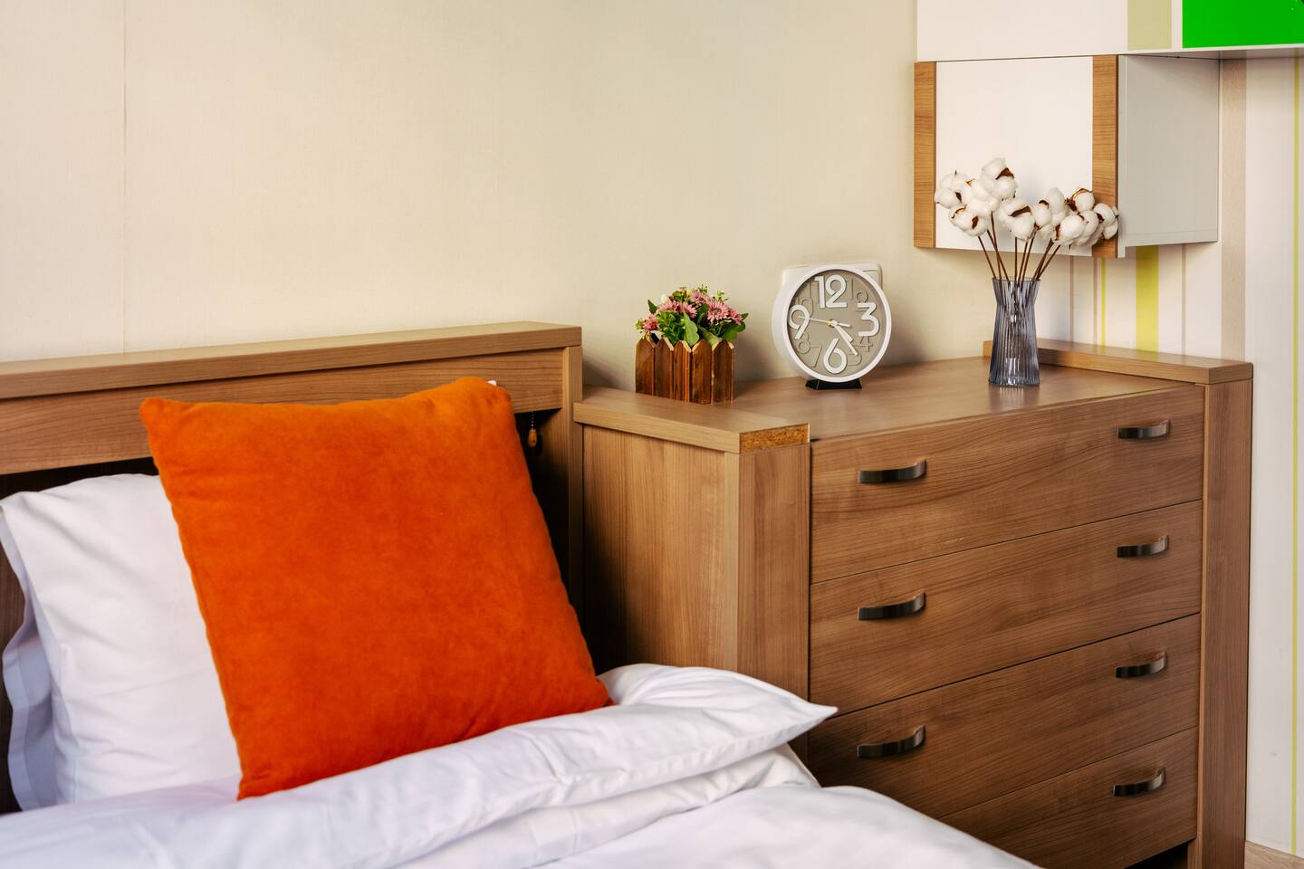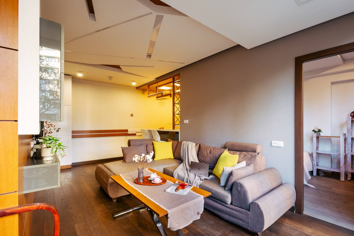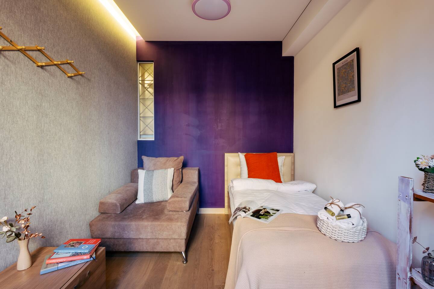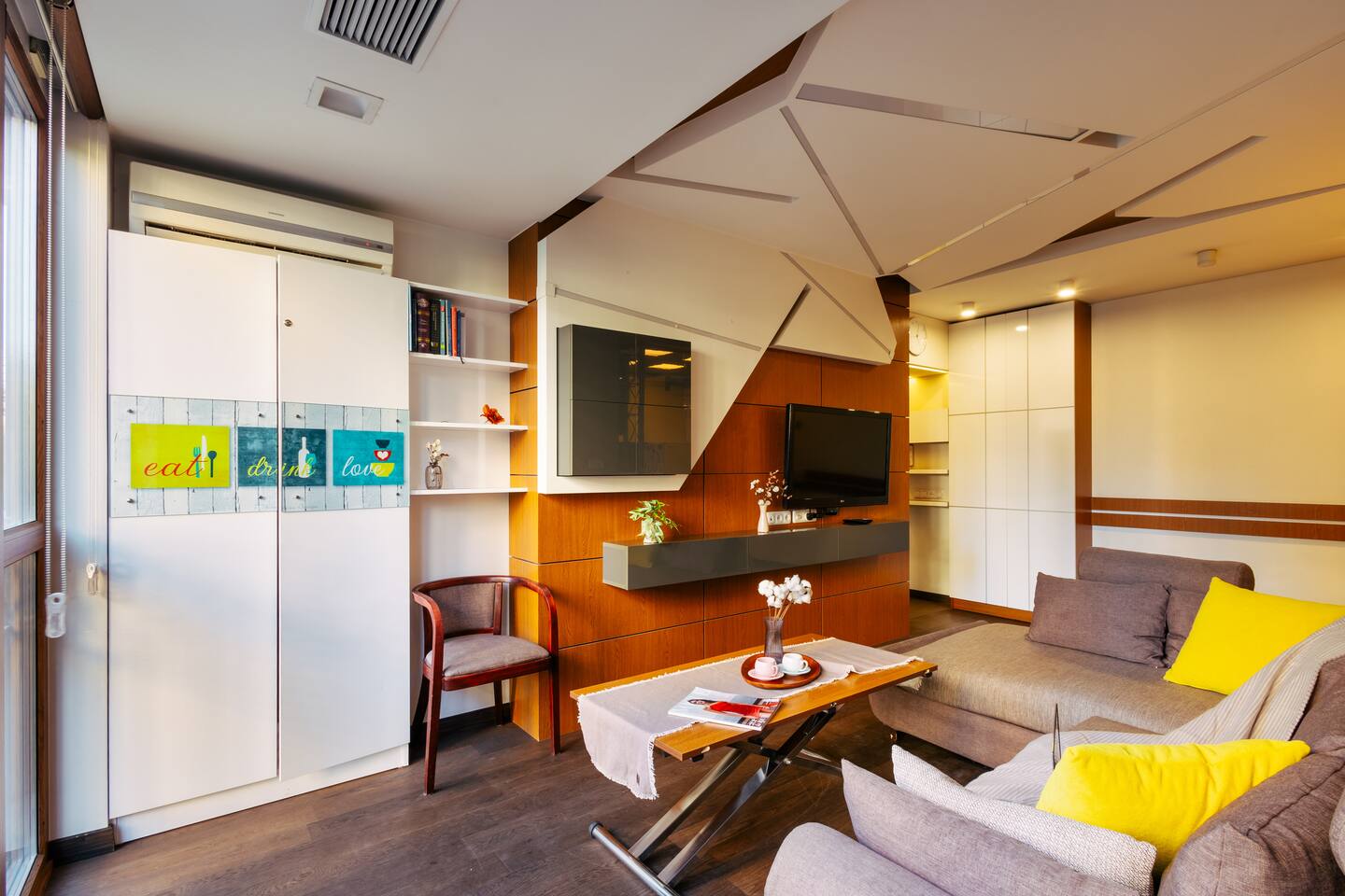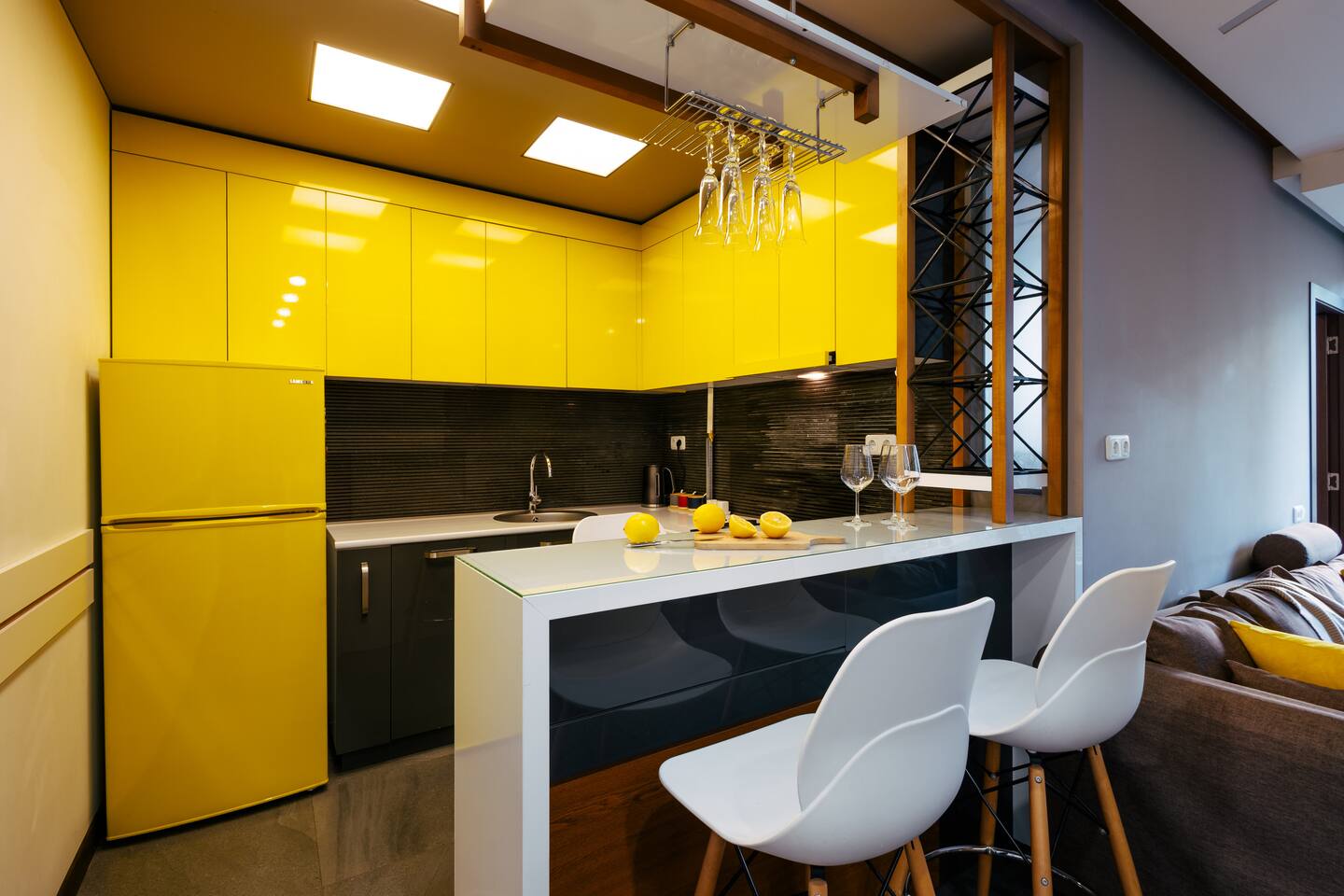 Welcome to Amber by Hotelise, a warm, inviting space in the heart of Yerevan’s vibrant center. Located at 10 Sayat Nova, this apartment combines a central location with a cozy peach and cream color scheme, just minutes from Swan Lake, the Opera Theatre, and Northern Avenue. With the city’s best cafes, art spots, and nightlife at your fingertips, Amber is the perfect base for exploring Yerevan. Living Room and Kitchen: Amber’s living area features a spacious L-shaped sofa, great for hanging out or watching TV, with an inviting French balcony that brings in natural light. The amber tones and wooden feature wall create a relaxed, warm atmosphere. The open kitchen is both functional and stylish, with cheerful yellow accents, a breakfast bar, and full amenities, including a dishwasher, microwave, kettle, and toaster. Bedroom 1: This room has a single bed and an armchair that opens up into an extra sleeping space. Roller blinds keep the light out when you need a quiet, restful sleep. Bedroom 2: A comfortable king-size bed with a quality mattress, top-to-bottom mirrored wardrobe, roller blinds, and a chest of drawers make this bedroom practical and inviting, with plenty of storage and tasteful decor. Bathroom: A full bathtub adds a rare touch of comfort, paired with high-quality tiles, strong water pressure, and a washing machine. There’s plenty of space for all your essentials. With its warm ambiance, central location, and thoughtful design, Amber offers a perfect blend of comfort and convenience for your Yerevan stay. At Hotelise, we’re committed to creating spaces that feel like home while adding a touch of style and charm.