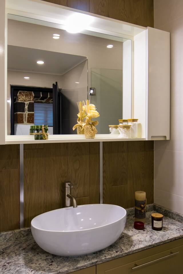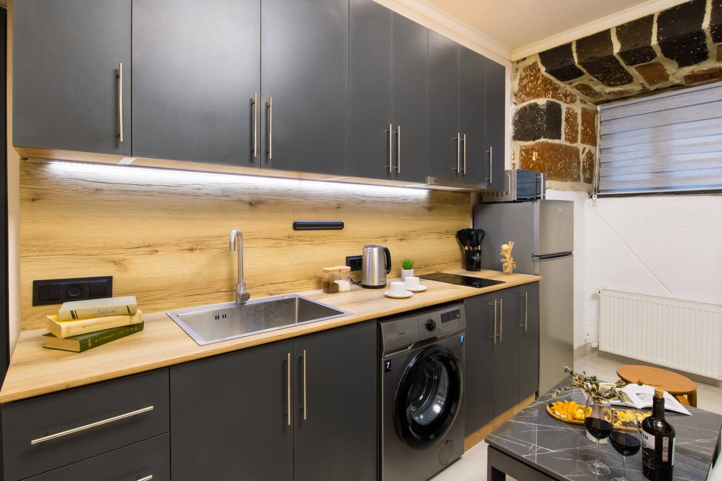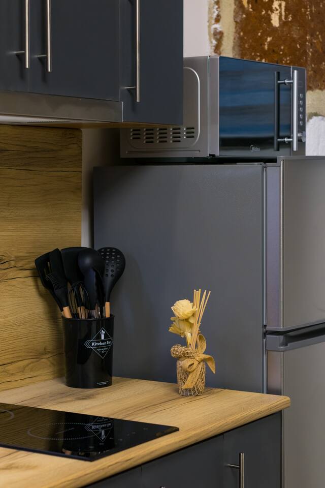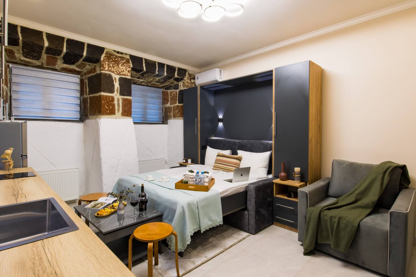 Welcome to "Aramis," one of the four uniquely designed apartments in the "The Musketeers" project, nestled in a rare Old Yerevan building made from black tuff. "Aramis," along with its counterparts "Porthos," "Athos," and "D'Artagnan," blends historical charm with modern luxury just a 2-minute walk from Saryan Street. Building: "Aramis" resides in a beautifully converted old Yerevan building, where the original black tuff exterior has been preserved, offering an authentic taste of the city's rich architectural heritage. Living Room and Kitchen: As you enter "Aramis," the fully equipped kitchen on your left includes ample storage, a stove, and a fridge. The left side of the room features three large windows, ushering in abundant natural light. The interior walls, showcasing the old tuff, create a unique atmosphere where old-world charm meets modern comfort and style. Bedroom: This area is furnished with a king-size bed with a premium mattress, a quaint sitting corner with a coffee table, and bedside tables with lamps, perfect for a relaxing read. Bathroom: The bathroom in "Aramis" is fitted with new premium tiles, an LED-lit mirror, a cabinet and vanity unit, and a high-quality shower offering excellent water pressure and premium taps. As with all Hotelise properties, we are delighted to provide organic and sustainable toiletries from GFL. "Aramis" is the smallest studio- apartment among those four promising a memorable stay in the heart of the city with its unique blend of Yerevan's historical architecture and contemporary comfort.