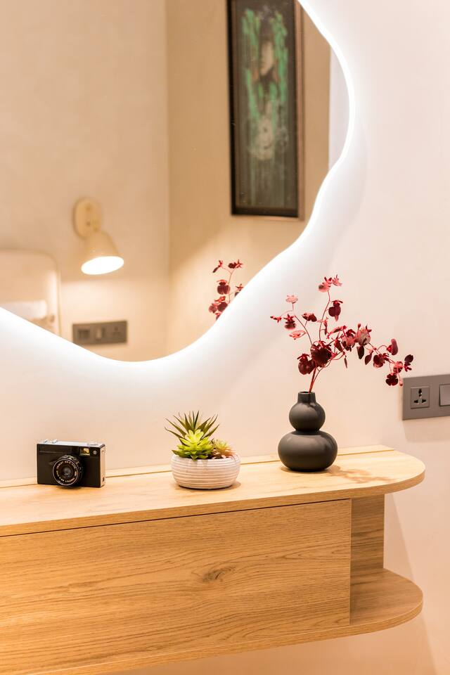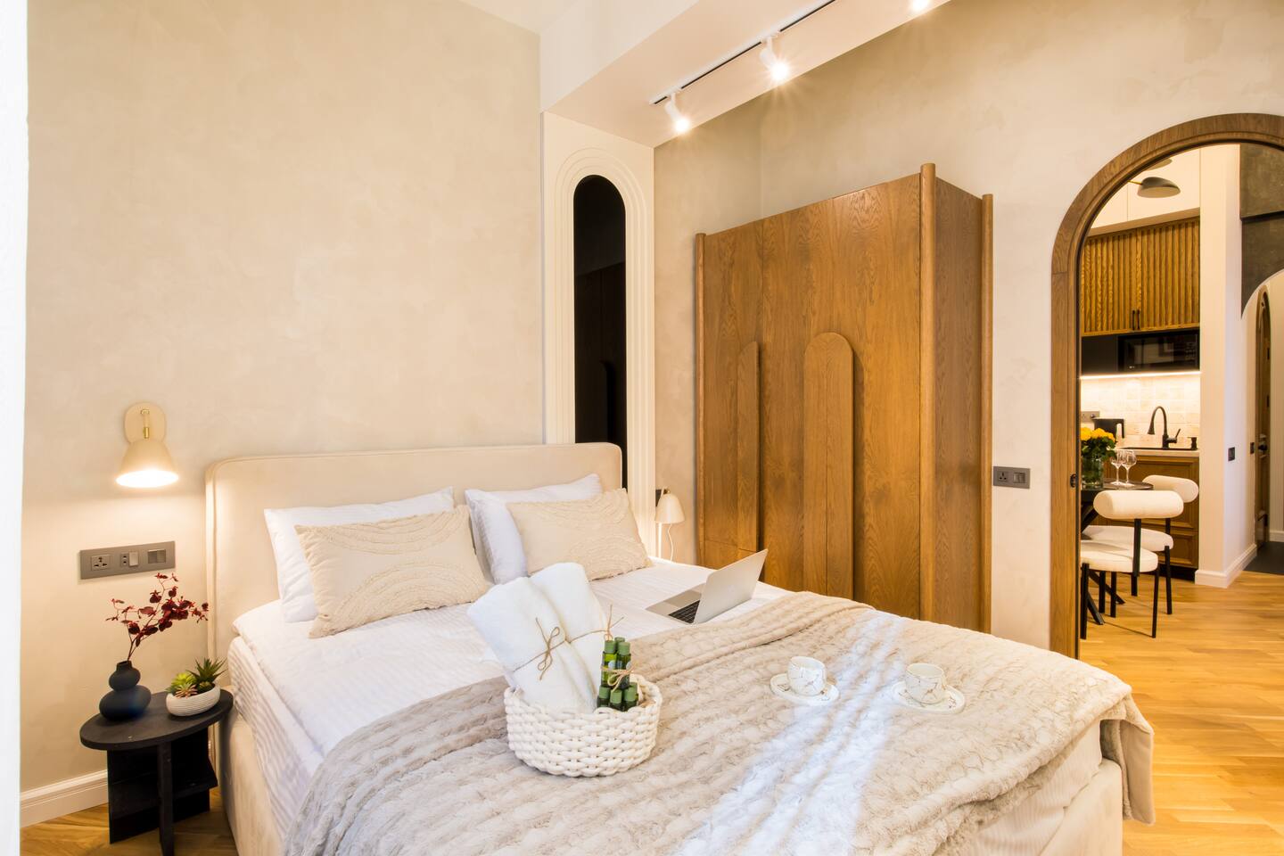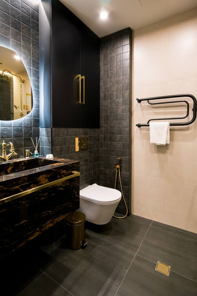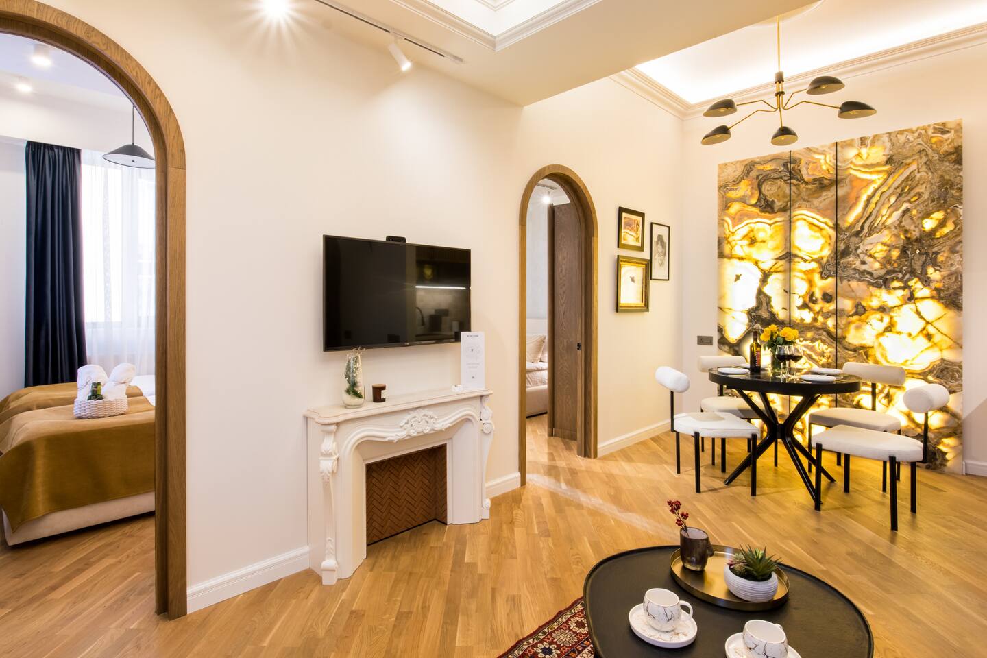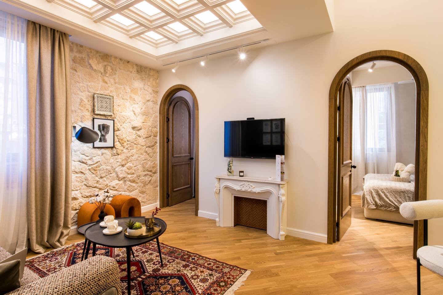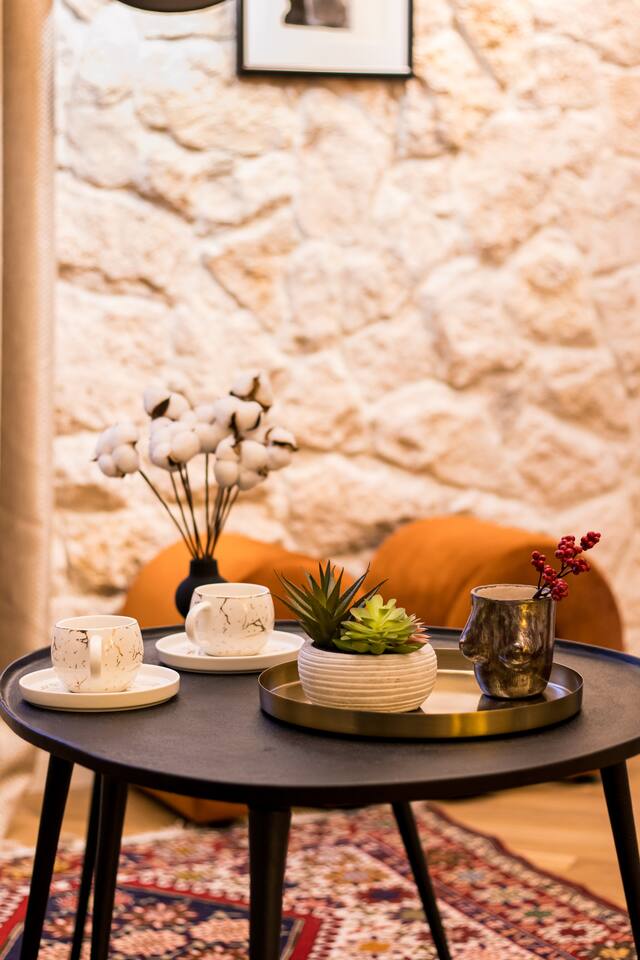 Welcome into the elegance of Arc & Stone, our award-winning project perched on the 6th floor at 61 Hanrapetutyan Street, Yerevan. This gem in the city combines modernity with a splash of Renaissance, all within a building that stands out as one of Yerevan's finest. Living Room: Step into the living room, a masterpiece of design where every detail has been thoughtfully chosen. A feature wall of natural stone and a cozy fireplace invite you to relax. The room is adorned with a custom handmade sofa, authentic Armenian carpet, exquisite wall art, and innovative lighting that complements the wooden and light-designed ceiling. For entertainment, enjoy a complimentary Netflix subscription, a standard perk across all Hotelise properties. This space seamlessly flows into an open-plan, fully equipped kitchen. Kitchen: The kitchen doesn't just serve; it delights. Equipped with a mini-fridge, dishwasher, microwave, stove, and ample storage. The dining area, designed for four, is both comfortable and stylish, making every meal a pleasure. Bedroom 1: Find sanctuary in a room where custom handcrafted wooden furniture meets luxury. The large wardrobe and LED-lit mirror enhance the space, while the premium mattress promises restful nights. Natural light floods in through the windows, highlighting the room's soothing color palette. Bedroom 2: This bedroom features two single beds, each crowned with artistic headboards, adding a touch of elegance. Custom-built wooden wardrobes with designer elements offer ample storage, ensuring that the room remains clutter-free and serene. Bathroom: The bathroom is a retreat in itself, featuring a spacious shower cabin, premium tiles, and an LED mirror. The top-notch shower system, taps, and toilet imported from Germany assure quality and style. The retro-style shower set adds a classic touch to the modern amenities. Arc & Stone isn't just a place to live; it's a lifestyle choice for those who value design, comfort, and a touch of history in their daily lives. Welcome to your new home, where every detail is a testament to luxury and craftsmanship.
