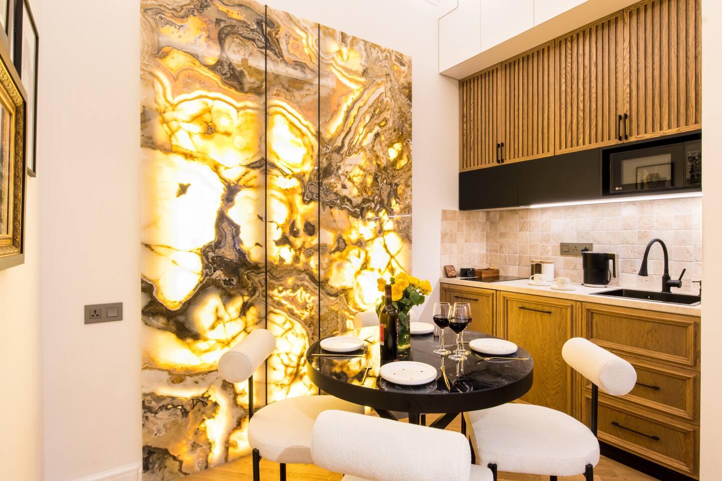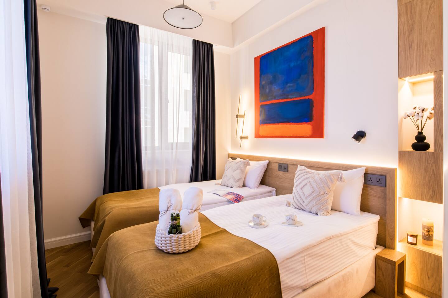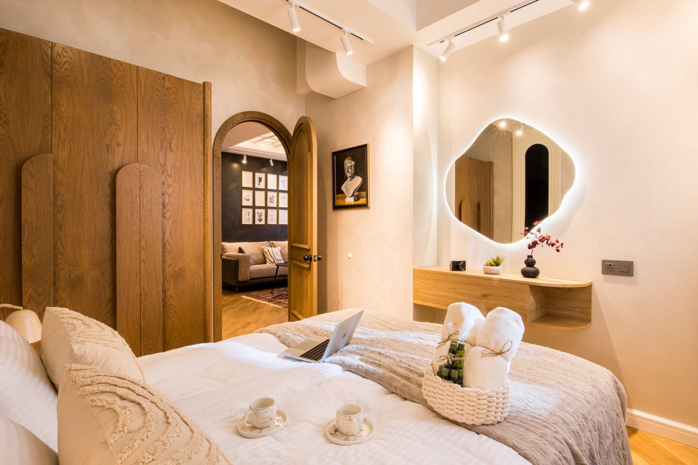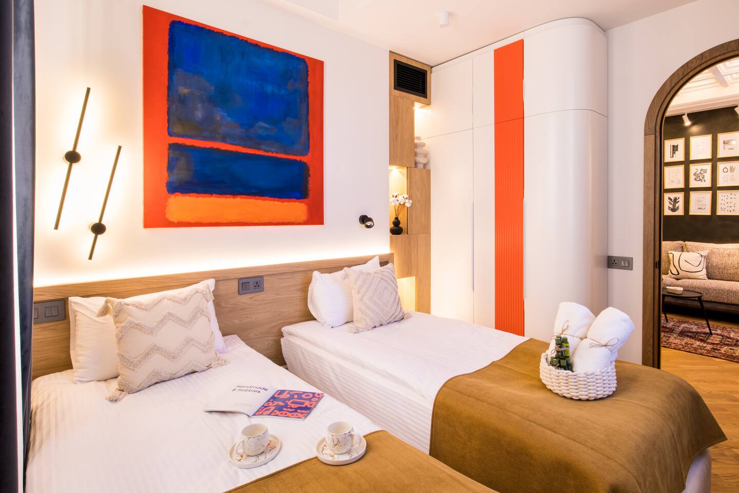 Welcome into the elegance of Arc & Stone, our award-winning project perched on the 6th floor at 61 Hanrapetutyan Street, Yerevan. This gem in the city combines modernity with a splash of Renaissance, all within a building that stands out as one of Yerevan's finest. Living Room: Step into the living room, a masterpiece of design where every detail has been thoughtfully chosen. A feature wall of natural stone and a cozy fireplace invite you to relax. The room is adorned with a custom handmade sofa, authentic Armenian carpet, exquisite wall art, and innovative lighting that complements the wooden and light-designed ceiling. For entertainment, enjoy a complimentary Netflix subscription, a standard perk across all Hotelise properties. This space seamlessly flows into an open-plan, fully equipped kitchen. Kitchen: The kitchen doesn't just serve; it delights. Equipped with a mini-fridge, dishwasher, microwave, stove, and ample storage. The dining area, designed for four, is both comfortable and stylish, making every meal a pleasure. Bedroom 1: Find sanctuary in a room where custom handcrafted wooden furniture meets luxury. The large wardrobe and LED-lit mirror enhance the space, while the premium mattress promises restful nights. Natural light floods in through the windows, highlighting the room's soothing color palette. Bedroom 2: This bedroom features two single beds, each crowned with artistic headboards, adding a touch of elegance. Custom-built wooden wardrobes with designer elements offer ample storage, ensuring that the room remains clutter-free and serene. Bathroom: The bathroom is a retreat in itself, featuring a spacious shower cabin, premium tiles, and an LED mirror. The top-notch shower system, taps, and toilet imported from Germany assure quality and style. The retro-style shower set adds a classic touch to the modern amenities. Arc & Stone isn't just a place to live; it's a lifestyle choice for those who value design, comfort, and a touch of history in their daily lives. Welcome to your new home, where every detail is a testament to luxury and craftsmanship.