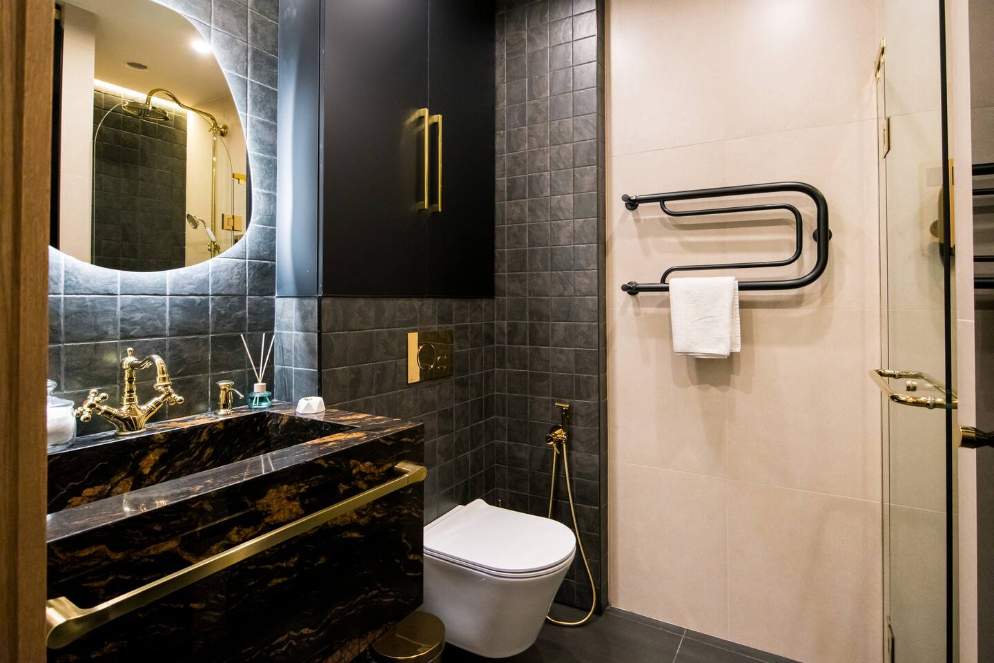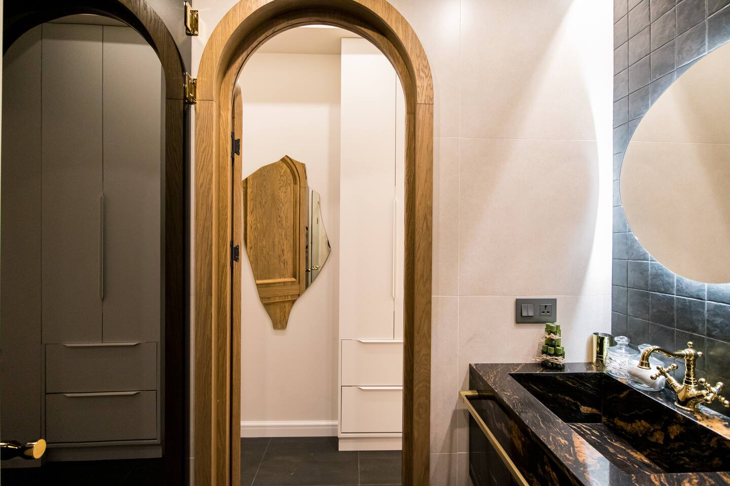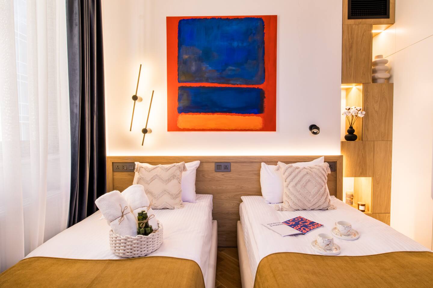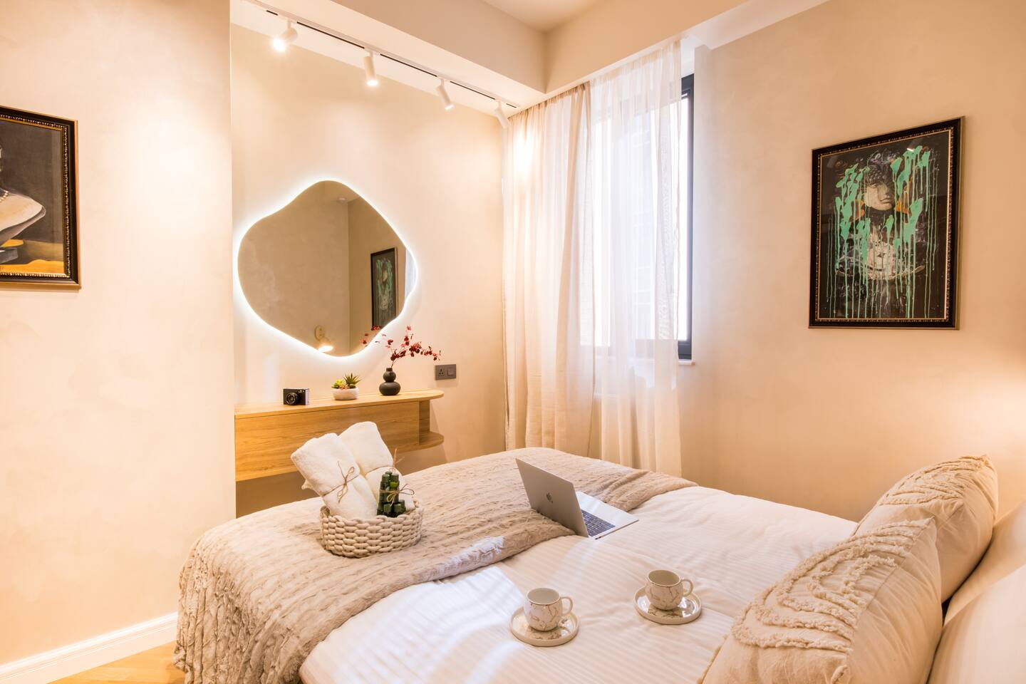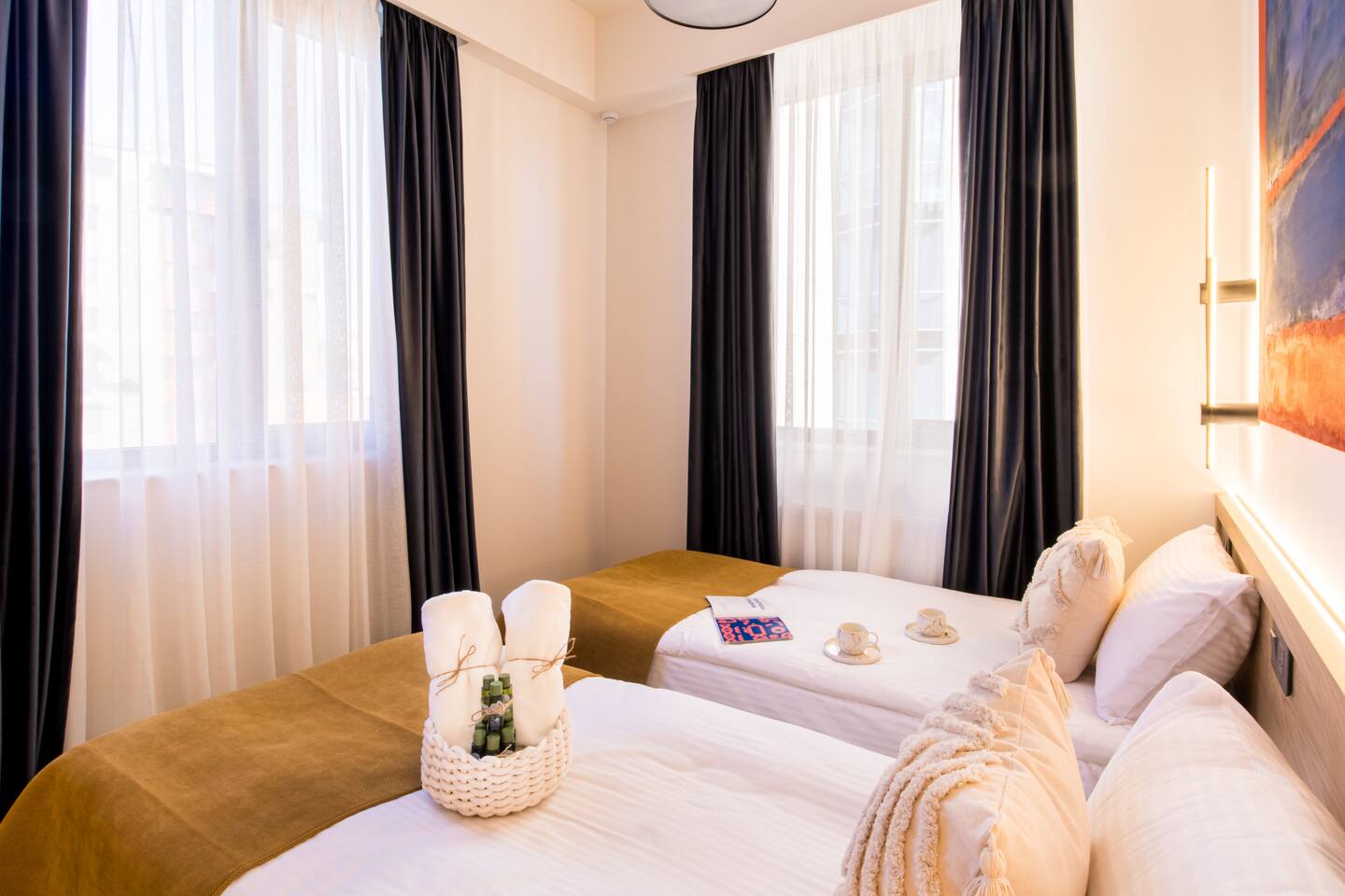 Welcome into the elegance of Arc & Stone, our award-winning project perched on the 6th floor at 61 Hanrapetutyan Street, Yerevan. This gem in the city combines modernity with a splash of Renaissance, all within a building that stands out as one of Yerevan's finest. Living Room: Step into the living room, a masterpiece of design where every detail has been thoughtfully chosen. A feature wall of natural stone and a cozy fireplace invite you to relax. The room is adorned with a custom handmade sofa, authentic Armenian carpet, exquisite wall art, and innovative lighting that complements the wooden and light-designed ceiling. For entertainment, enjoy a complimentary Netflix subscription, a standard perk across all Hotelise properties. This space seamlessly flows into an open-plan, fully equipped kitchen. Kitchen: The kitchen doesn't just serve; it delights. Equipped with a mini-fridge, dishwasher, microwave, stove, and ample storage. The dining area, designed for four, is both comfortable and stylish, making every meal a pleasure. Bedroom 1: Find sanctuary in a room where custom handcrafted wooden furniture meets luxury. The large wardrobe and LED-lit mirror enhance the space, while the premium mattress promises restful nights. Natural light floods in through the windows, highlighting the room's soothing color palette. Bedroom 2: This bedroom features two single beds, each crowned with artistic headboards, adding a touch of elegance. Custom-built wooden wardrobes with designer elements offer ample storage, ensuring that the room remains clutter-free and serene. Bathroom: The bathroom is a retreat in itself, featuring a spacious shower cabin, premium tiles, and an LED mirror. The top-notch shower system, taps, and toilet imported from Germany assure quality and style. The retro-style shower set adds a classic touch to the modern amenities. Arc & Stone isn't just a place to live; it's a lifestyle choice for those who value design, comfort, and a touch of history in their daily lives. Welcome to your new home, where every detail is a testament to luxury and craftsmanship.