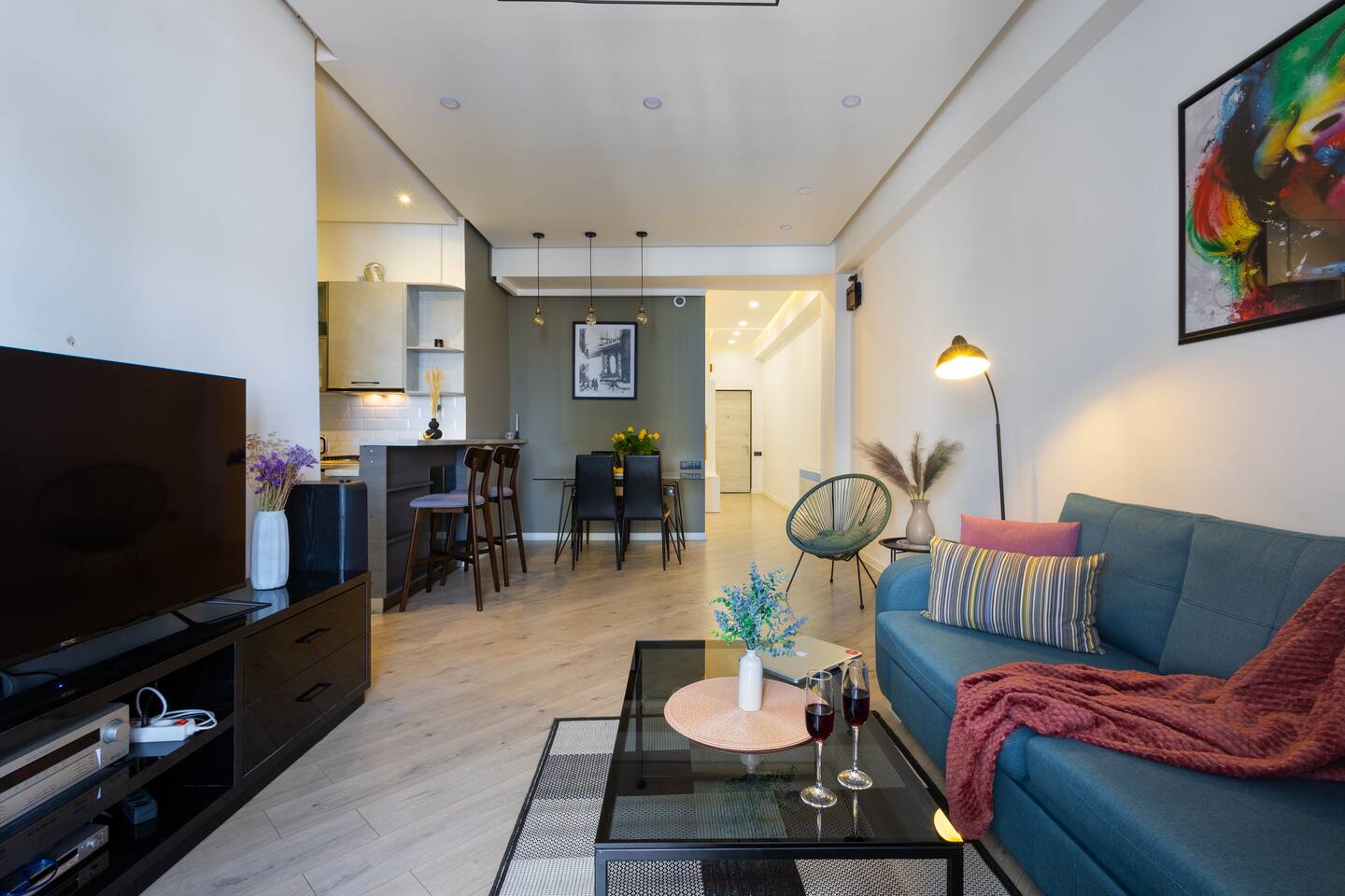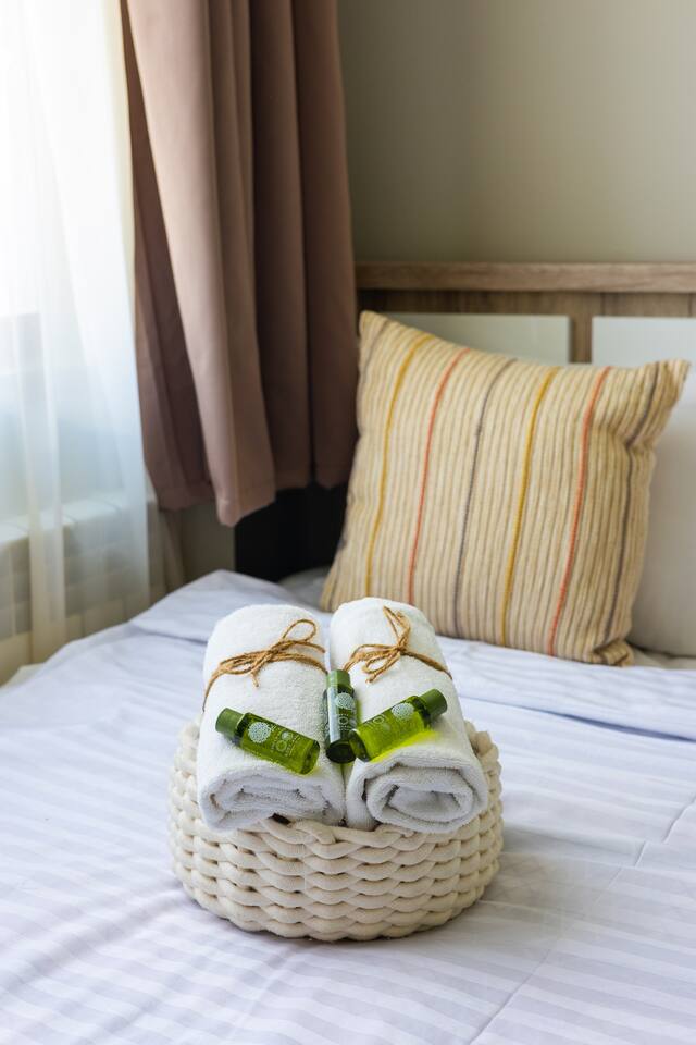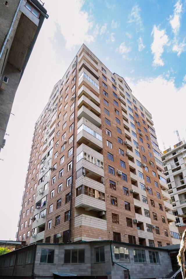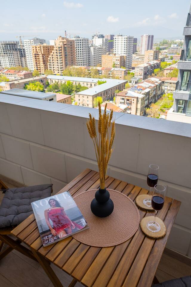 Welcome to Bluva by Hotelise – Sky-High Comfort with a View to Remember Location: Perched on the 15th floor of a brand-new building at 59/7 Komitas Avenue, Bluva offers both convenience and elevation. Located in one of Yerevan’s most connected neighborhoods, the apartment features a private balcony with sweeping views — the perfect backdrop for your morning coffee or golden-hour wine. Living Room & Kitchen: The living space is modern, cozy, and full of personality. A stylish blue TV unit, framed artwork, side-shade lighting, and a soft rug make the room warm and inviting. Relax on the comfy seating while watching your favorite shows on the large Smart TV with local channels. The open-plan kitchen is fully equipped with everything you need — a large fridge, oven, microwave, brick tile backsplash, and plenty of storage. A breakfast bar with seating makes casual dining effortless. AC keeps the whole space cool and comfortable. Bedroom: The bedroom features a 150x200 premium mattress on a modern bed frame, with large wardrobes, a chest of drawers, and a cozy rug underfoot. Designed for comfort, the room offers ample storage and a restful vibe — whether for a short stay or longer retreat. Bathroom: Crisp and clean, the bathroom includes new tiling, a walk-in shower cabin with great pressure, and a vanity unit with mirror and storage. Everything you need for a refreshing and functional stay. Balcony: One of Bluva’s crown jewels — the spacious balcony is furnished for lounging and offers incredible panoramic views. Whether it’s sunrise or late-night city lights, this spot is made for unforgettable moments. At Hotelise, we believe in curating spaces where comfort meets character. Bluva isn’t just a place to stay — it’s where your Yerevan story begins, 15 floors above it all.