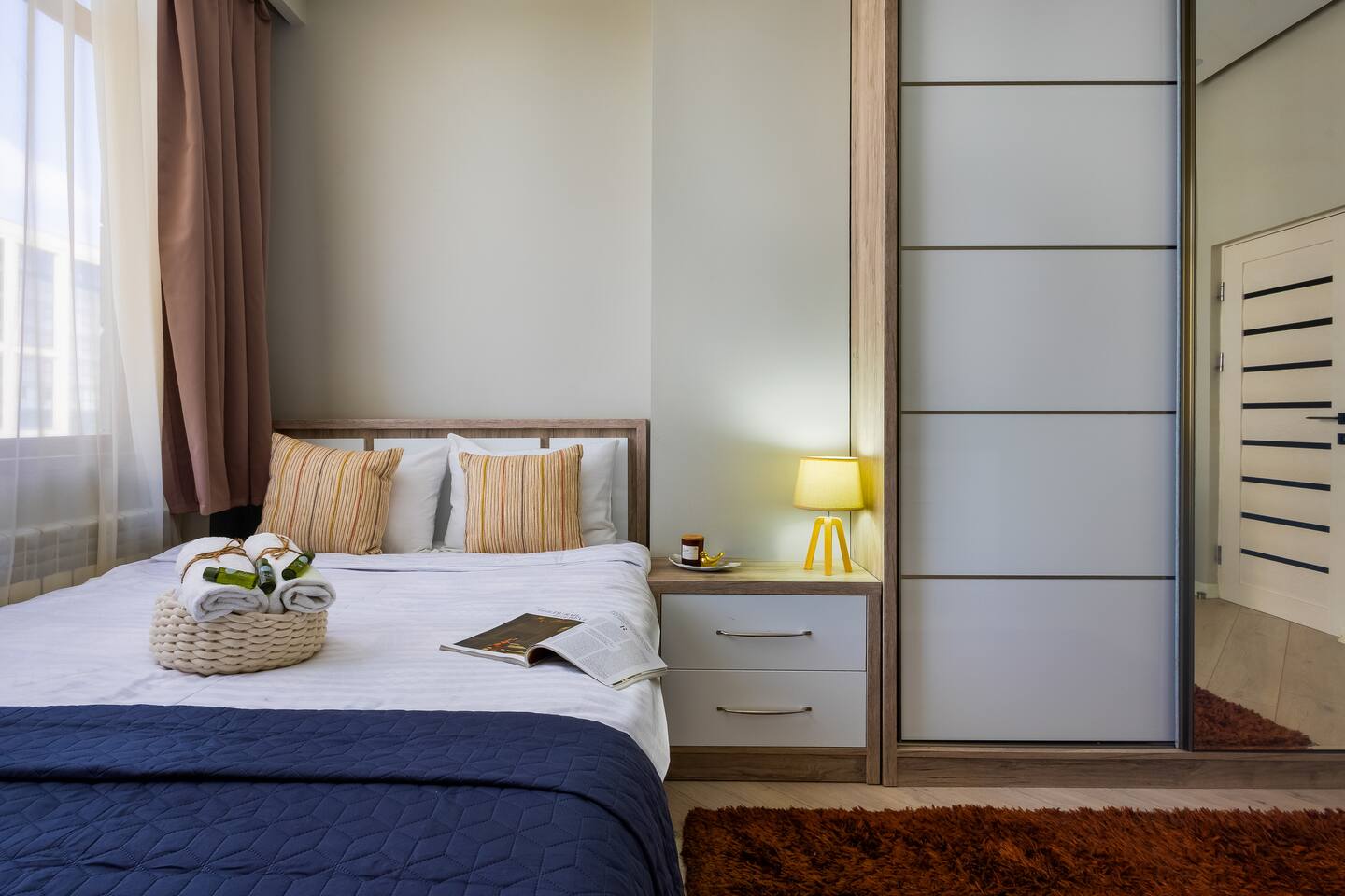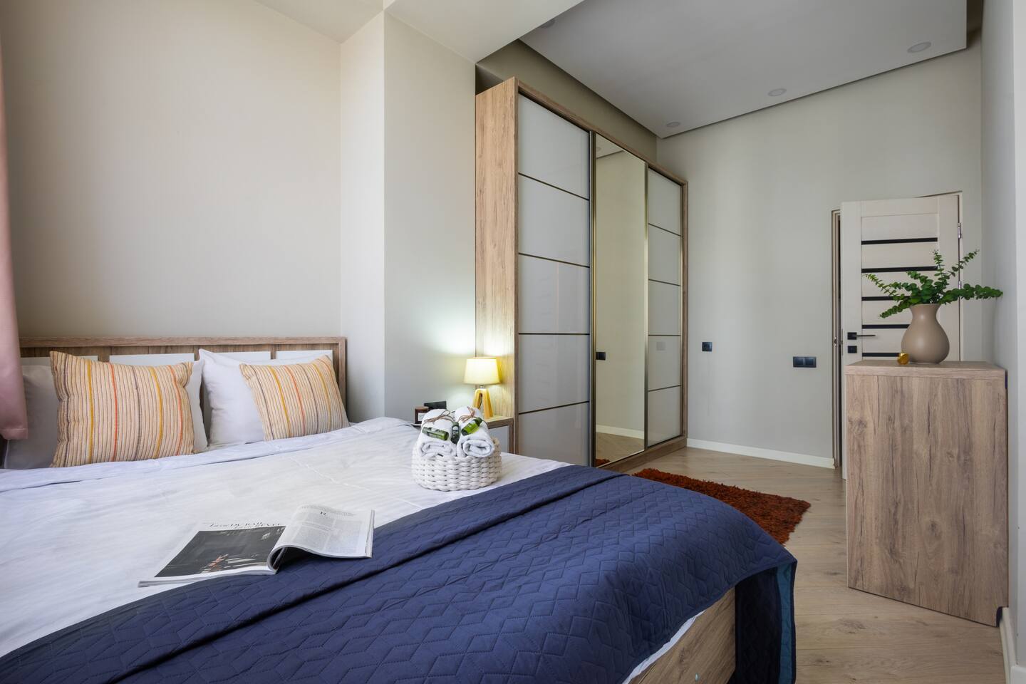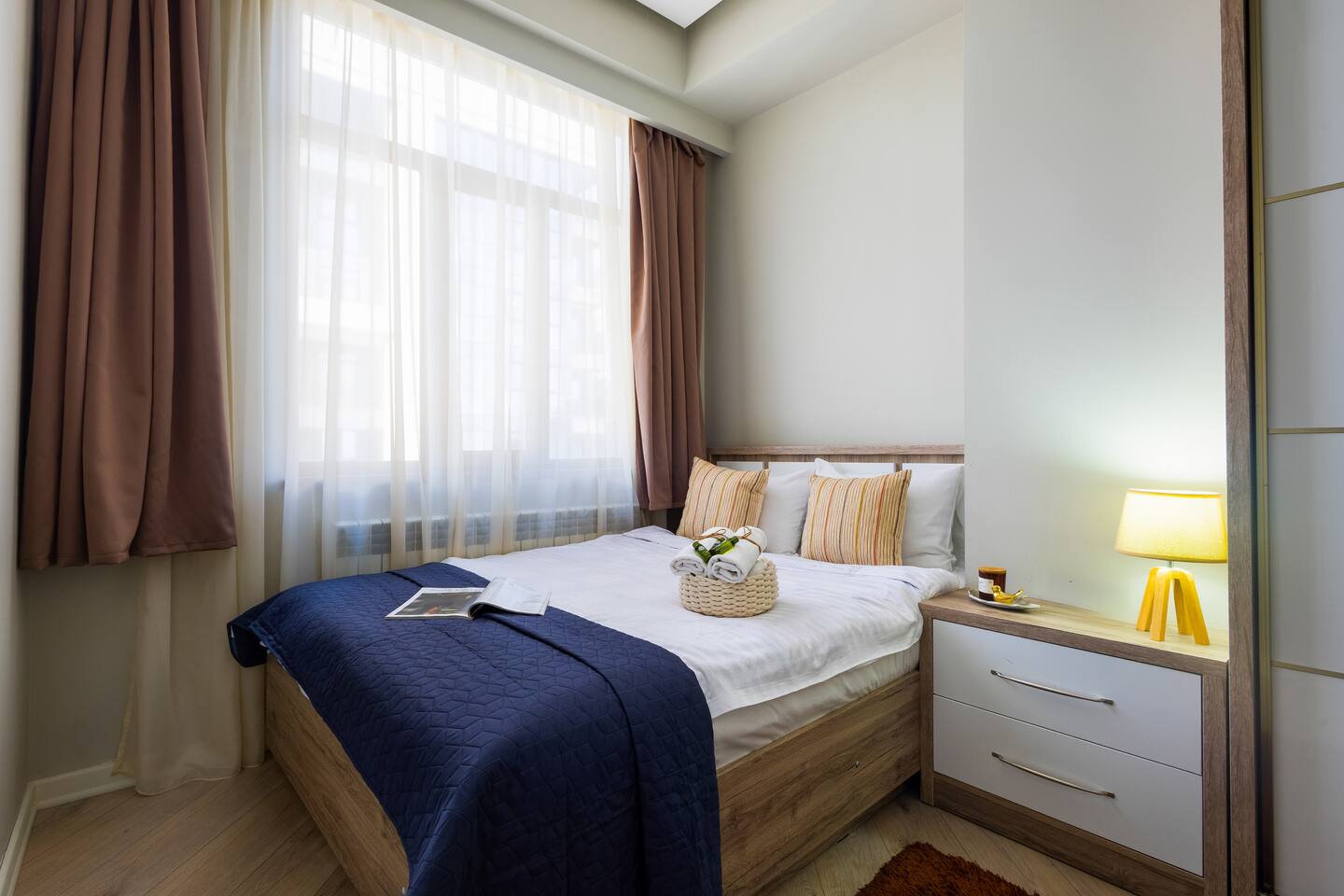 Welcome to Bluva by Hotelise – Sky-High Comfort with a View to Remember Location: Perched on the 15th floor of a brand-new building at 59/7 Komitas Avenue, Bluva offers both convenience and elevation. Located in one of Yerevan’s most connected neighborhoods, the apartment features a private balcony with sweeping views — the perfect backdrop for your morning coffee or golden-hour wine. Living Room & Kitchen: The living space is modern, cozy, and full of personality. A stylish blue TV unit, framed artwork, side-shade lighting, and a soft rug make the room warm and inviting. Relax on the comfy seating while watching your favorite shows on the large Smart TV with local channels. The open-plan kitchen is fully equipped with everything you need — a large fridge, oven, microwave, brick tile backsplash, and plenty of storage. A breakfast bar with seating makes casual dining effortless. AC keeps the whole space cool and comfortable. Bedroom: The bedroom features a 150x200 premium mattress on a modern bed frame, with large wardrobes, a chest of drawers, and a cozy rug underfoot. Designed for comfort, the room offers ample storage and a restful vibe — whether for a short stay or longer retreat. Bathroom: Crisp and clean, the bathroom includes new tiling, a walk-in shower cabin with great pressure, and a vanity unit with mirror and storage. Everything you need for a refreshing and functional stay. Balcony: One of Bluva’s crown jewels — the spacious balcony is furnished for lounging and offers incredible panoramic views. Whether it’s sunrise or late-night city lights, this spot is made for unforgettable moments. At Hotelise, we believe in curating spaces where comfort meets character. Bluva isn’t just a place to stay — it’s where your Yerevan story begins, 15 floors above it all.