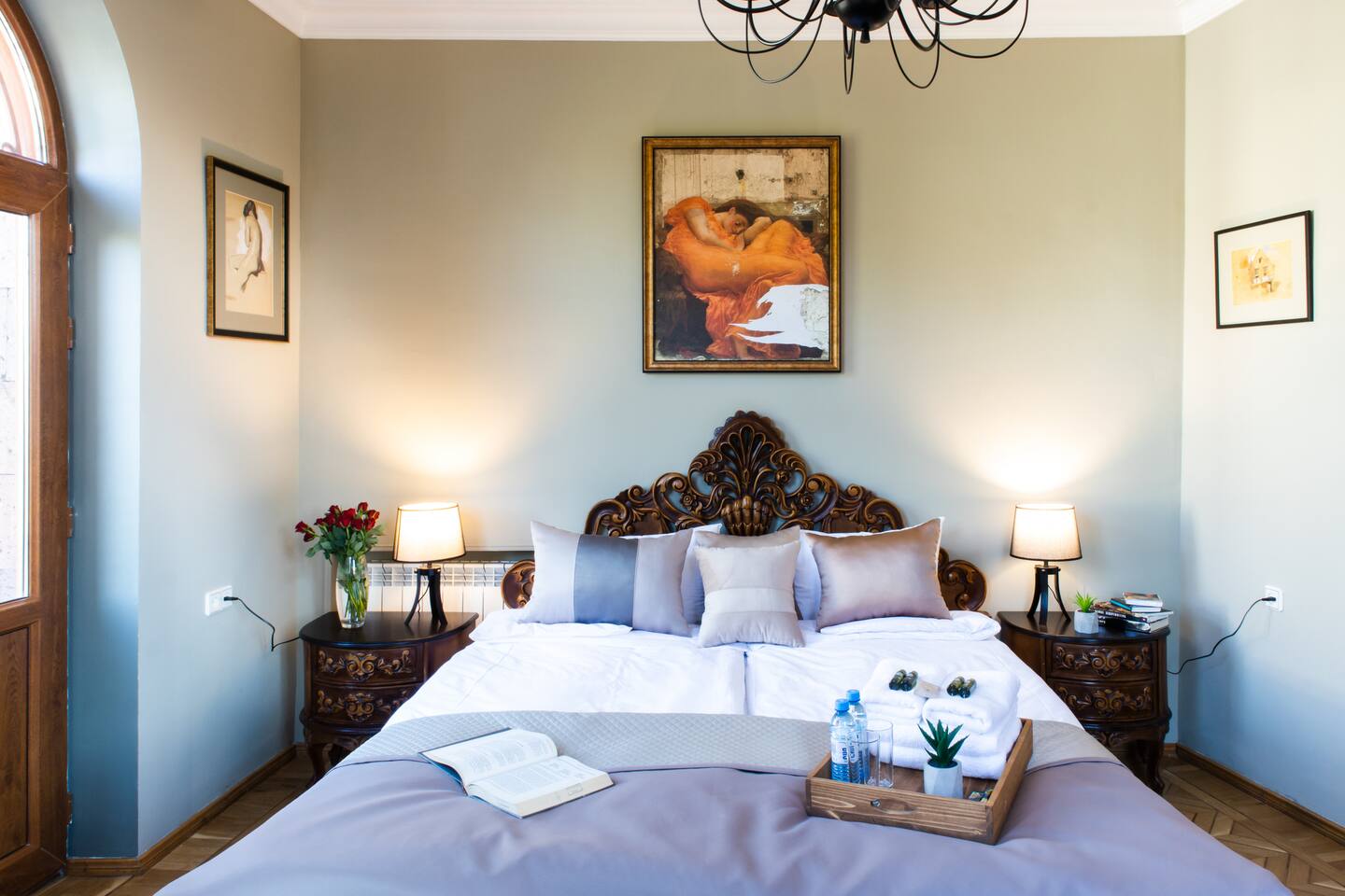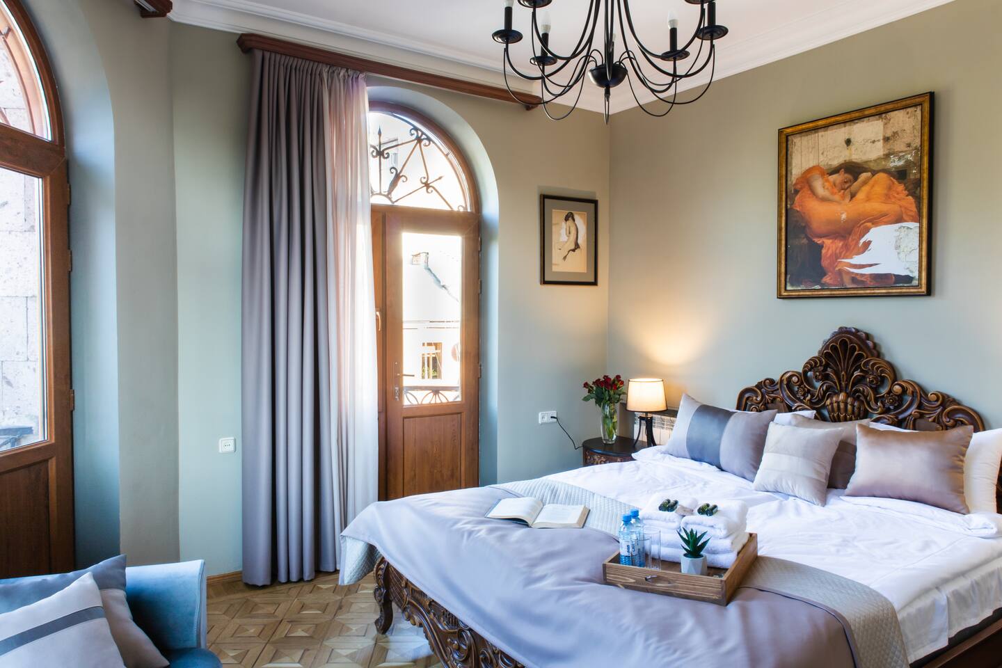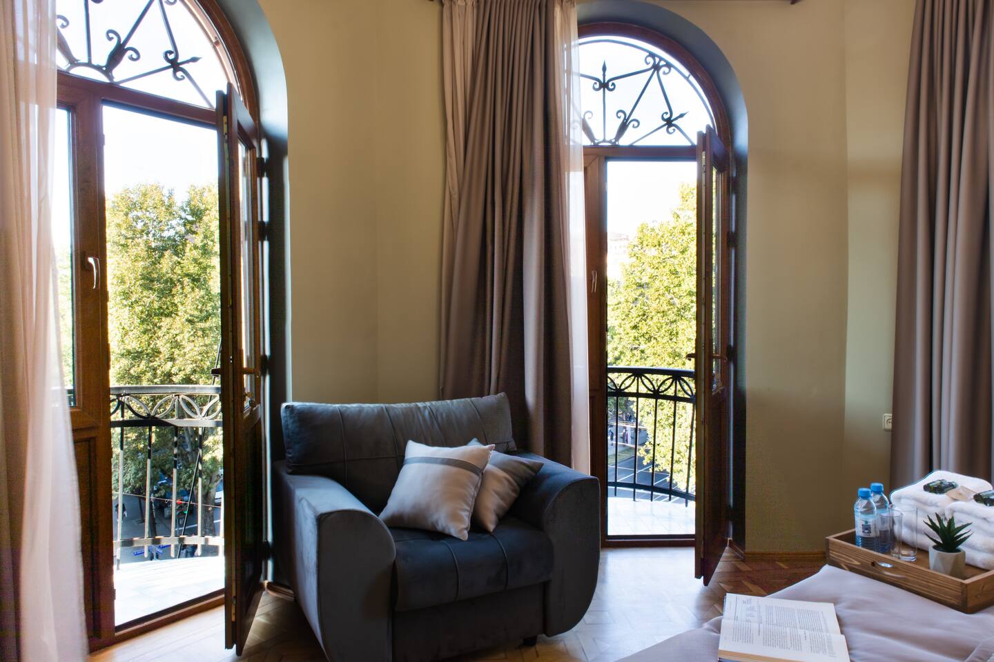 The apartment is the home of a renowned interior designer so not a detail has been missed for your absolute comfort. The property is located on a top floor of a historical building, on the mashots street. Saryan street is accessed within a minutes walk. The flat also offers a balcony overlooking Saryan, Mashtots and Khorenatsi streets. The property boasts one main sitting room, and 1 luxurious deco-style double bedroom, one full bathroom, a spacious hallway and balconies to die for. The WiFi speed is around 100 MB with Free Netflix Account. Connection to the system to listen to your own music also available. The living room is bright & airy, spacious in size and elegant in style. The dining area can seat up to 4 guests. The master bedroom is furnished with a super king-size bed. Bathroom essentials are provided, including toiletries, towels and a hairdryer. The property offers three different balconies with amazing views! We are pleased to offer hotel-standard hospitality services and provide hotel-quality linen & towels, bathroom essentials and professional cleaning services. A cot is available upon request.