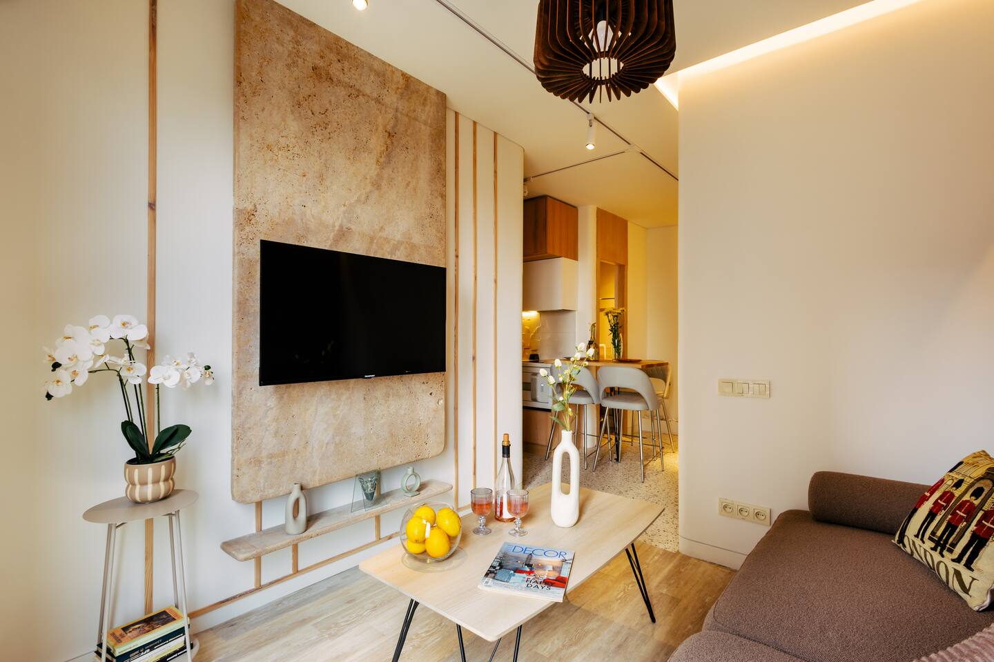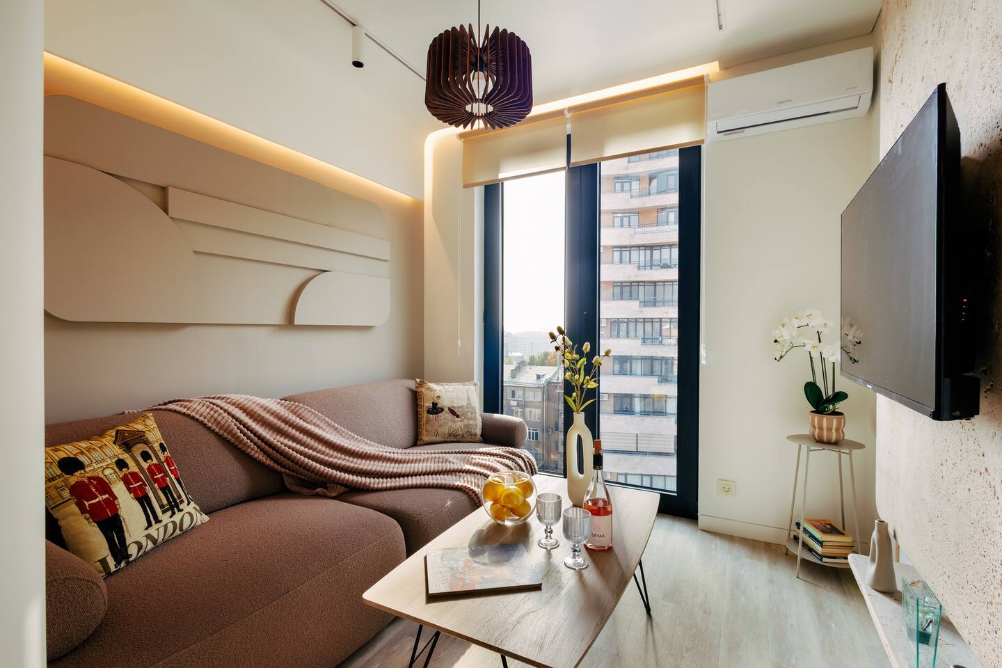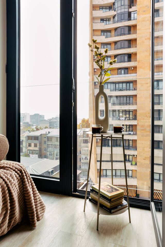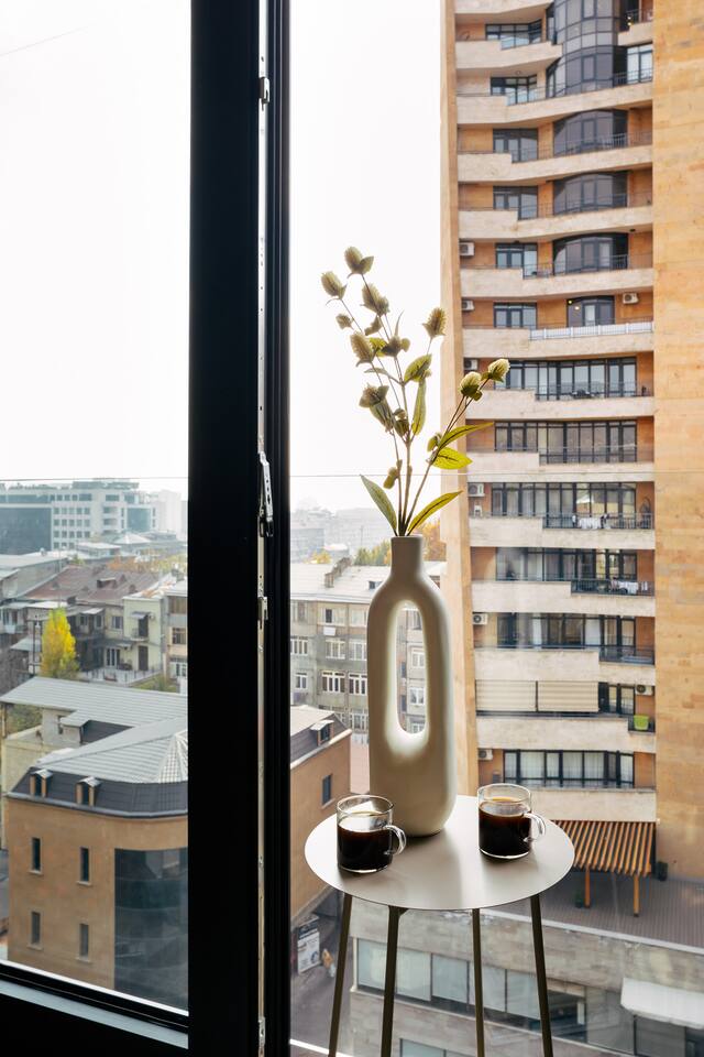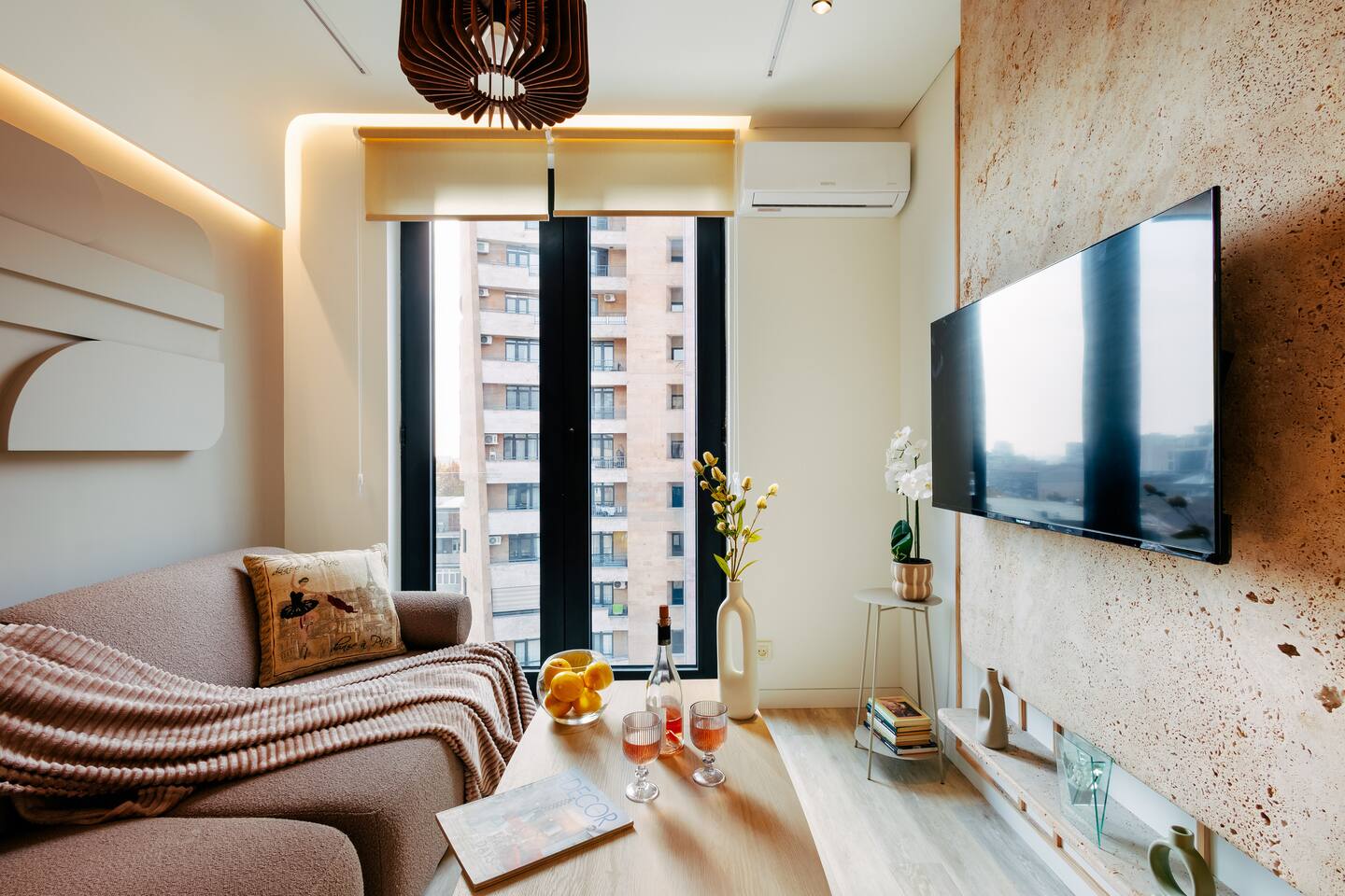 Welcome to "Cortado" by Hotelise – A Designer's Vision Brought to Life. "Cortado" isn’t just another place to stay; it’s a personal creation by a renowned designer and architect who has thoughtfully crafted every detail. From the colors to the textures, every corner reflects their vision, making this space feel like a true home with unique character. This is one of three neighboring properties, alongside Latte and Frappe, all designed to deliver a one-of-a-kind Airbnb experience. Perfect for individual stays or group bookings, each apartment offers its own distinct charm while sharing the same dedication to comfort and style. Location: Nestled just behind Ani Hotel on Sayat Nova Street, "Cortado" boasts an unbeatable location in Yerevan. Minutes from Swan Lake and Northern Avenue, yet tucked into a peaceful neighborhood, it offers the best of both worlds: city vibrancy and quiet retreat. Living Room and Kitchen: The living area is bathed in natural light through floor-to-ceiling windows, featuring soft cream tones, natural wood accents, and versatile lighting to match your mood—from bright mornings to cozy evenings. Relax on the comfortable sofa with a Smart TV and enjoy the city view from the French balcony. The compact, fully-equipped kitchen includes ample storage, a fridge, microwave, electric stove, and eye-catching backsplash. It’s designed for practicality and enjoyment, whether you’re cooking a full meal or just making coffee. Bedroom: The bedroom invites you to unwind with a plush king-sized bed, a premium mattress, and a striking feature wall. Soft ambient lighting and a large window create a serene atmosphere, while air conditioning ensures comfort throughout your stay. Bathroom: The premium bathroom is designed with elegant tiles, a sleek shower cabin, and high-end fittings. From the water pressure to the finer details, every element ensures a luxurious experience. At Hotelise, we create more than just places to stay; we craft memories. "Cortado" is your chance to experience thoughtful design, curated comfort, and the warmth of a space made with care. Book your stay and discover the difference for yourself.