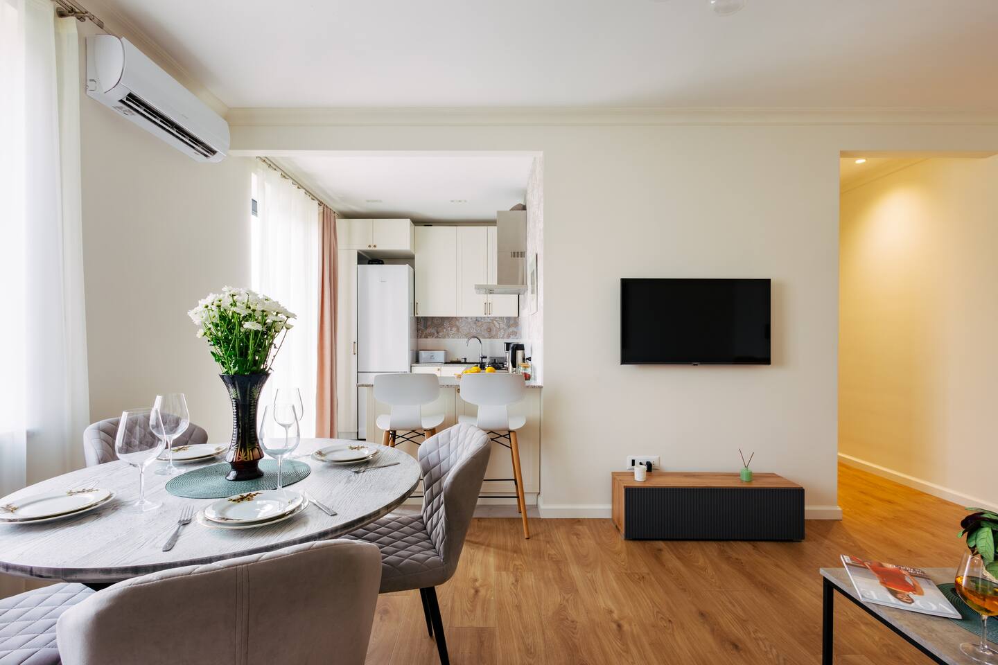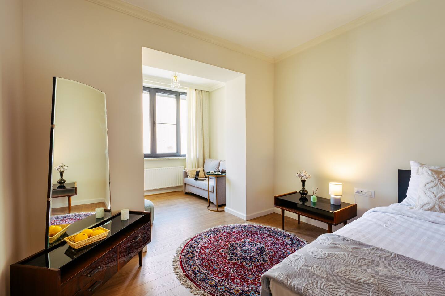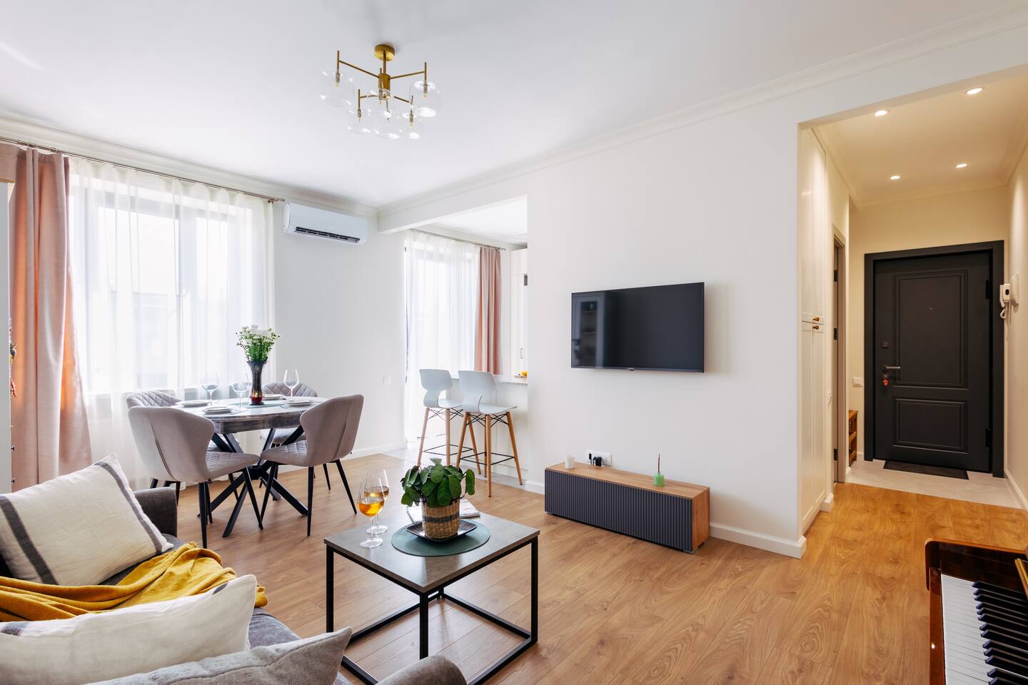 Welcome to "Eclate" by Hotelise – An Airy, Eclectic Blend of Style and Comfort "Eclate" is a spacious and beautifully airy one-bedroom apartment, designed with an eclectic mix of old and new styles. The tasteful combination of vintage and modern furniture gives this space its unique charm, creating an inviting atmosphere perfect for those who appreciate thoughtful design. Location: Situated in the Komitas area, one of Yerevan’s most developed neighborhoods outside the city center, "Eclate" offers the perfect balance between accessibility and tranquility. Parks, supermarkets, entertainment, and everything you need are just steps away, while the bustling city center is only a 7-minute taxi ride. For those who want to enjoy the vibrancy of Yerevan without staying in the noisy heart of the city, Komitas provides the perfect compromise. Living Room: As you step inside, you’re greeted by a charming piano to the left, setting the tone for this eclectic home. The living room features a cozy sofa facing a large smart TV, a stylish coffee table, and a round dining table for four. The room is airy, with large windows that flood the space with natural light, and A/C to keep the temperature just right. Kitchen: The separate kitchen offers plenty of storage and worktop space, perfect for those who love to cook. It’s equipped with everything you need, including an oven, washer, fridge, kettle, coffee maker, microwave, extractor, and stove. The breakfast bar, complete with two bar stools, is the perfect spot for a quick meal or a relaxed breakfast. The kitchen also opens up to the balcony through floor-to-ceiling doors and windows, creating an uplifting vibe during breakfast or coffee time. Balcony: The balcony faces Komitas Avenue, offering the perfect spot for morning coffee or an evening glass of wine. Despite its central location, the high-quality doors and windows ensure excellent noise insulation, making it a peaceful retreat from the city buzz. Bedroom: The bedroom is designed for both style and comfort, featuring a king-size bed with a premium mattress, side table, and plenty of storage with a fitted wardrobe. A full-size mirror adds to the room’s spacious feel. An extension of the bedroom offers a sofa bed, perfect for additional guests or a cozy lounging space. Bathroom: The newly refurbished bathroom features beautiful tiles and a high-quality shower set with excellent water pressure. It’s equipped with a mirror, under-sink storage, and everything you need for a comfortable stay in one of the most important parts of any home. At Hotelise, we pride ourselves on offering more than just a place to stay – we create spaces that feel like home. "Eclate" is no exception, providing a blend of elegance and comfort that’s perfect for making lasting memories.