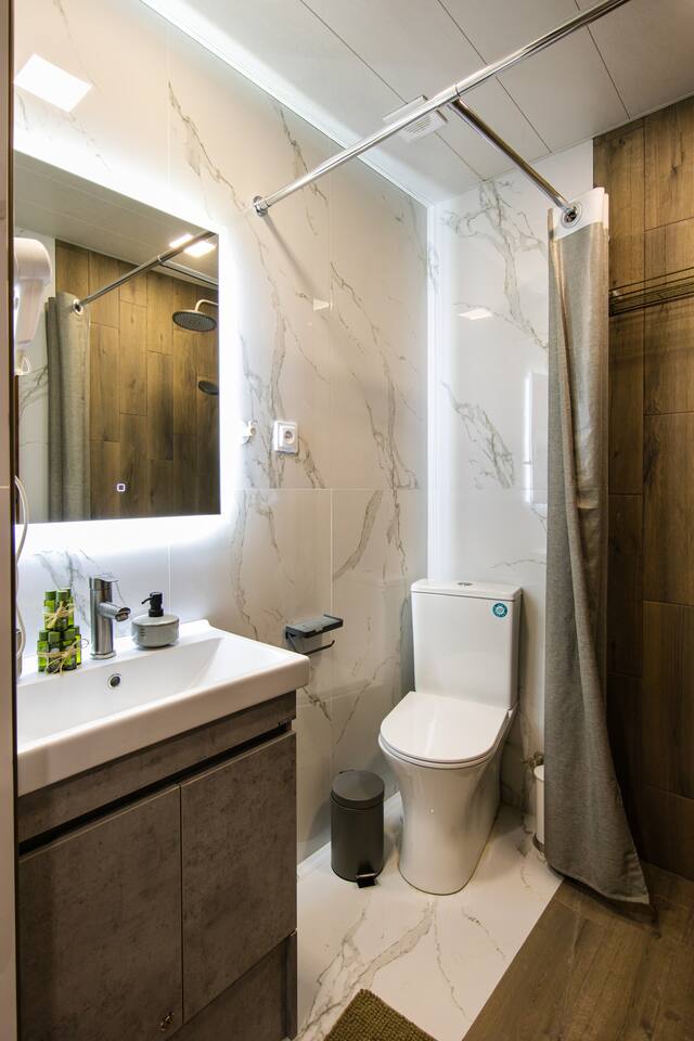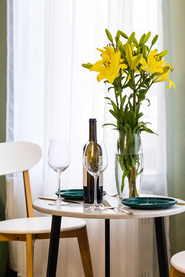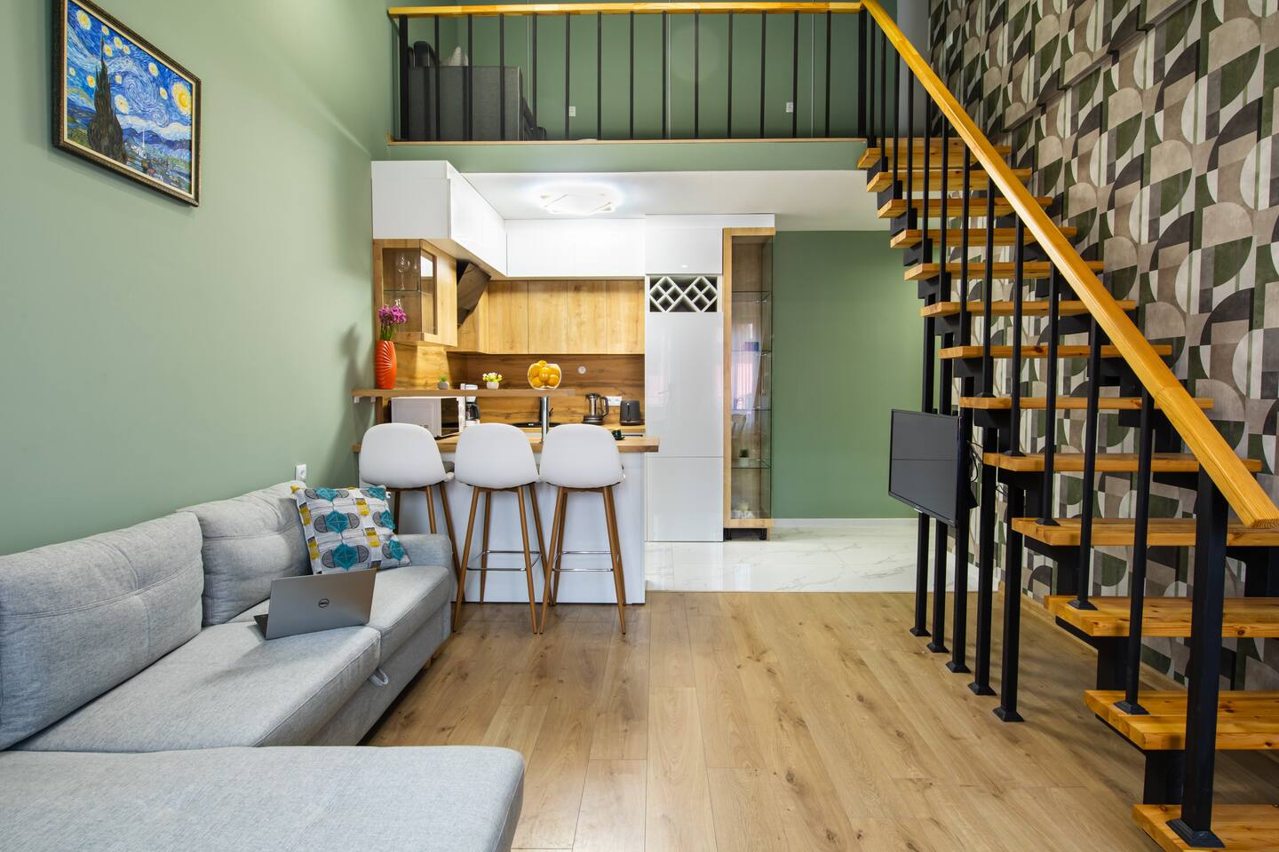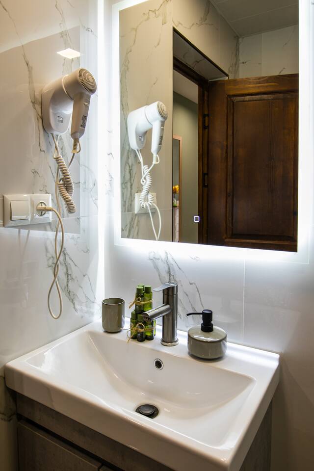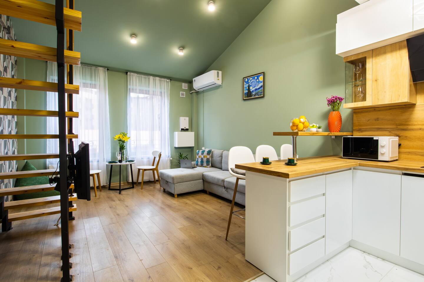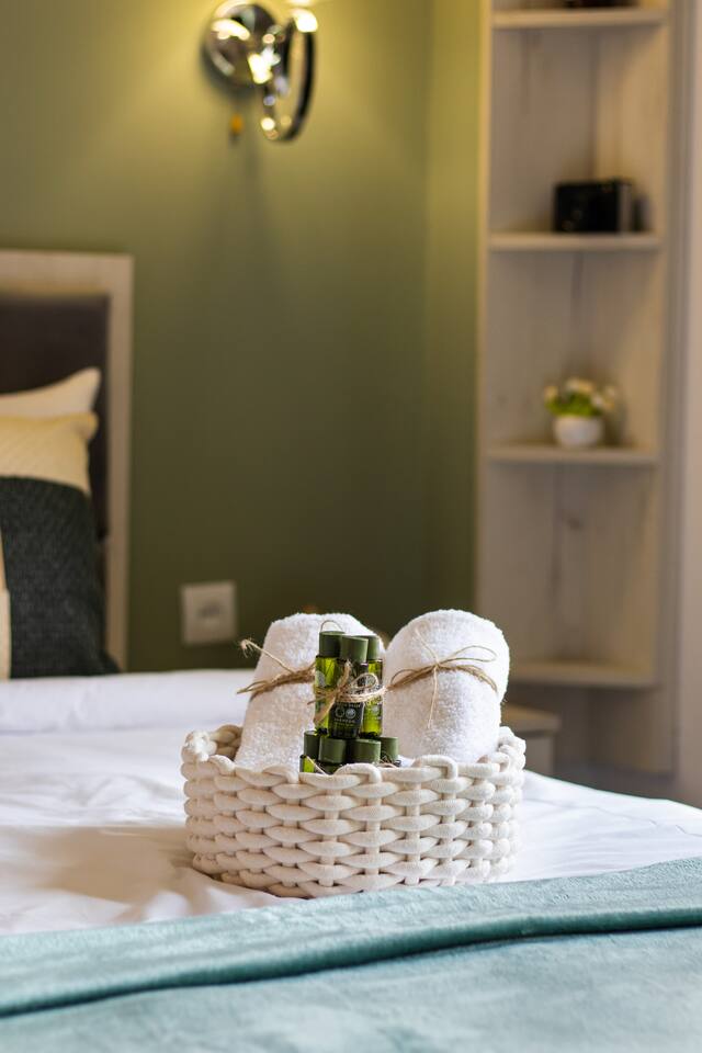 Welcome to Emerald by Hotelise, our stunning new duplex project located in the heart of the city. This unique space, inspired by the vibrant hues of emerald stone, offers a bright, airy environment filled with natural light from large windows. Living Room: Step into the expansive living room, featuring a spacious L-shaped sofa and soaring high ceilings. The duplex design includes a private split ceiling space accessed by stylish stairs, perfect for a cozy armchair retreat. The open-plan area is complemented by three bar stools around the breakfast bar, and a round dining table situated next to the large windows, creating a delightful setting for meals. The room is equipped with AC to ensure your comfort. Kitchen Area: The fully stocked kitchen is designed for both functionality and style. It includes a kettle, toaster, microwave, stove, extractor, fridge, and ample storage space. The breakfast bar adds a touch of convenience for casual dining or morning coffee. Bedroom: The bedroom features a large king-size bed with bedside tables and a high-quality mattress for a restful night’s sleep. A working desk with a TV and a wardrobe provide ample space for work and storage, ensuring a comfortable and organized stay. Bathroom: The bathroom is modern and well-appointed, with a shower cabin, LED mirror, new tiles, and excellent water pressure for a refreshing shower experience. Hallway: The hallway includes a full-size mirror, adding to the practical and stylish design of the apartment. At Hotelise, we are committed to creating spaces that go beyond mere accommodation. Emerald is a testament to our dedication to design, comfort, and memorable guest experiences.