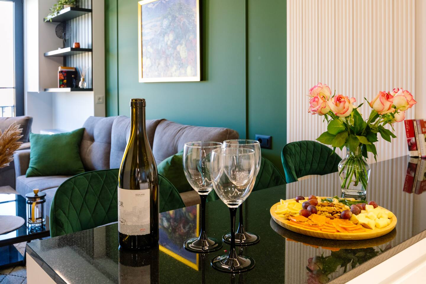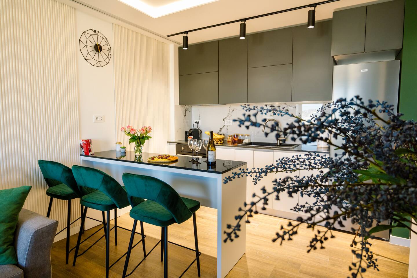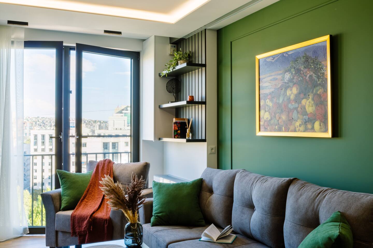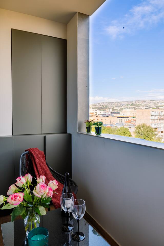 Experience a stay that is a cut above the rest in the pulsing heart of Yerevan with our ultra-premium, designer apartment. Every inch of this magazine-worthy home, located in a secure and peaceful neighborhood, is curated with high-end products and impeccable taste. Kick back in the contemporary living room where a premium four-seater sofa bed is perfectly paired with a coffee table and a large HD TV, offering complimentary Netflix for your entertainment. A sleek work desk allows you to catch up on work, while the French balcony offers city views. The room is kept comfortable with air conditioning, modern lighting, and sophisticated decor. A large, oil-painted artwork from a renowned local artist adds an extra dash of luxury. Savor the culinary possibilities in the open-plan kitchen, fully fitted with luxury amenities. These include a dishwasher, oven, hob, capsule coffee machine, and luxury stone worktops. A full-length mirror complements the space beautifully. Retreat to the serenity of the bedroom, where a large king-size bed with a premium mattress awaits. Enjoy access to the balcony, plentiful storage, and an enchanting oil painting that adds a soothing aura. Another full-length mirror enhances the space. Step out onto the balcony, complete with chairs and a table, making it the perfect spot for savoring evening wines or morning coffee while soaking up the city's energy. Experience ultimate luxury in the bathroom, adorned with large, premium porcelain tiles that instantly elevate the space. Indulge in a spa-like experience with the Hansgrohe shower set and large shower head, complemented by a large mirror and a comfortable shower cabin. Embrace the unique opportunity to live in style and luxury during your stay in Yerevan. Our dedicated team is ready to ensure a memorable experience in this truly one-of-a-kind home. Don't miss out on this slice of luxury in the city!