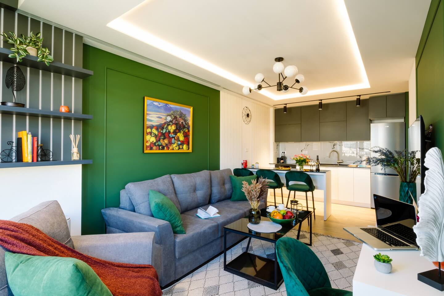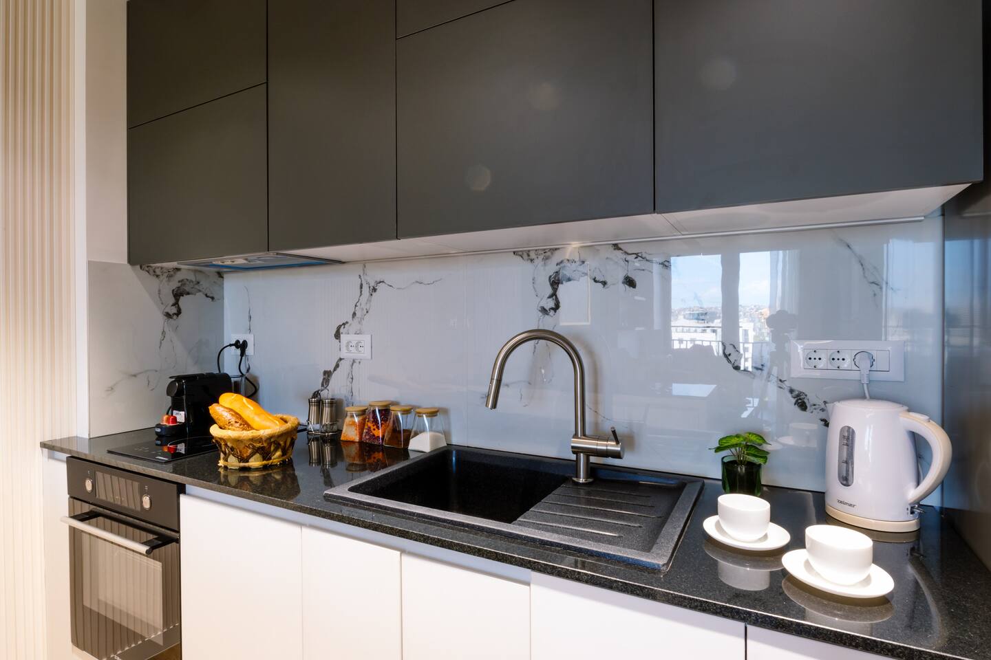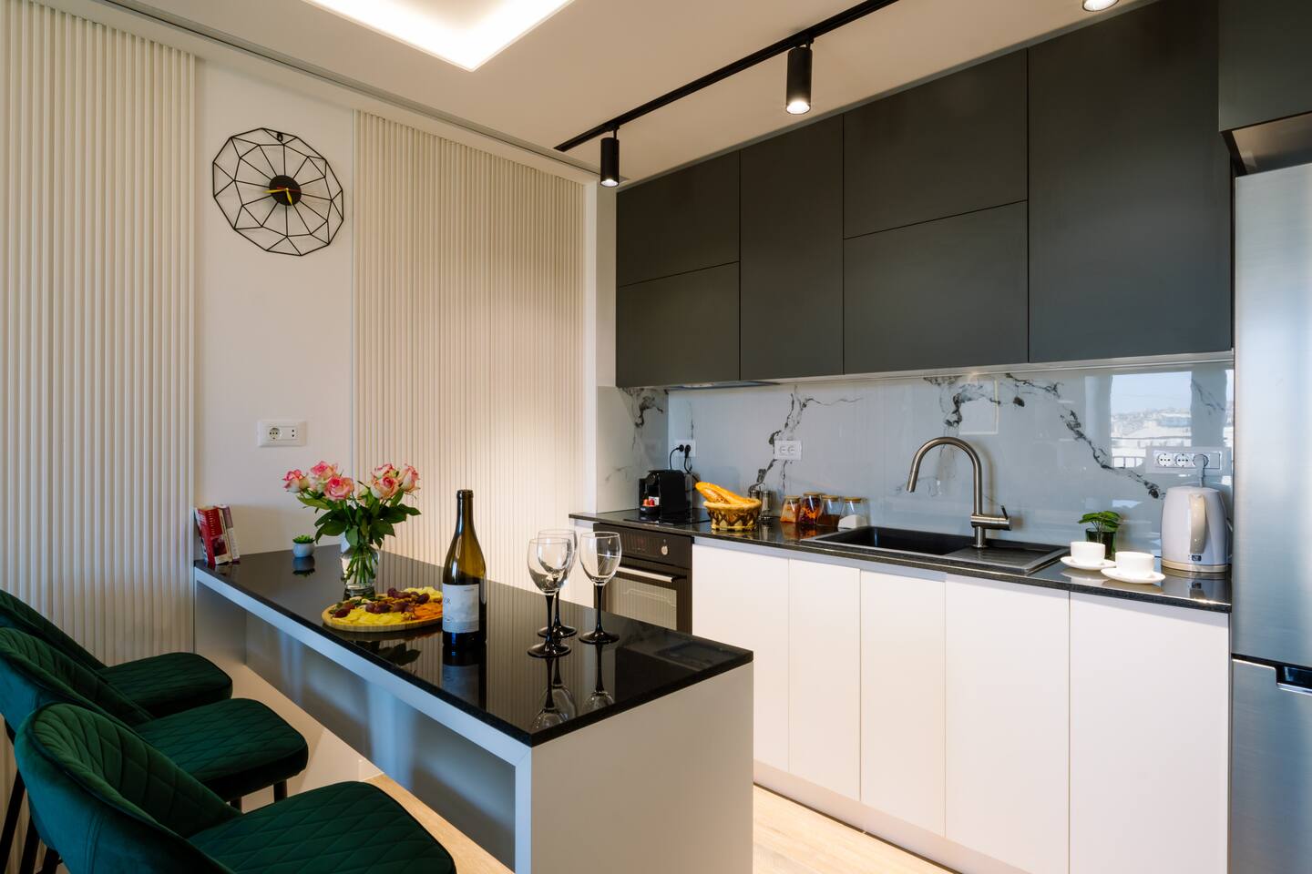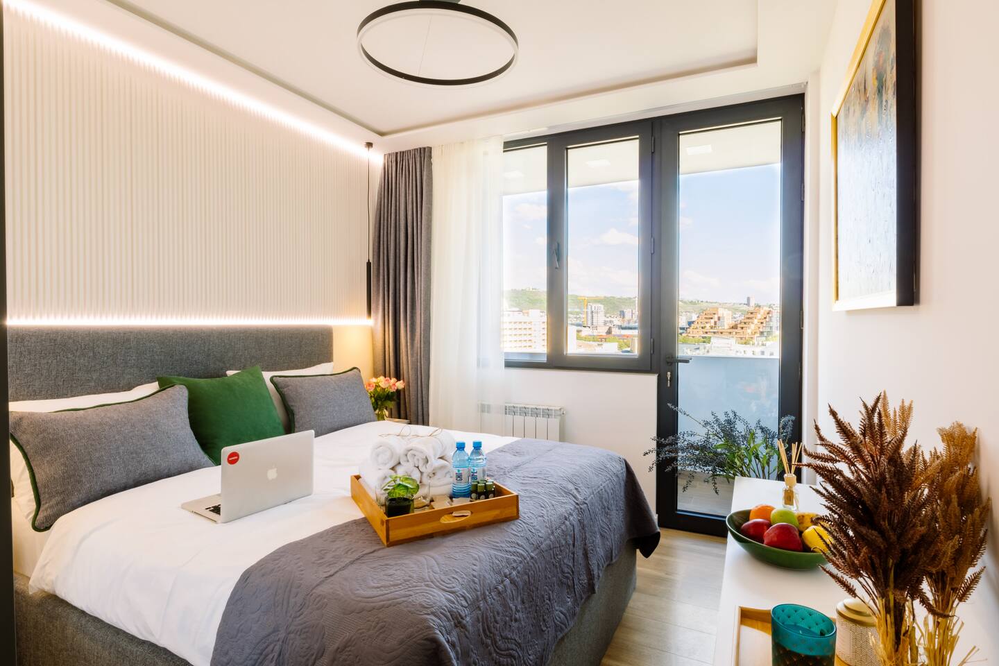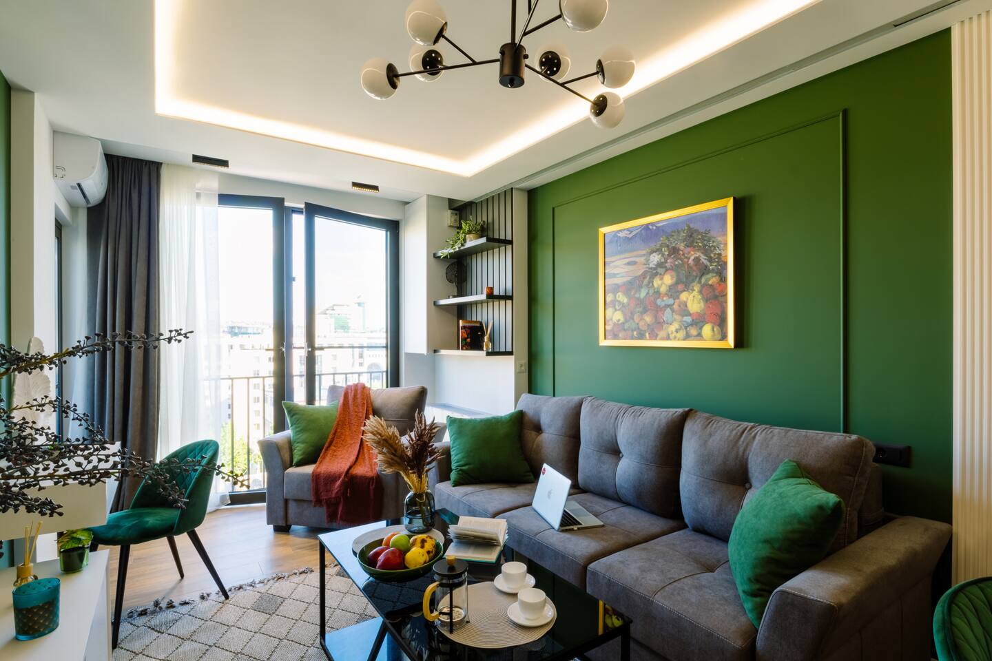 Experience a stay that is a cut above the rest in the pulsing heart of Yerevan with our ultra-premium, designer apartment. Every inch of this magazine-worthy home, located in a secure and peaceful neighborhood, is curated with high-end products and impeccable taste. Kick back in the contemporary living room where a premium four-seater sofa bed is perfectly paired with a coffee table and a large HD TV, offering complimentary Netflix for your entertainment. A sleek work desk allows you to catch up on work, while the French balcony offers city views. The room is kept comfortable with air conditioning, modern lighting, and sophisticated decor. A large, oil-painted artwork from a renowned local artist adds an extra dash of luxury. Savor the culinary possibilities in the open-plan kitchen, fully fitted with luxury amenities. These include a dishwasher, oven, hob, capsule coffee machine, and luxury stone worktops. A full-length mirror complements the space beautifully. Retreat to the serenity of the bedroom, where a large king-size bed with a premium mattress awaits. Enjoy access to the balcony, plentiful storage, and an enchanting oil painting that adds a soothing aura. Another full-length mirror enhances the space. Step out onto the balcony, complete with chairs and a table, making it the perfect spot for savoring evening wines or morning coffee while soaking up the city's energy. Experience ultimate luxury in the bathroom, adorned with large, premium porcelain tiles that instantly elevate the space. Indulge in a spa-like experience with the Hansgrohe shower set and large shower head, complemented by a large mirror and a comfortable shower cabin. Embrace the unique opportunity to live in style and luxury during your stay in Yerevan. Our dedicated team is ready to ensure a memorable experience in this truly one-of-a-kind home. Don't miss out on this slice of luxury in the city!