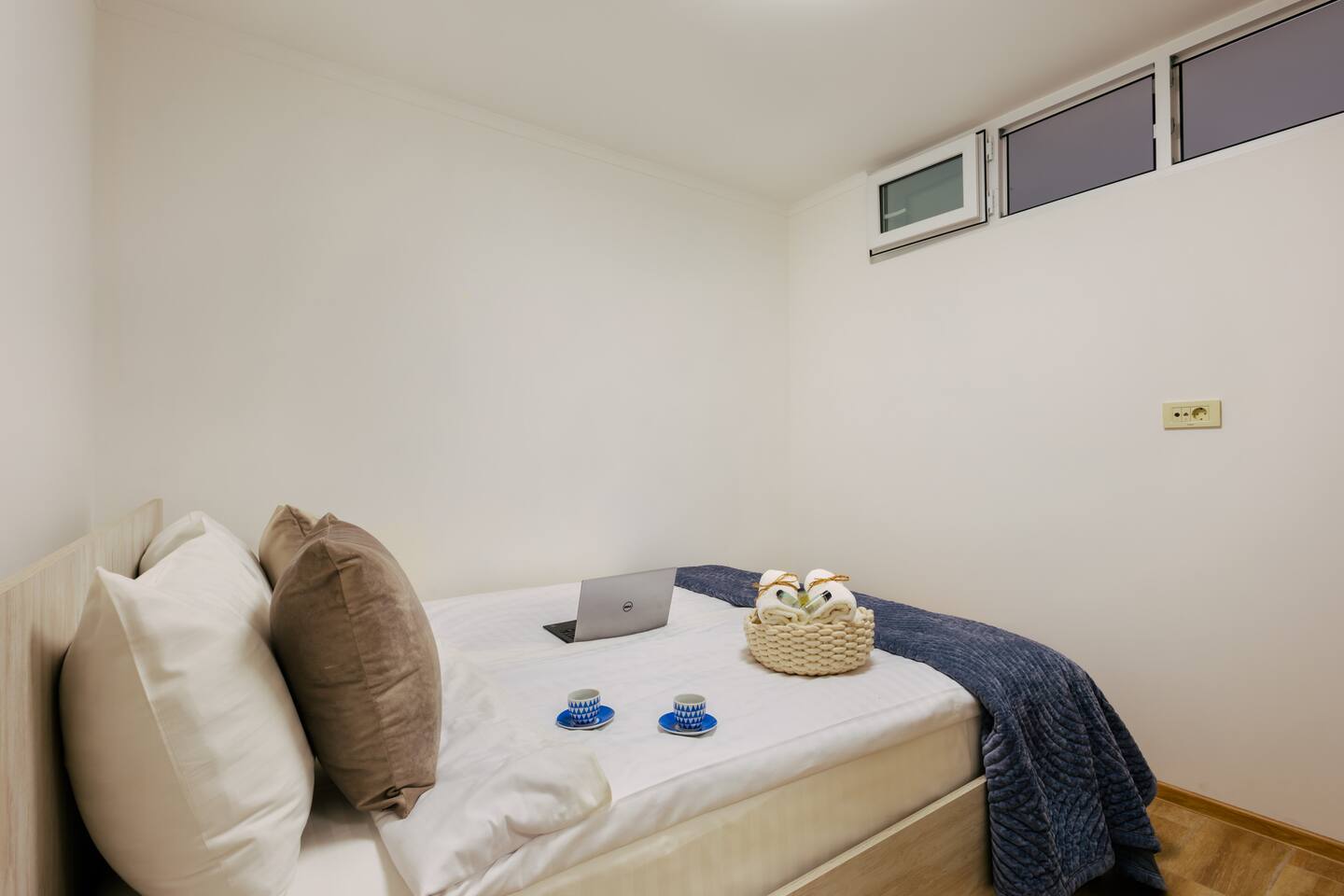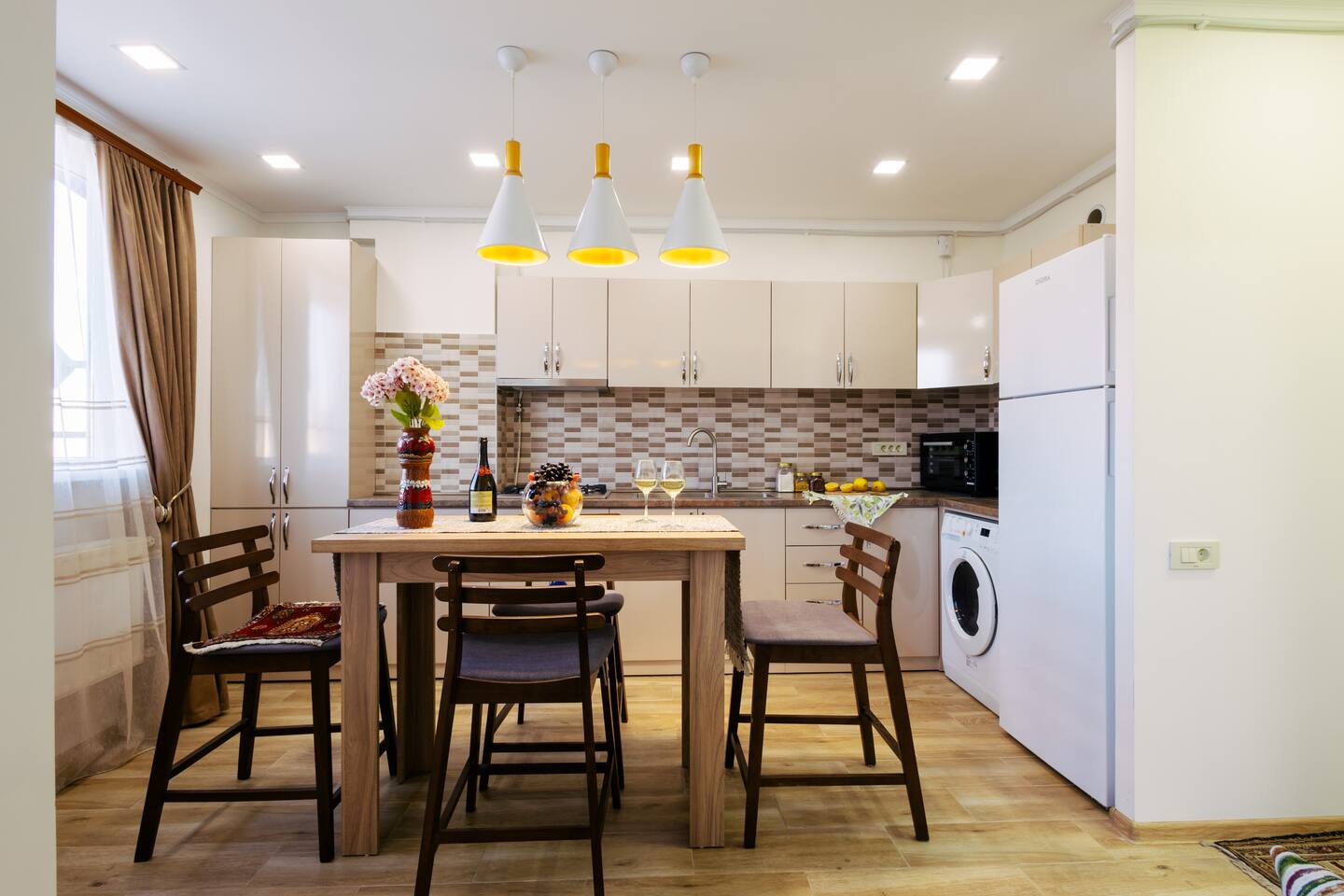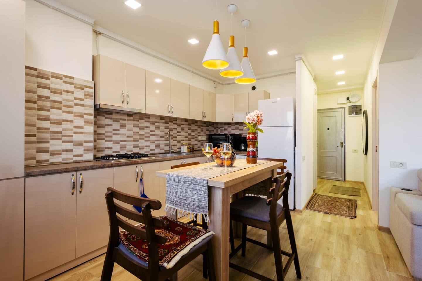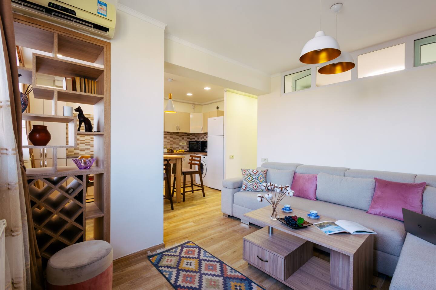 Welcome to "Guru" by Hotelise – A Simple, Clean, and Affordable Stay in the Heart of Yerevan Location: Located on Agatangeghos Street, 7, this apartment is just minutes away from Republic Square and the city's vibrant parks. Apartment: At 40 sqm, this clean and well-located apartment is part of our collection for budget-conscious travelers. While it may not offer luxury, it provides everything you need for a central stay, matching all clean standards with essential amenities and our signature service. Perfect for those who prefer to spend their time exploring the city rather than lounging in designer sofas. Living Room: The living room features a comfortable L-shaped sofa, complemented by a nice rug, coffee table, wall art, and cushions for added comfort. There’s also a large air conditioner to keep the space cool and comfortable. Kitchen: The spacious kitchen, connected to the living room, is larger than you'd expect for a one-bedroom apartment. It comes fully equipped with the basics for cooking and plenty of storage, along with a dining table for four. Amenities include a fridge, microwave, coffeemaker, kettle, toaster, and a washer. The space is bright and welcoming with lots of natural light. Bedroom: Tucked behind the living room, the bedroom stays fresh and airy, even without a direct window. It offers ample storage for clothes, a full-size mirror, and a soft seating area that adds a cozy touch. The bedside table completes the room’s practical vibe. Bathroom: The bathroom includes all the essentials: a shower set with good pressure, a nice shower head, a mirror, and a vanity unit. The clean tiling ensures a fresh, modern look. If you value being in the heart of the city, surrounded by parks, cafes, and entertainment, while enjoying a budget-friendly stay with all necessary amenities, "Guru" is the perfect choice for you.