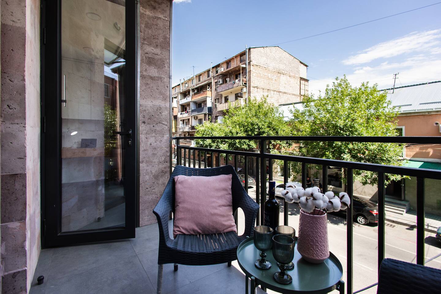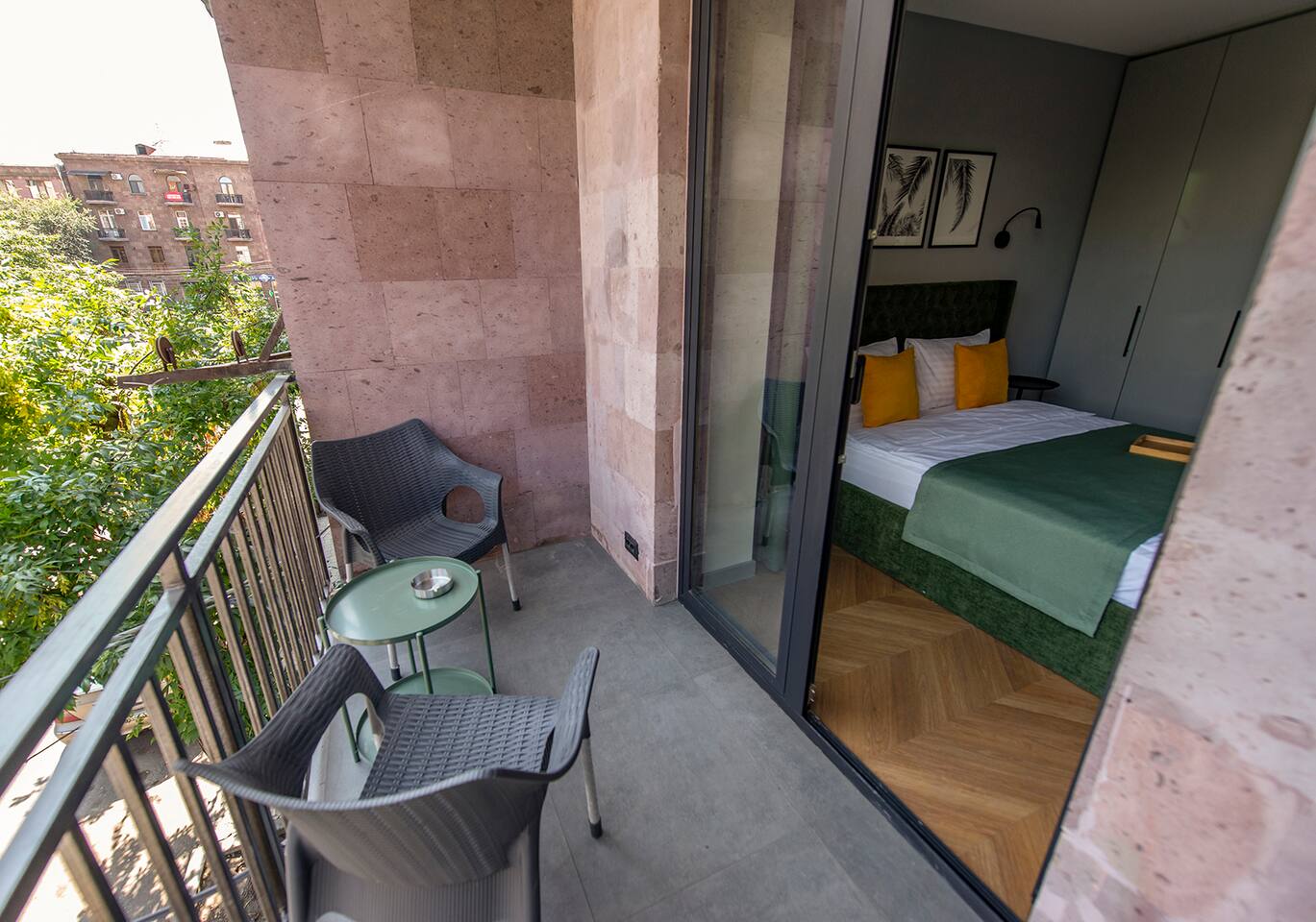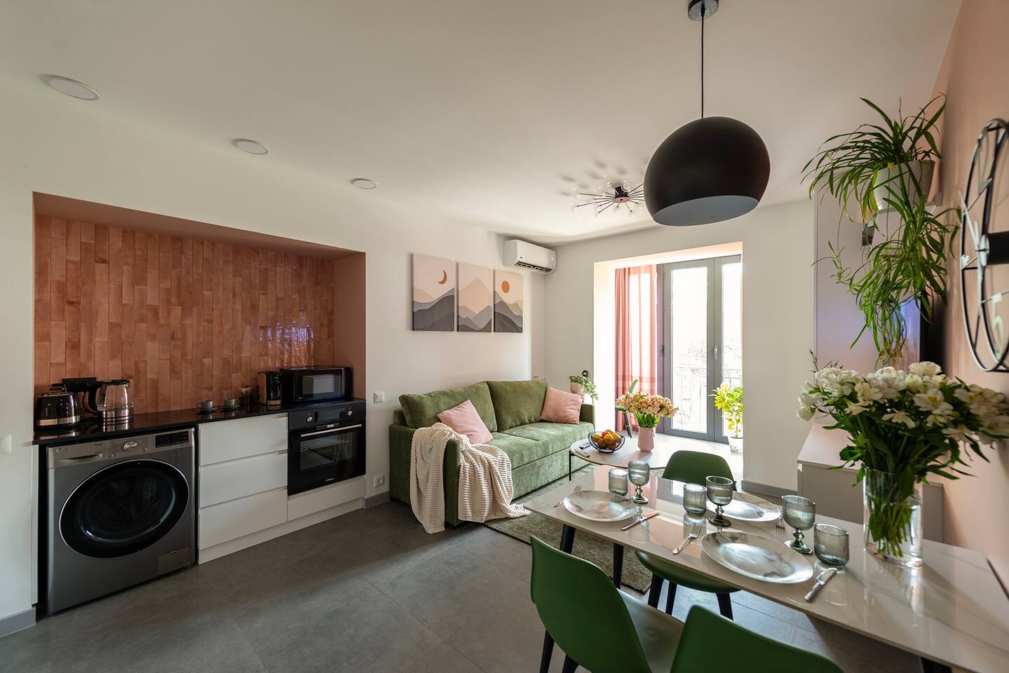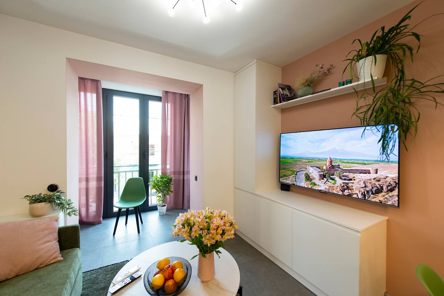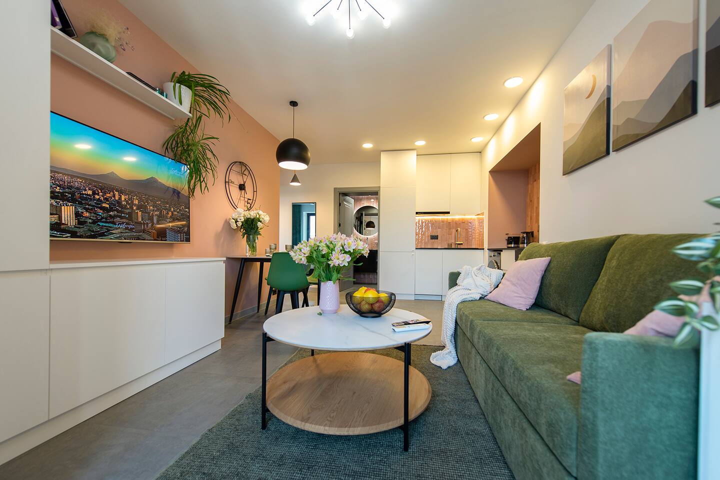 Welcome to Harmony by Hotelise, one of our two specially crafted projects located side by side in the heart of Yerevan. Just like its neighboring studio, Melody, Harmony embodies modern design and comfort. This one-bedroom apartment is a true gem, offering a perfect blend of style, functionality, and warmth, making it an ideal retreat for any traveler. Living Room: Step into the living room, where soothing green tones set a tranquil atmosphere. The space is enhanced by a floor-to-ceiling French balcony, framed with premium aluminum profiles, letting in an abundance of natural light. The room is furnished with a cozy sofa bed, a coffee table, and a TV zone with a large Smart TV. An efficient AC unit keeps the room comfortable, and the dining table for four provides a lovely spot for meals. The area near the French balcony also doubles as a workspace, perfect for those who need to stay connected while away. Kitchen: The open-plan kitchen is a masterclass in sleek design and practicality. It offers ample storage and a stylish backsplash that adds character to the space. Fully equipped with a washer-dryer combo, dishwasher, oven, stove, kettle, and coffee machine, this kitchen ensures that all your needs are met. A large fridge completes the setup, making it a delightful space for cooking and dining. Bedroom: The bedroom is your private sanctuary, featuring a king-size bed with an exquisite bed frame and a premium mattress that guarantees restful sleep. The room is adorned with calming colors and tasteful wall art, creating a serene ambiance. Like the living room, it boasts top-to-bottom windows and doors, providing direct access to the balcony. Balcony: The balcony is an inviting outdoor space, perfect for savoring your morning coffee or unwinding with a glass of wine in the evening. Furnished with comfortable outdoor seating, it offers a peaceful spot to relax and enjoy the fresh air. At Hotelise, we take pride in creating spaces that resonate with both style and comfort. With Harmony and Melody side by side, we've designed not just apartments, but experiences that make you feel at home in Yerevan. Whether you’re staying in Harmony or Melody, you’ll find the same dedication to quality and thoughtful design. Welcome to your new favorite place, where every stay becomes a cherished memory.