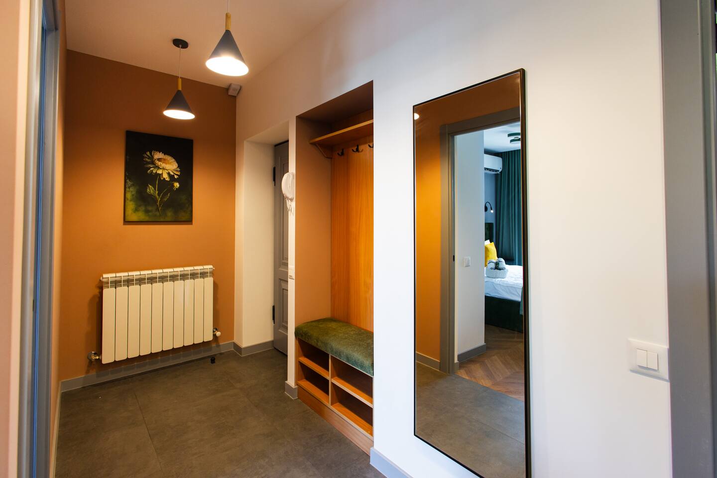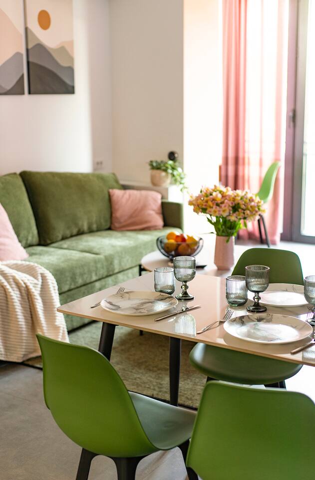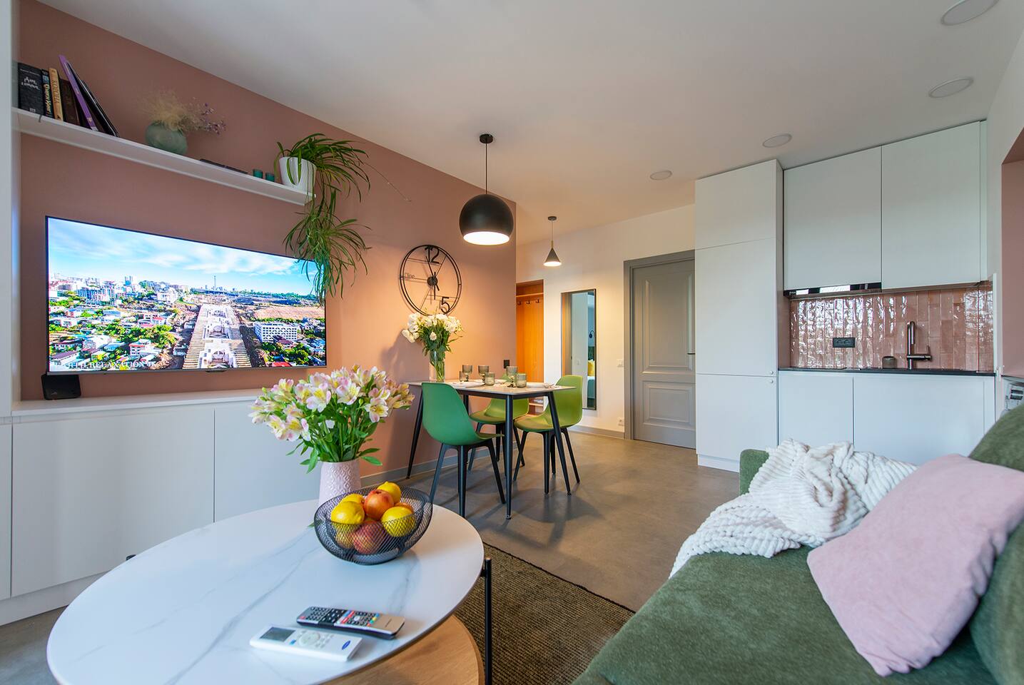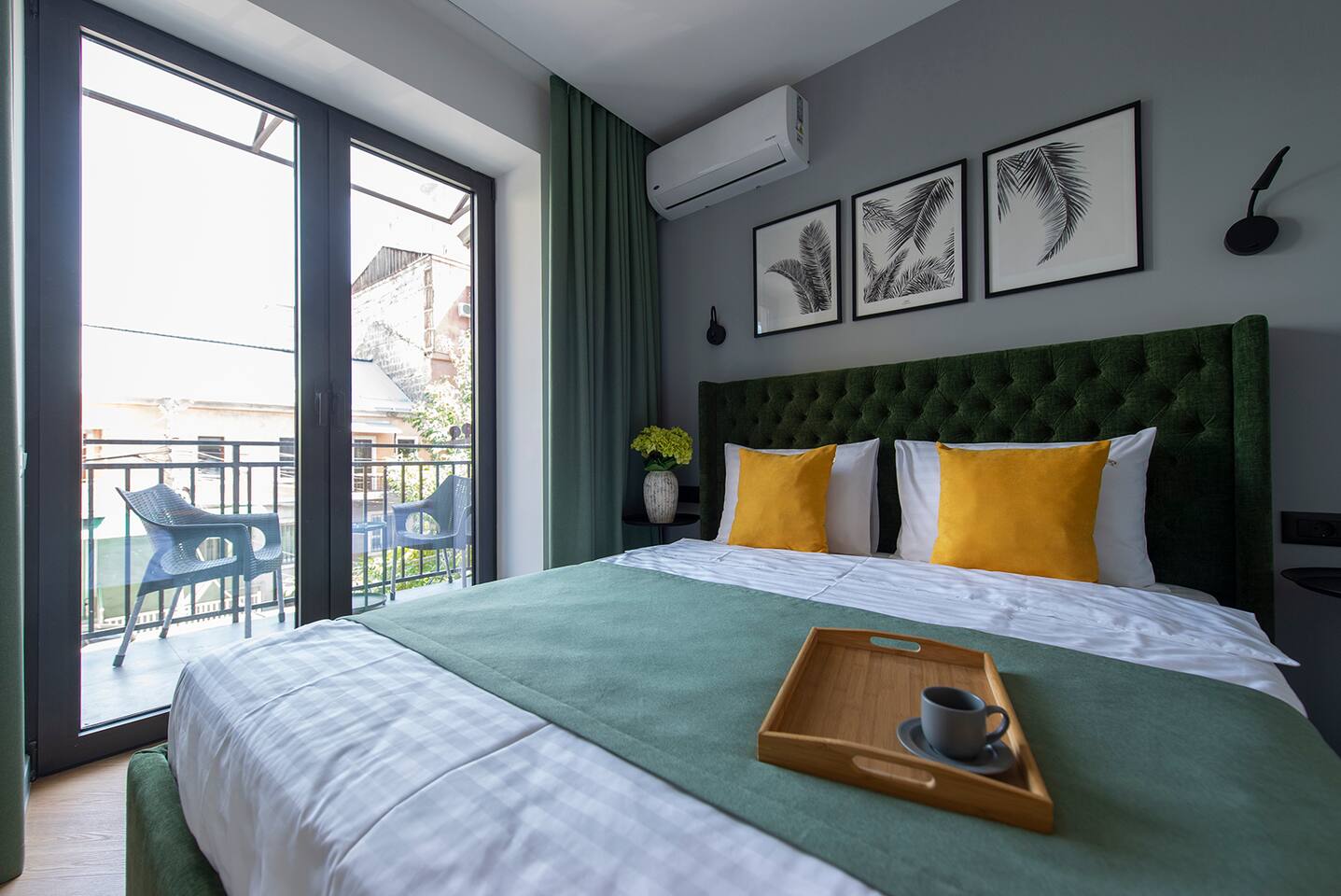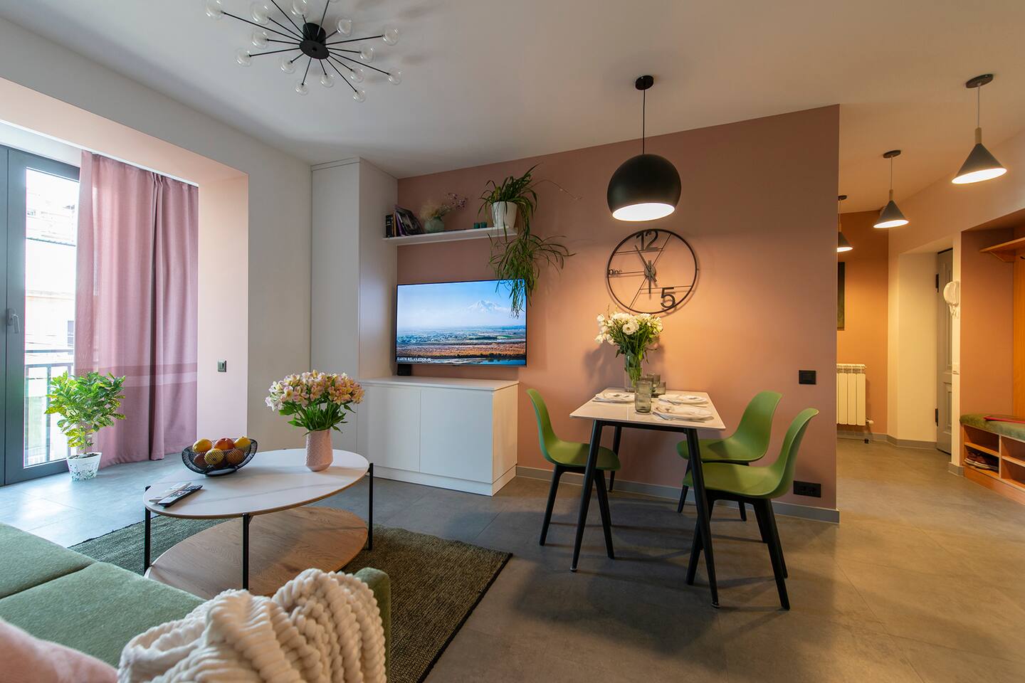 Welcome to Harmony by Hotelise, one of our two specially crafted projects located side by side in the heart of Yerevan. Just like its neighboring studio, Melody, Harmony embodies modern design and comfort. This one-bedroom apartment is a true gem, offering a perfect blend of style, functionality, and warmth, making it an ideal retreat for any traveler. Living Room: Step into the living room, where soothing green tones set a tranquil atmosphere. The space is enhanced by a floor-to-ceiling French balcony, framed with premium aluminum profiles, letting in an abundance of natural light. The room is furnished with a cozy sofa bed, a coffee table, and a TV zone with a large Smart TV. An efficient AC unit keeps the room comfortable, and the dining table for four provides a lovely spot for meals. The area near the French balcony also doubles as a workspace, perfect for those who need to stay connected while away. Kitchen: The open-plan kitchen is a masterclass in sleek design and practicality. It offers ample storage and a stylish backsplash that adds character to the space. Fully equipped with a washer-dryer combo, dishwasher, oven, stove, kettle, and coffee machine, this kitchen ensures that all your needs are met. A large fridge completes the setup, making it a delightful space for cooking and dining. Bedroom: The bedroom is your private sanctuary, featuring a king-size bed with an exquisite bed frame and a premium mattress that guarantees restful sleep. The room is adorned with calming colors and tasteful wall art, creating a serene ambiance. Like the living room, it boasts top-to-bottom windows and doors, providing direct access to the balcony. Balcony: The balcony is an inviting outdoor space, perfect for savoring your morning coffee or unwinding with a glass of wine in the evening. Furnished with comfortable outdoor seating, it offers a peaceful spot to relax and enjoy the fresh air. At Hotelise, we take pride in creating spaces that resonate with both style and comfort. With Harmony and Melody side by side, we've designed not just apartments, but experiences that make you feel at home in Yerevan. Whether you’re staying in Harmony or Melody, you’ll find the same dedication to quality and thoughtful design. Welcome to your new favorite place, where every stay becomes a cherished memory.