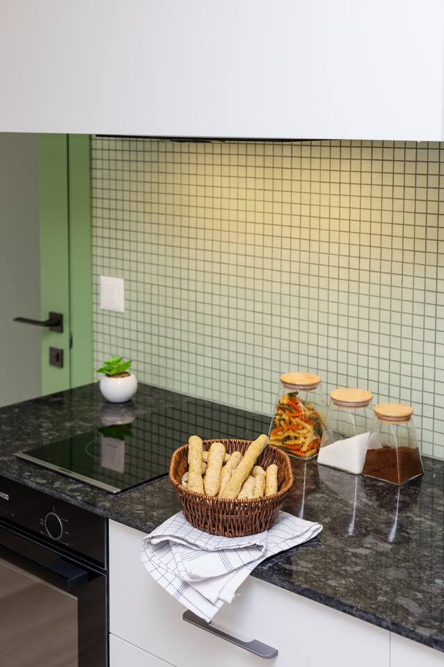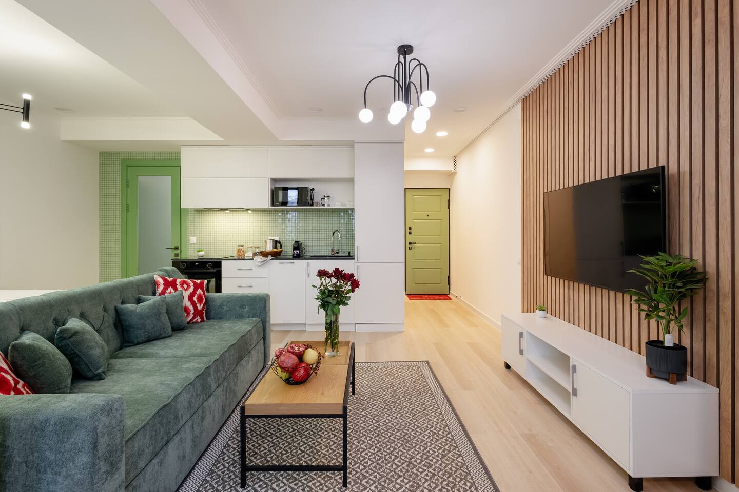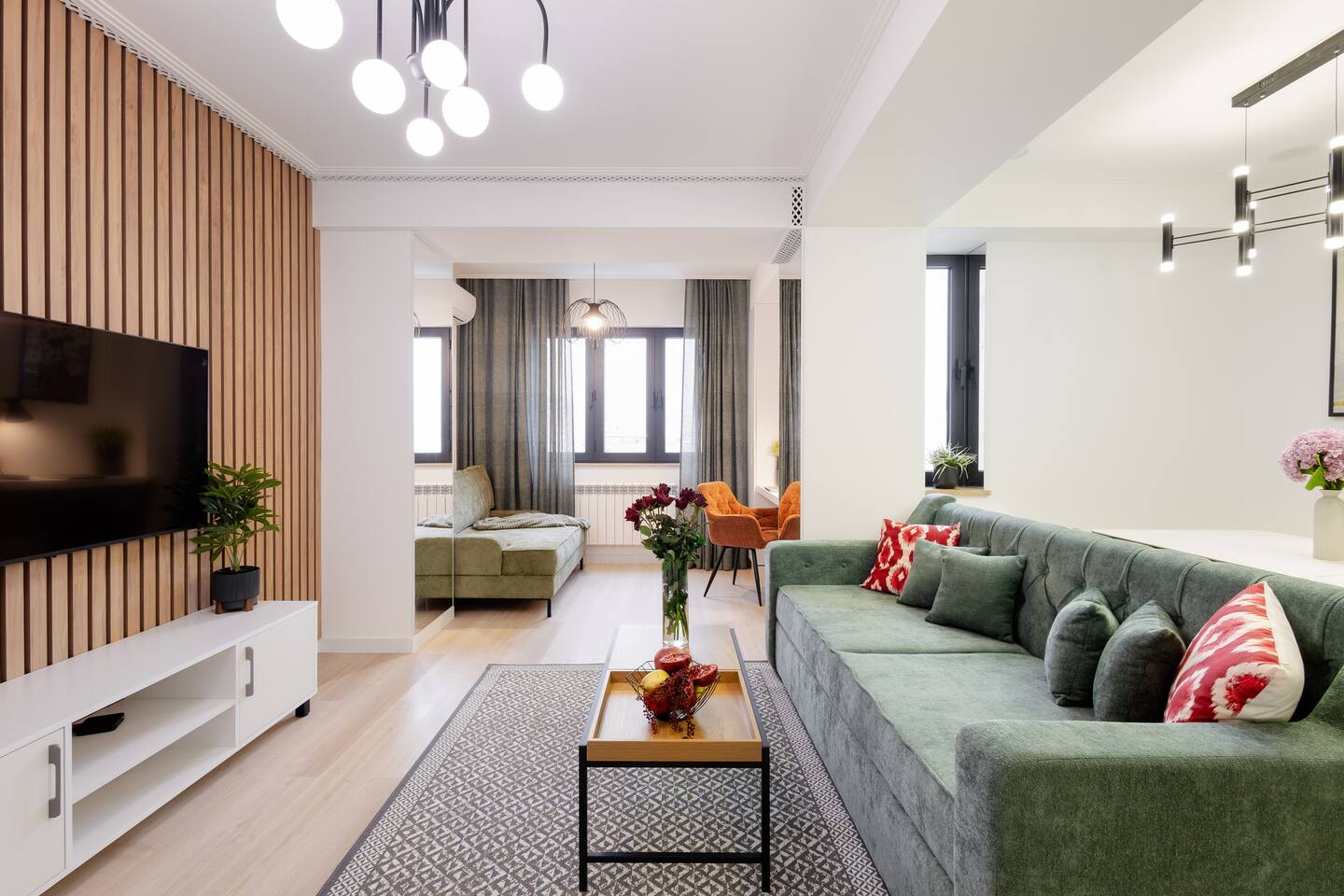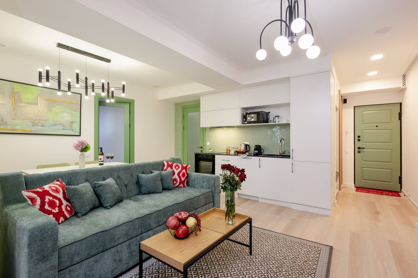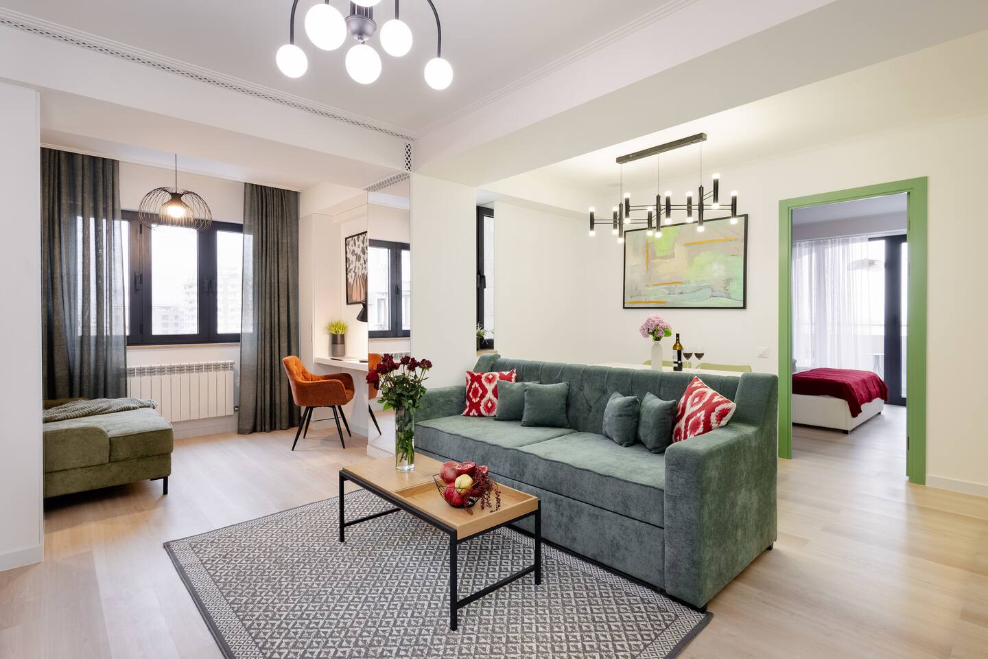 Welcome to "The Grand Central Suite" by Hotelise — a modern, thoughtfully designed retreat in the heart of it all. Living-room The open-concept living room and kitchen are designed for both comfort and functionality. The space features a bright, modern living area with stylish furnishings and a relaxed atmosphere, seamlessly connected to a fully equipped kitchen. This stylish space blends clean lines, warm finishes, and comfort-forward details, making it perfect for both short stays and longer visits. The green color concept adds a distinctive and refreshing character to the space. Carefully selected green tones bring a sense of calm and balance, creating a unique look that feels both modern and inviting. Bedroom Enjoy an open, airy layout with contemporary furnishings, a comfortable sleeping area, and a fully equipped space to relax or work. Balcony Step out onto the private balcony to sip your morning coffee or unwind in the evening with city views and fresh air. Whether you’re in town for business or a weekend escape, you’ll love the suite’s central location, smart design, and calm, upscale vibe — a true home base for exploring the city.