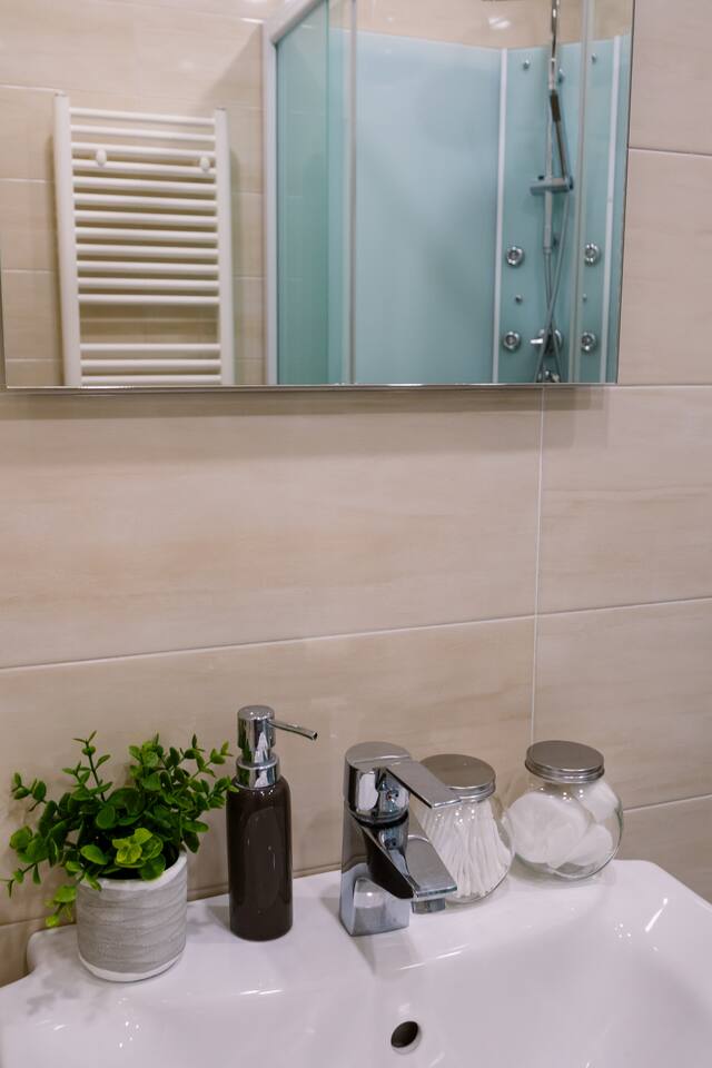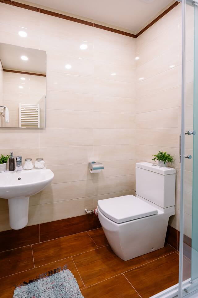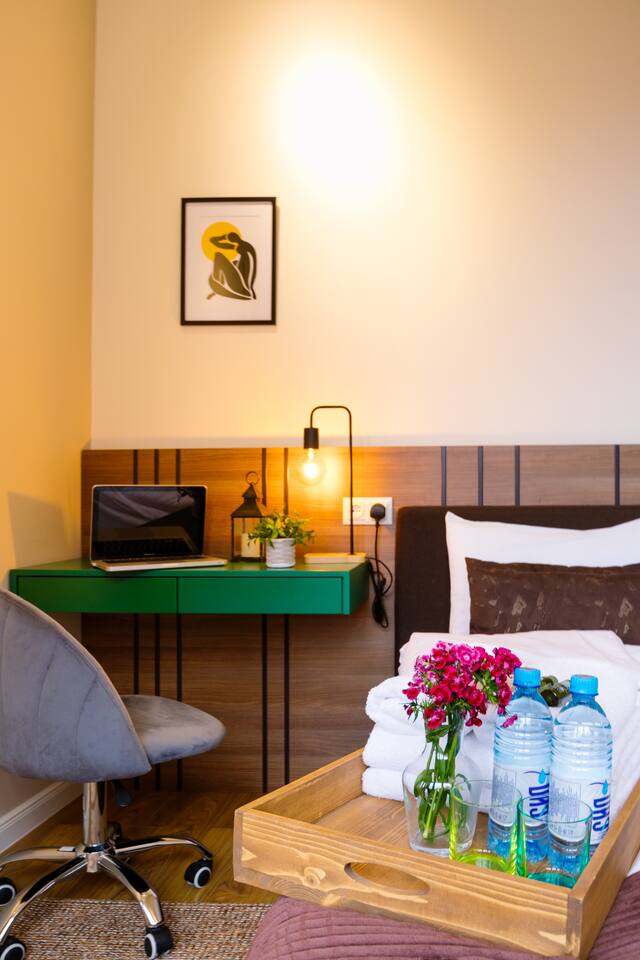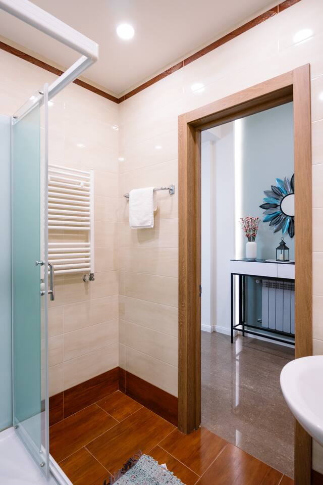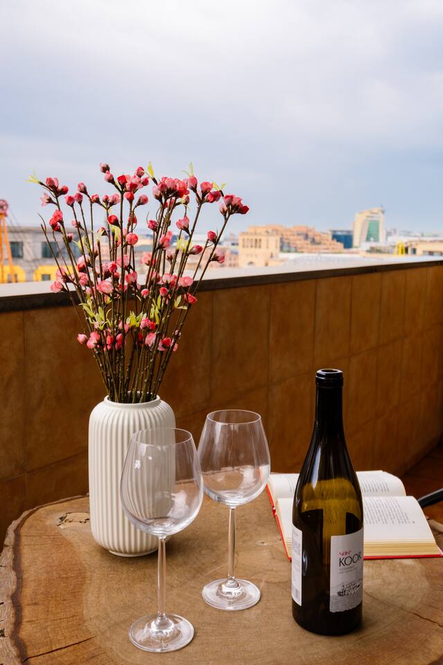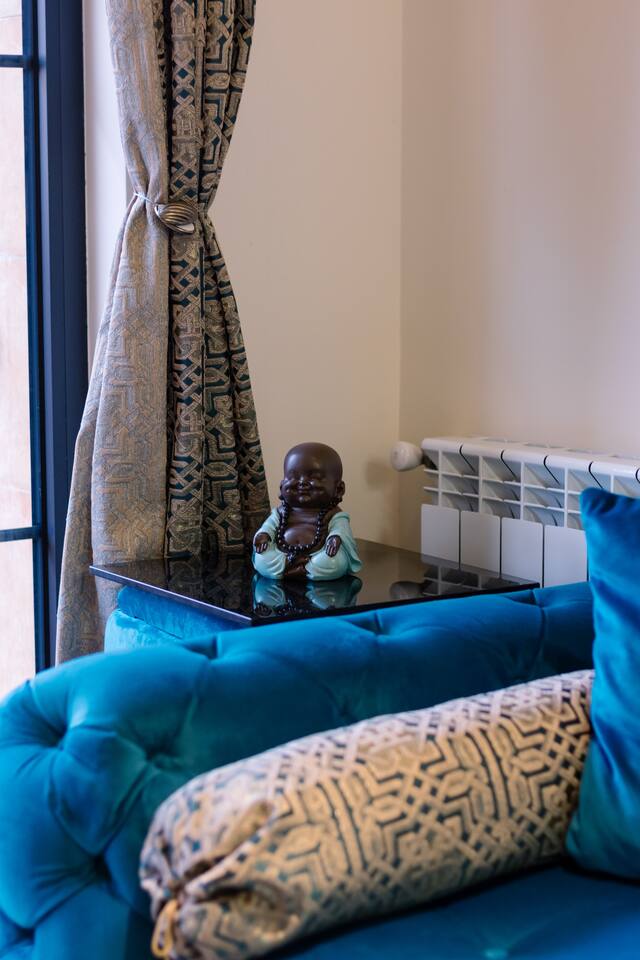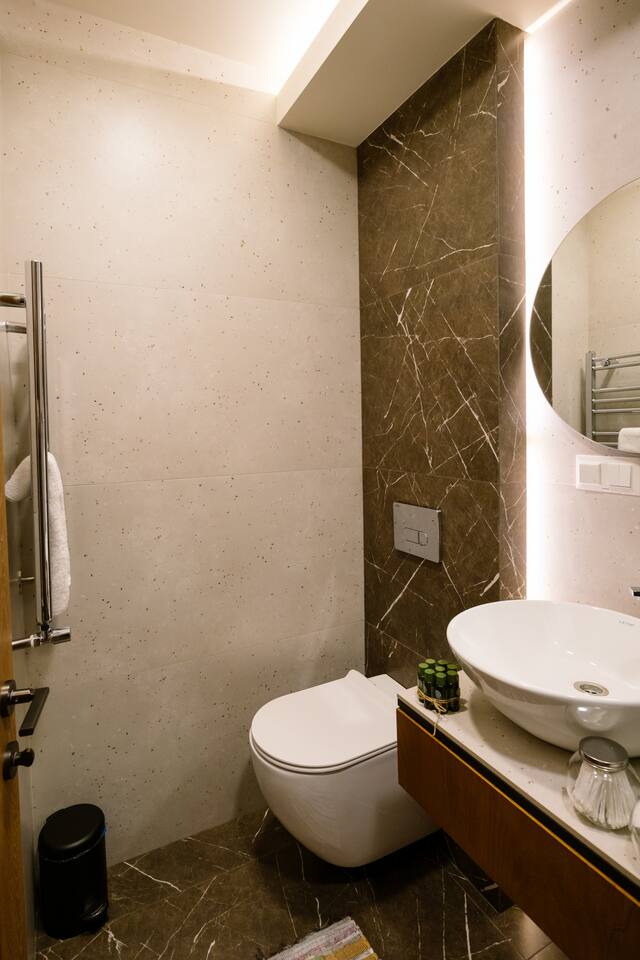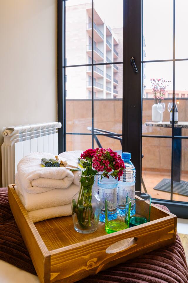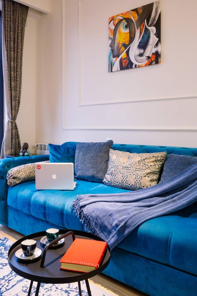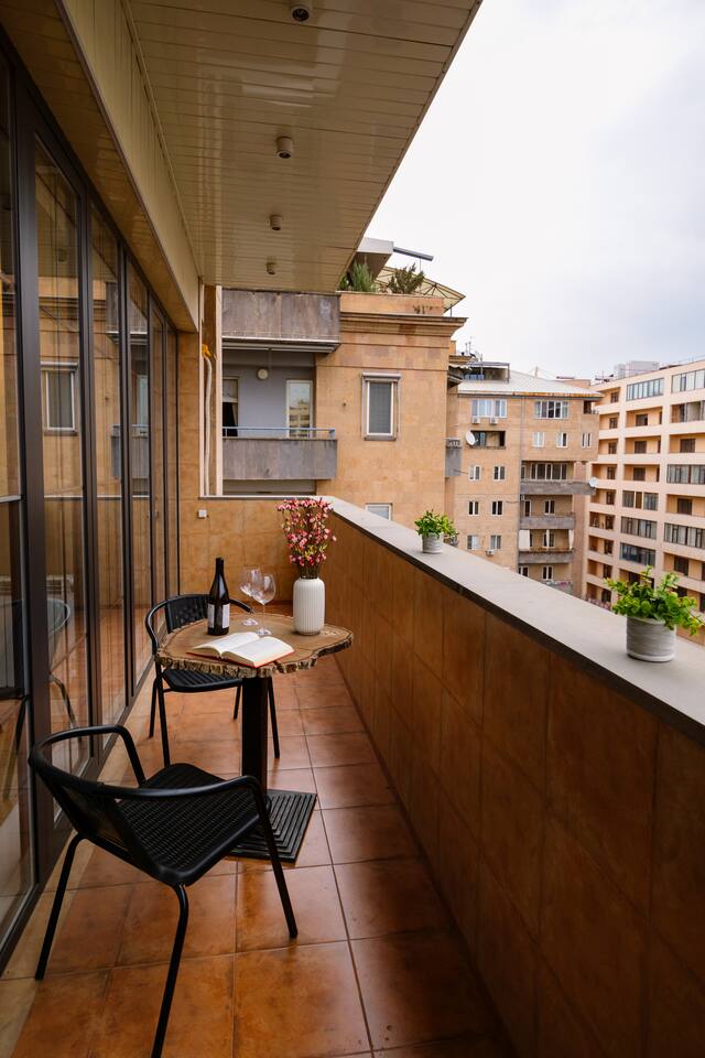 Welcome to our upscale retreat at 8 Teryan St, Yerevan - a brand-new building in a safe neighborhood with top-notch communal areas and new lifts. Experience the blend of luxury, comfort, and style as you step into our meticulously designed space. The living room, an open plan design shared with the kitchen, hosts a stunning electric blue 4-seater sofabed, perfectly positioned for the Smart HD TV with free Netflix. The unique blend of classic walls and a feature wall adorned with a mix of large stone-like porcelain tiles and wood makes a striking visual statement. Floor-to-ceiling doors grant access to the balcony, inviting abundant natural light in. Our kitchen is a culinary delight, equipped with an oven, hob, microwave, toaster, and coffee machine. A full-sized refrigerator and dining area for 4 make meal times a pleasure. The master bedroom oozes elegance, boasting exceptional décor, a high-quality mattress, plush pillows, and a convenient workspace. It has access to both the balcony and an en-suite bathroom, which features a shower cabin with excellent water pressure and premium shower sets and taps. The second bedroom is compact yet comfortable, furnished with a single bed, a desk, and offers access to both the living room and balcony. The main bathroom doesn't compromise on quality - enjoy a refreshing experience in the well-sized shower cabin, equipped with a top-grade shower set. The balcony, furnished with an outdoor seating arrangement for two, offers splendid views. It's an ideal spot to enjoy an evening glass of wine, embracing the vibrant vibes of Yerevan. Every inch of this space is touched with premium materials to give you a luxurious feel throughout your stay. Don't miss out on this one-of-a-kind experience!