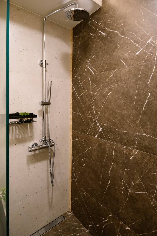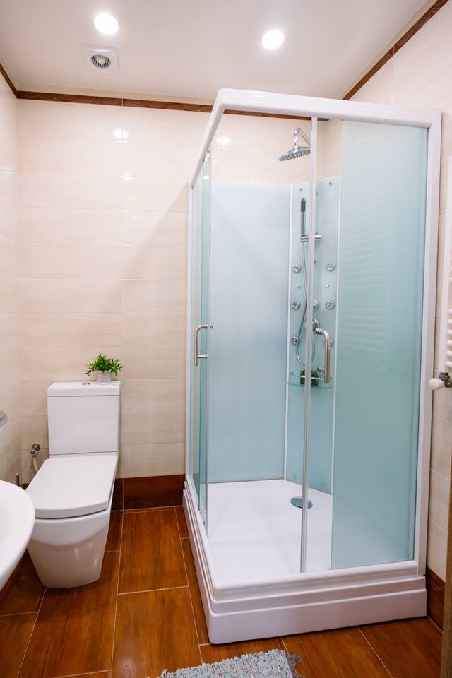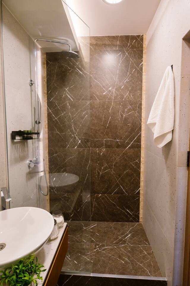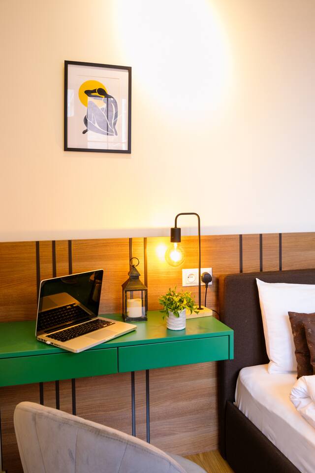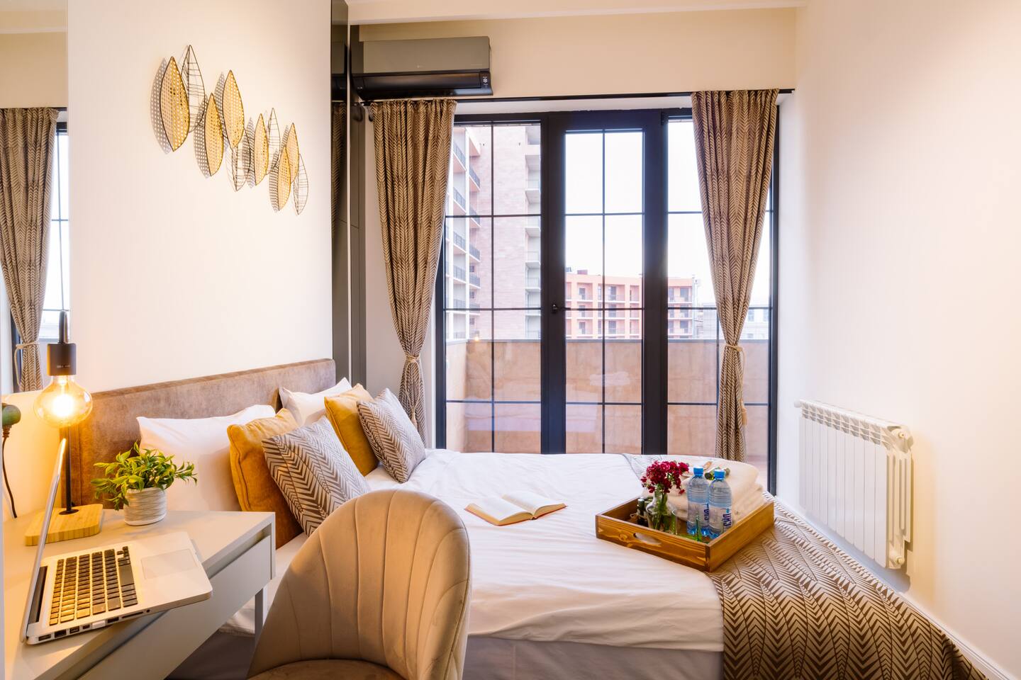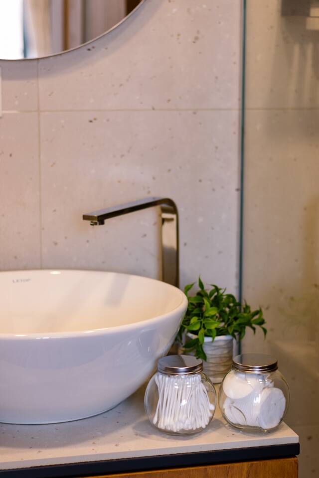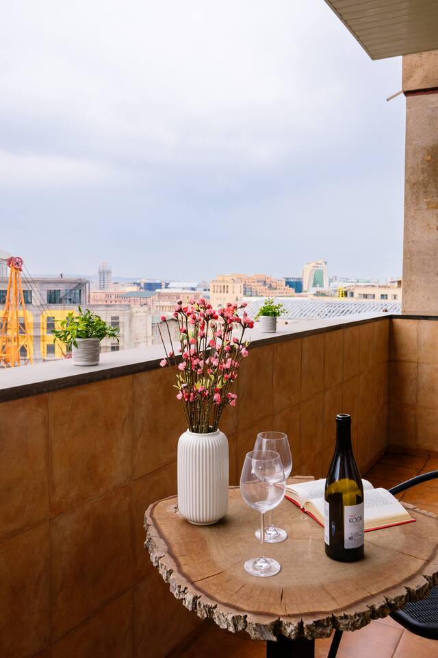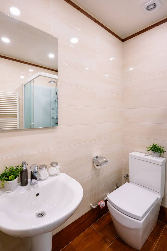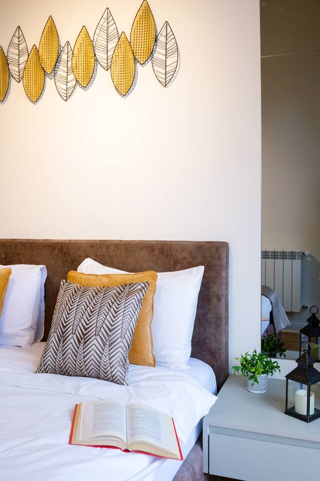 Welcome to our upscale retreat at 8 Teryan St, Yerevan - a brand-new building in a safe neighborhood with top-notch communal areas and new lifts. Experience the blend of luxury, comfort, and style as you step into our meticulously designed space. The living room, an open plan design shared with the kitchen, hosts a stunning electric blue 4-seater sofabed, perfectly positioned for the Smart HD TV with free Netflix. The unique blend of classic walls and a feature wall adorned with a mix of large stone-like porcelain tiles and wood makes a striking visual statement. Floor-to-ceiling doors grant access to the balcony, inviting abundant natural light in. Our kitchen is a culinary delight, equipped with an oven, hob, microwave, toaster, and coffee machine. A full-sized refrigerator and dining area for 4 make meal times a pleasure. The master bedroom oozes elegance, boasting exceptional décor, a high-quality mattress, plush pillows, and a convenient workspace. It has access to both the balcony and an en-suite bathroom, which features a shower cabin with excellent water pressure and premium shower sets and taps. The second bedroom is compact yet comfortable, furnished with a single bed, a desk, and offers access to both the living room and balcony. The main bathroom doesn't compromise on quality - enjoy a refreshing experience in the well-sized shower cabin, equipped with a top-grade shower set. The balcony, furnished with an outdoor seating arrangement for two, offers splendid views. It's an ideal spot to enjoy an evening glass of wine, embracing the vibrant vibes of Yerevan. Every inch of this space is touched with premium materials to give you a luxurious feel throughout your stay. Don't miss out on this one-of-a-kind experience!