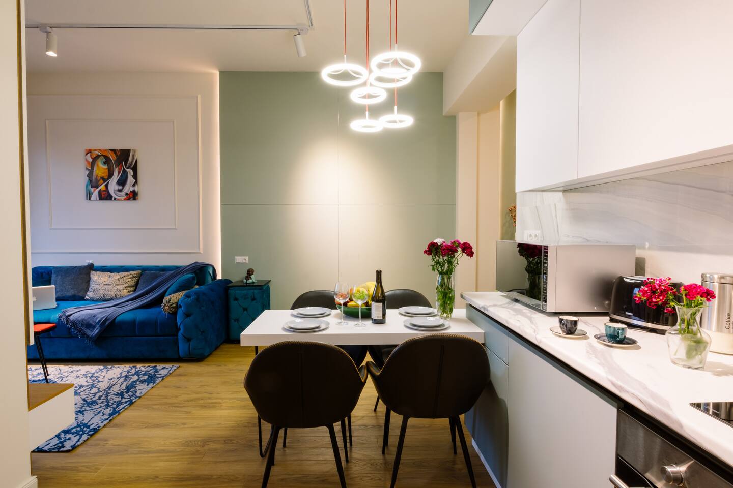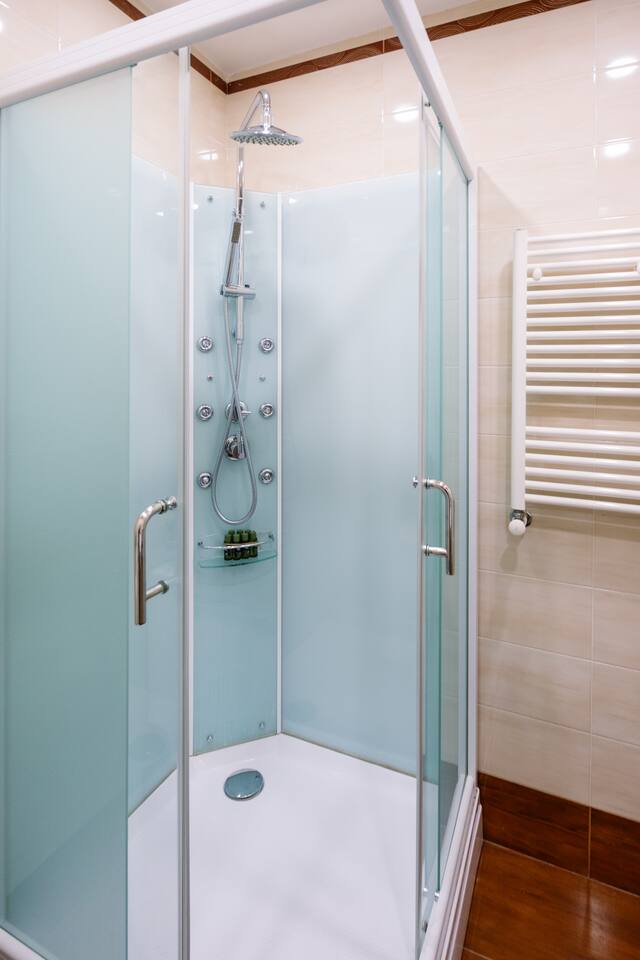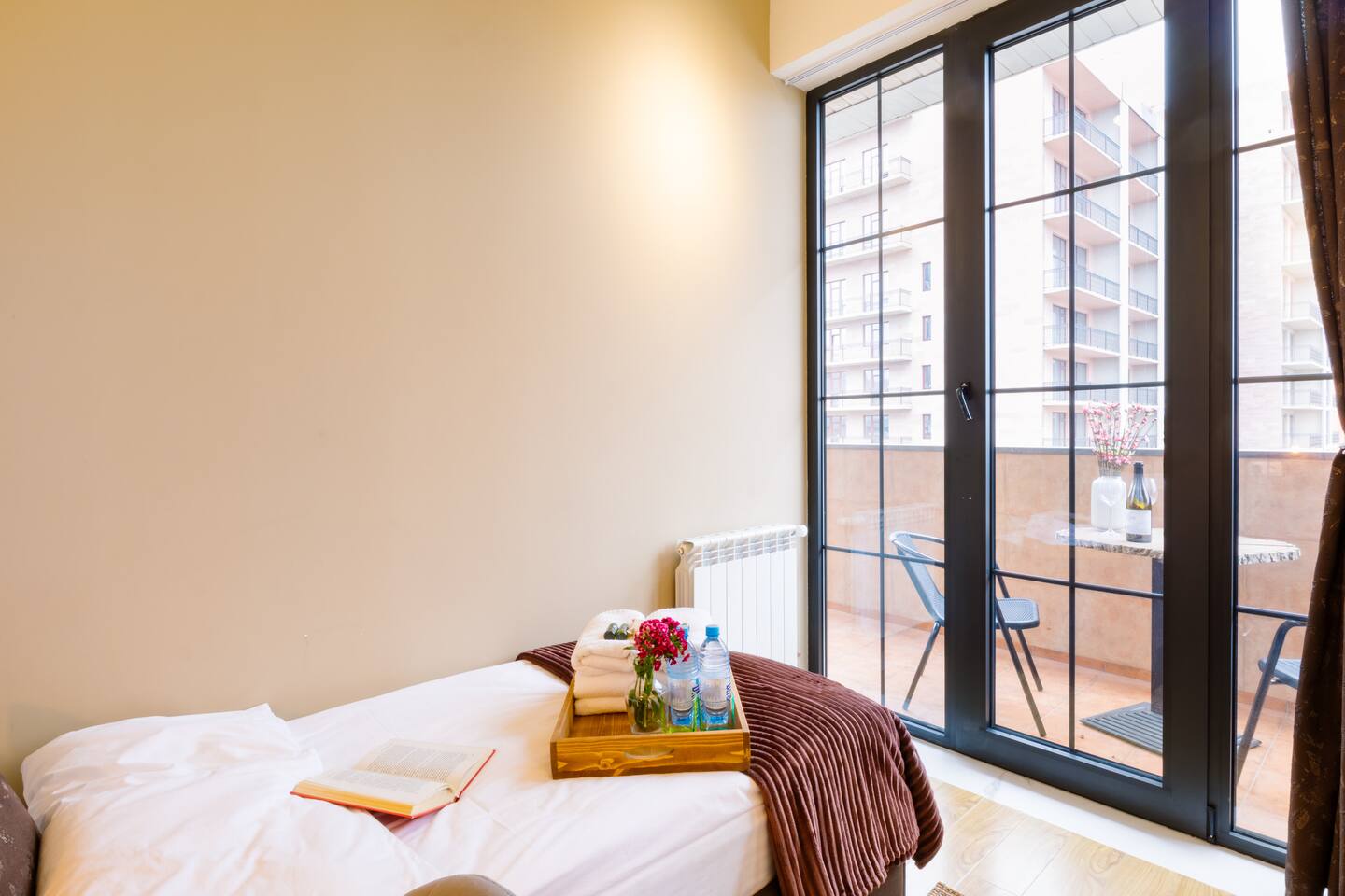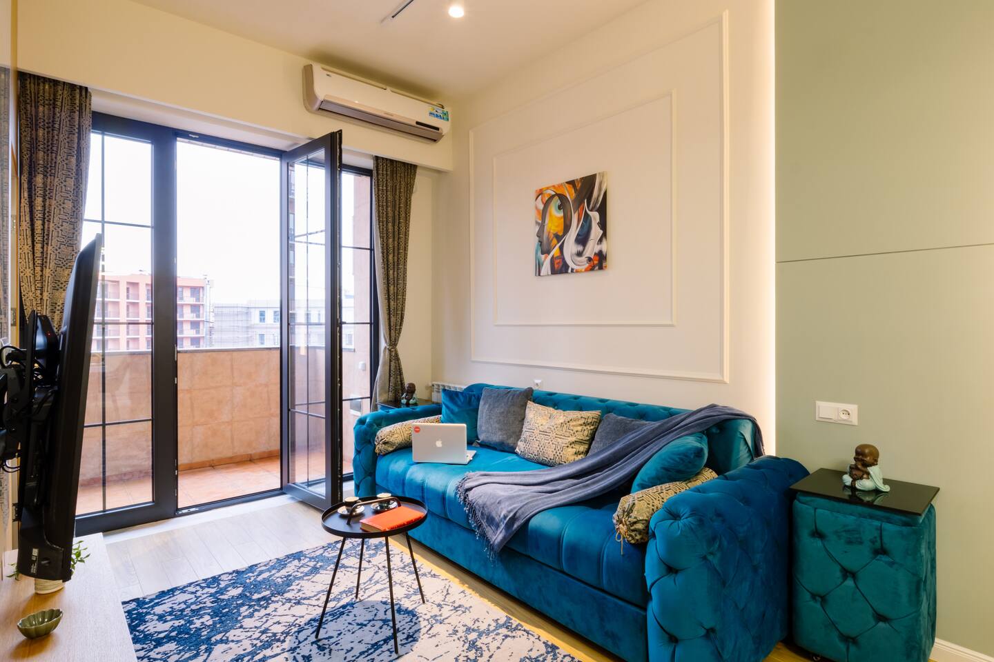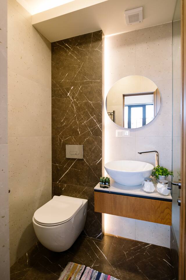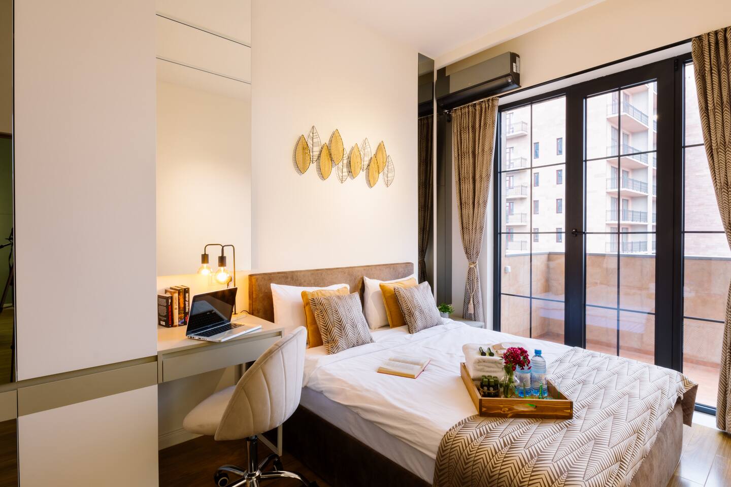 Welcome to our upscale retreat at 8 Teryan St, Yerevan - a brand-new building in a safe neighborhood with top-notch communal areas and new lifts. Experience the blend of luxury, comfort, and style as you step into our meticulously designed space. The living room, an open plan design shared with the kitchen, hosts a stunning electric blue 4-seater sofabed, perfectly positioned for the Smart HD TV with free Netflix. The unique blend of classic walls and a feature wall adorned with a mix of large stone-like porcelain tiles and wood makes a striking visual statement. Floor-to-ceiling doors grant access to the balcony, inviting abundant natural light in. Our kitchen is a culinary delight, equipped with an oven, hob, microwave, toaster, and coffee machine. A full-sized refrigerator and dining area for 4 make meal times a pleasure. The master bedroom oozes elegance, boasting exceptional décor, a high-quality mattress, plush pillows, and a convenient workspace. It has access to both the balcony and an en-suite bathroom, which features a shower cabin with excellent water pressure and premium shower sets and taps. The second bedroom is compact yet comfortable, furnished with a single bed, a desk, and offers access to both the living room and balcony. The main bathroom doesn't compromise on quality - enjoy a refreshing experience in the well-sized shower cabin, equipped with a top-grade shower set. The balcony, furnished with an outdoor seating arrangement for two, offers splendid views. It's an ideal spot to enjoy an evening glass of wine, embracing the vibrant vibes of Yerevan. Every inch of this space is touched with premium materials to give you a luxurious feel throughout your stay. Don't miss out on this one-of-a-kind experience!