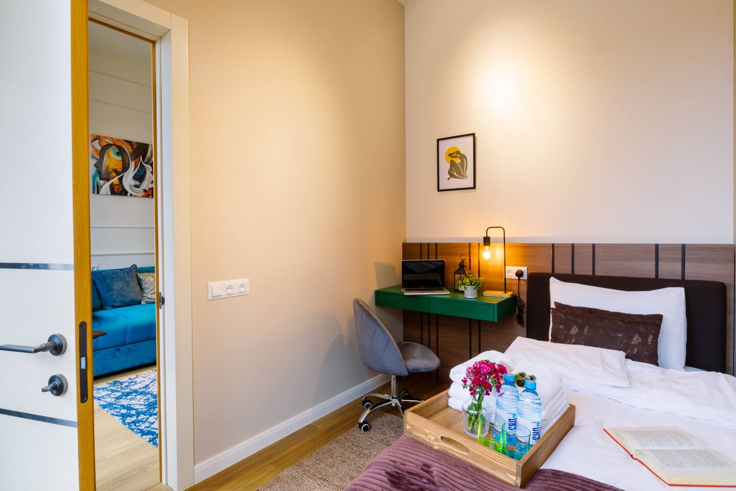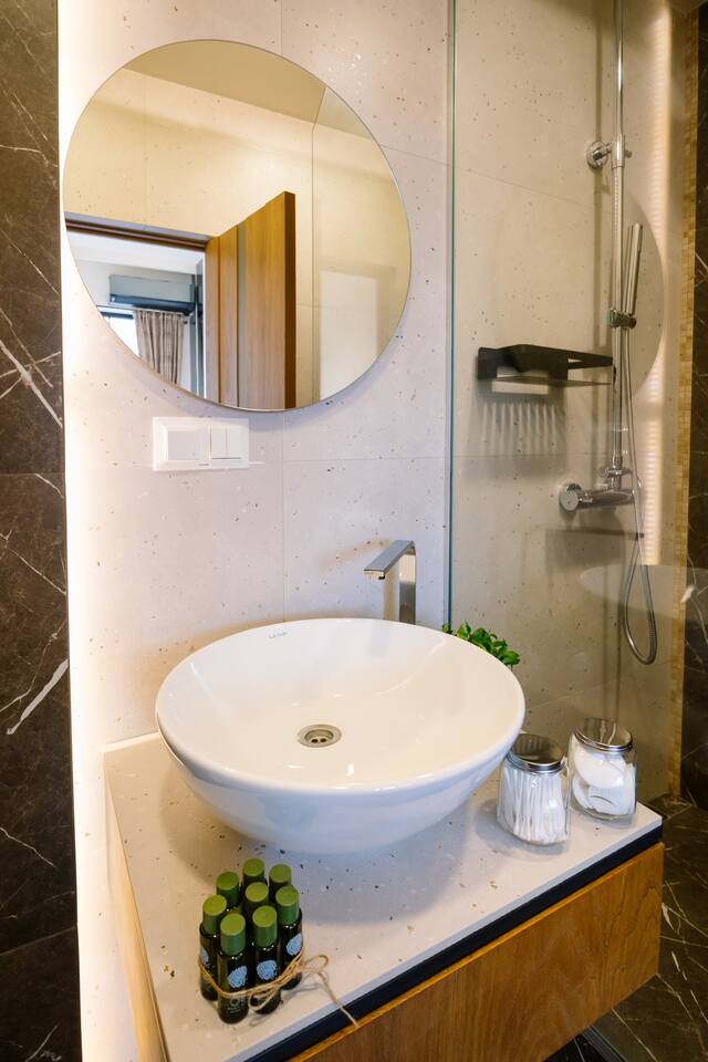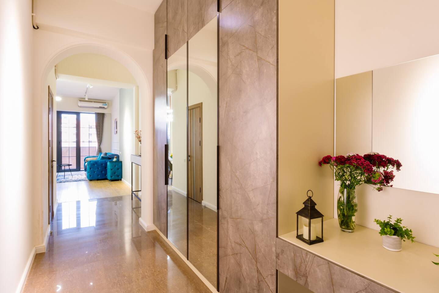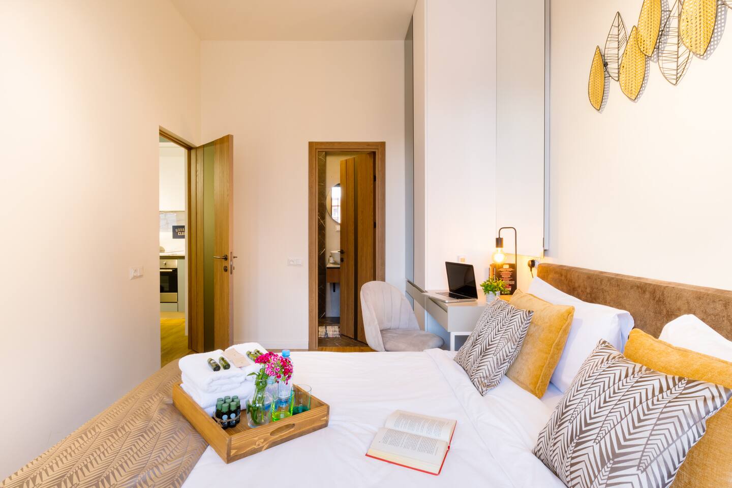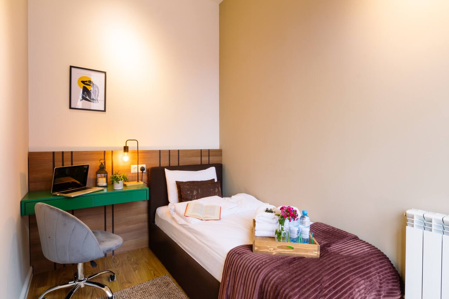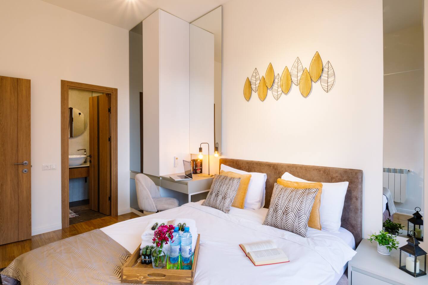 Welcome to our upscale retreat at 8 Teryan St, Yerevan - a brand-new building in a safe neighborhood with top-notch communal areas and new lifts. Experience the blend of luxury, comfort, and style as you step into our meticulously designed space. The living room, an open plan design shared with the kitchen, hosts a stunning electric blue 4-seater sofabed, perfectly positioned for the Smart HD TV with free Netflix. The unique blend of classic walls and a feature wall adorned with a mix of large stone-like porcelain tiles and wood makes a striking visual statement. Floor-to-ceiling doors grant access to the balcony, inviting abundant natural light in. Our kitchen is a culinary delight, equipped with an oven, hob, microwave, toaster, and coffee machine. A full-sized refrigerator and dining area for 4 make meal times a pleasure. The master bedroom oozes elegance, boasting exceptional décor, a high-quality mattress, plush pillows, and a convenient workspace. It has access to both the balcony and an en-suite bathroom, which features a shower cabin with excellent water pressure and premium shower sets and taps. The second bedroom is compact yet comfortable, furnished with a single bed, a desk, and offers access to both the living room and balcony. The main bathroom doesn't compromise on quality - enjoy a refreshing experience in the well-sized shower cabin, equipped with a top-grade shower set. The balcony, furnished with an outdoor seating arrangement for two, offers splendid views. It's an ideal spot to enjoy an evening glass of wine, embracing the vibrant vibes of Yerevan. Every inch of this space is touched with premium materials to give you a luxurious feel throughout your stay. Don't miss out on this one-of-a-kind experience!