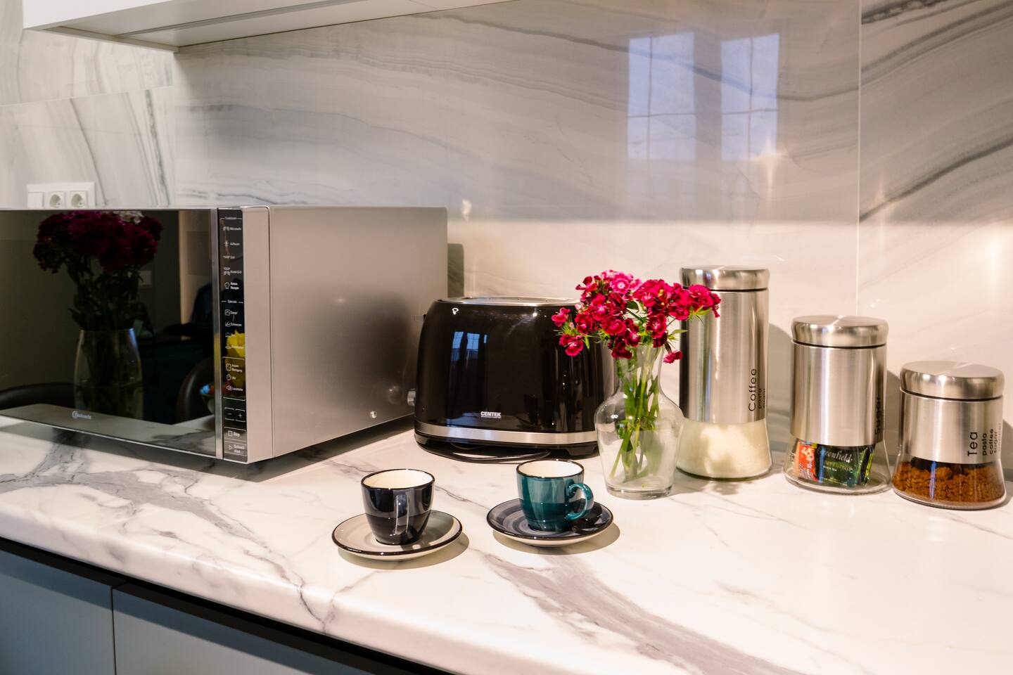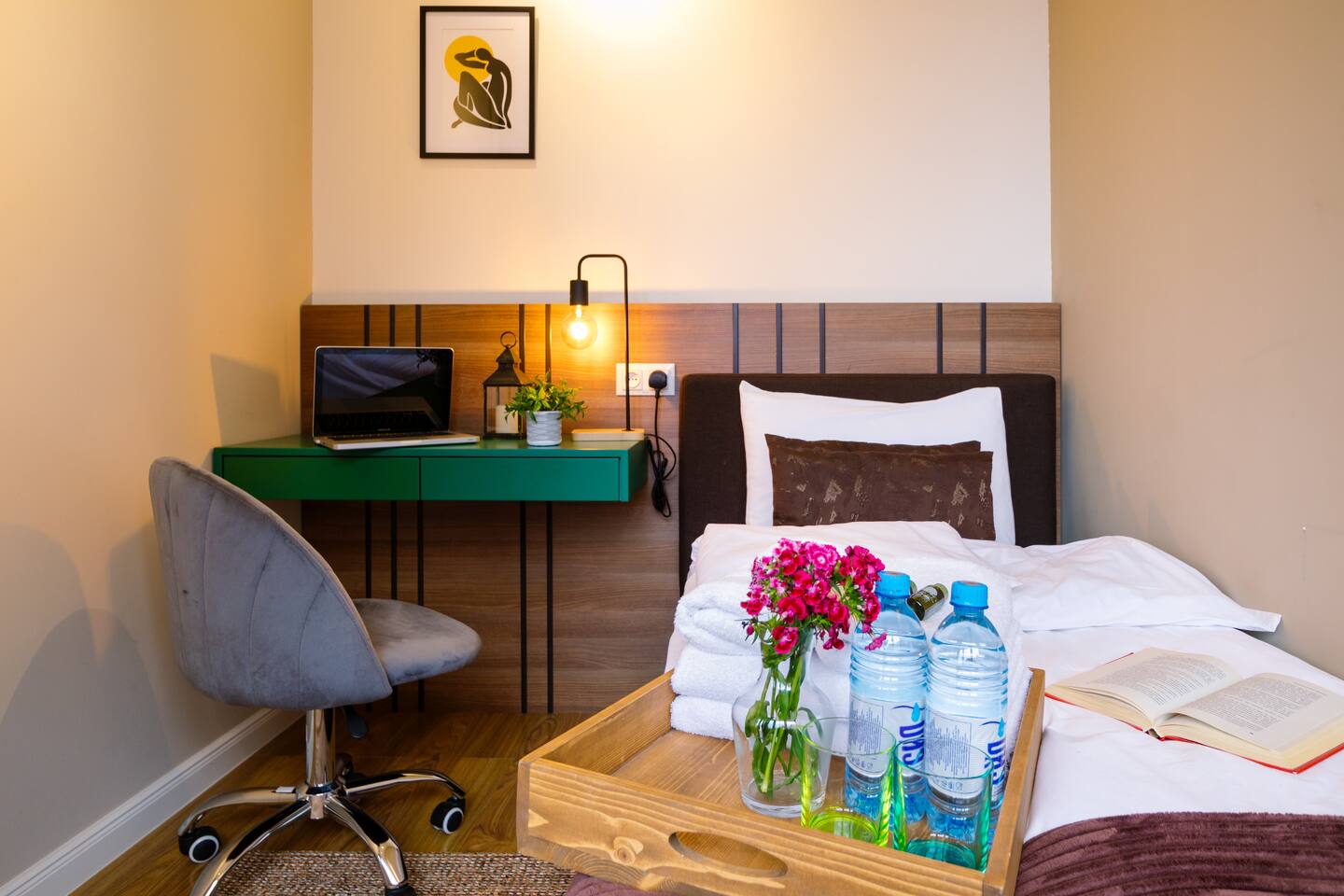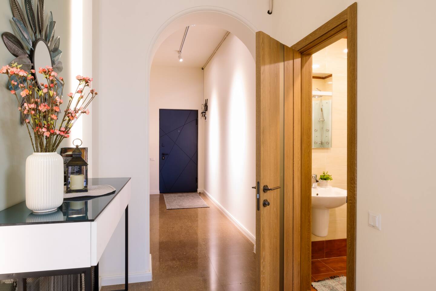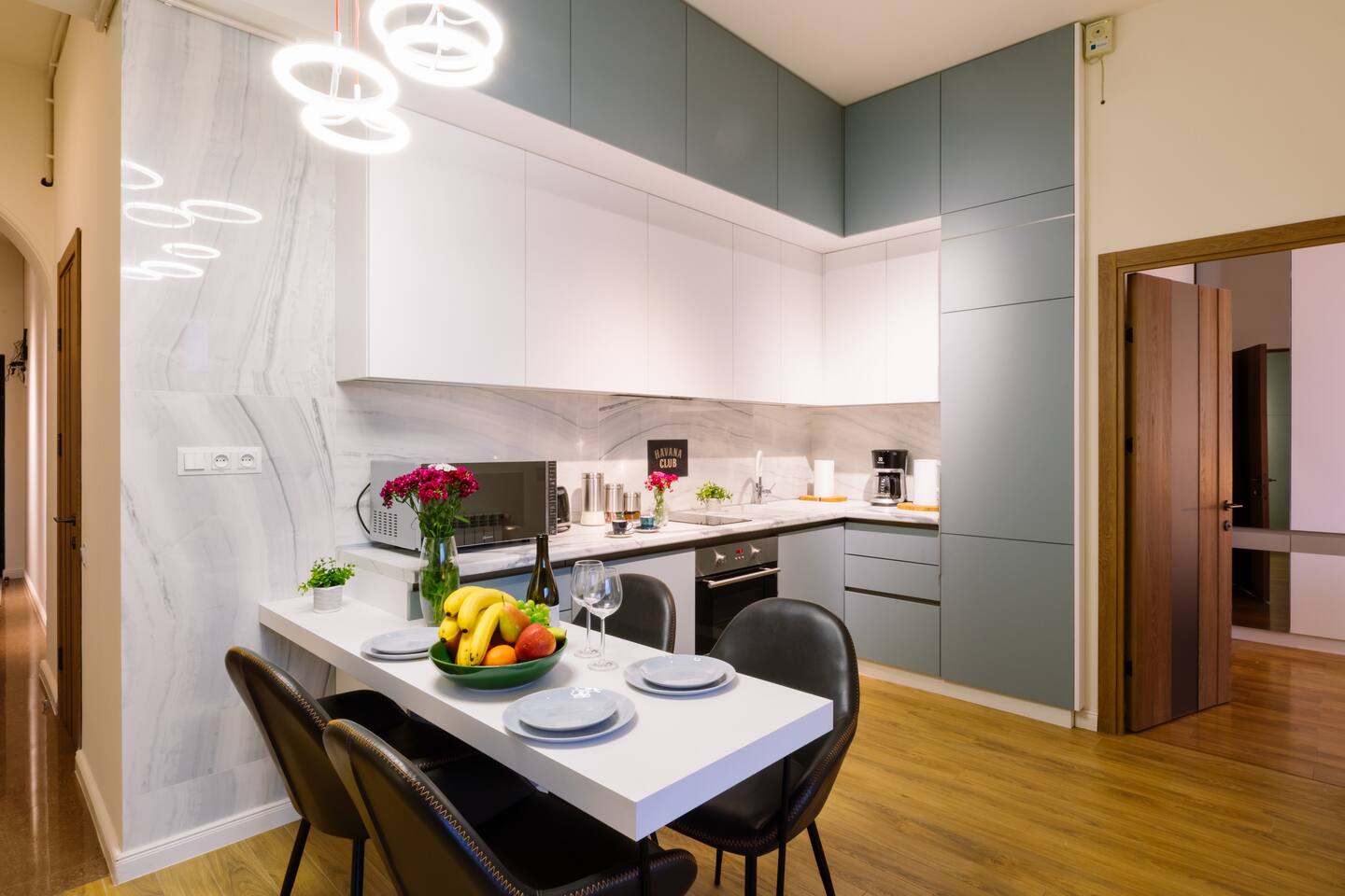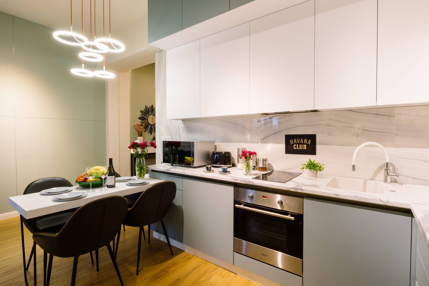 Welcome to our upscale retreat at 8 Teryan St, Yerevan - a brand-new building in a safe neighborhood with top-notch communal areas and new lifts. Experience the blend of luxury, comfort, and style as you step into our meticulously designed space. The living room, an open plan design shared with the kitchen, hosts a stunning electric blue 4-seater sofabed, perfectly positioned for the Smart HD TV with free Netflix. The unique blend of classic walls and a feature wall adorned with a mix of large stone-like porcelain tiles and wood makes a striking visual statement. Floor-to-ceiling doors grant access to the balcony, inviting abundant natural light in. Our kitchen is a culinary delight, equipped with an oven, hob, microwave, toaster, and coffee machine. A full-sized refrigerator and dining area for 4 make meal times a pleasure. The master bedroom oozes elegance, boasting exceptional décor, a high-quality mattress, plush pillows, and a convenient workspace. It has access to both the balcony and an en-suite bathroom, which features a shower cabin with excellent water pressure and premium shower sets and taps. The second bedroom is compact yet comfortable, furnished with a single bed, a desk, and offers access to both the living room and balcony. The main bathroom doesn't compromise on quality - enjoy a refreshing experience in the well-sized shower cabin, equipped with a top-grade shower set. The balcony, furnished with an outdoor seating arrangement for two, offers splendid views. It's an ideal spot to enjoy an evening glass of wine, embracing the vibrant vibes of Yerevan. Every inch of this space is touched with premium materials to give you a luxurious feel throughout your stay. Don't miss out on this one-of-a-kind experience!