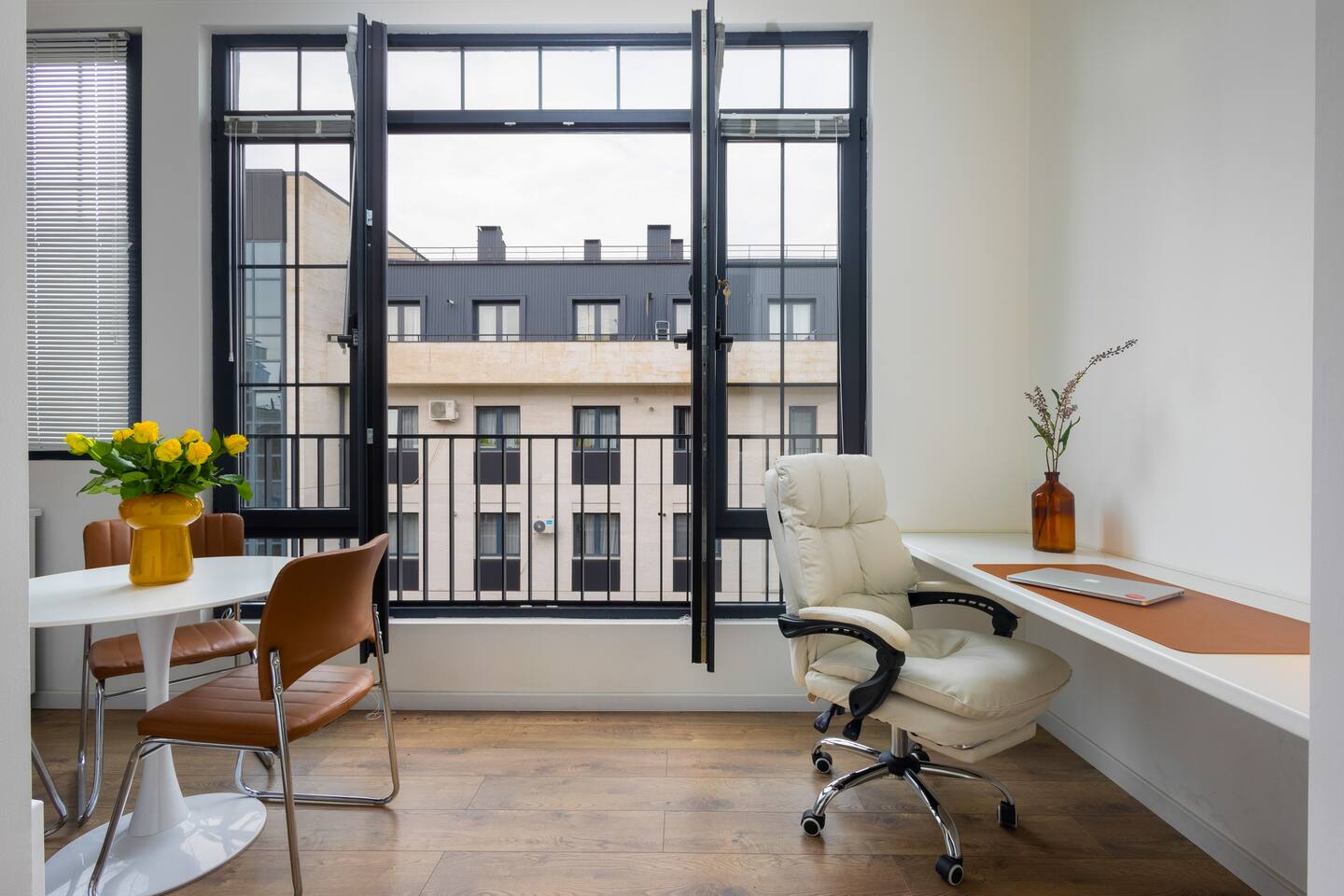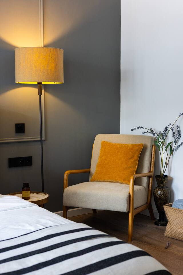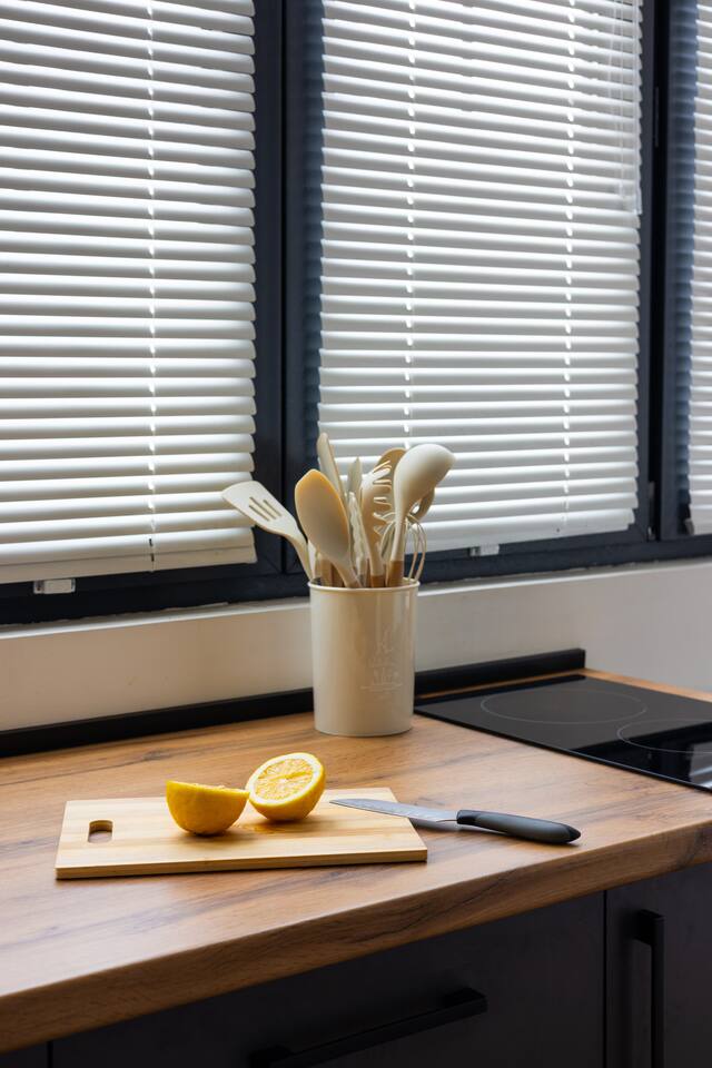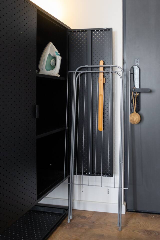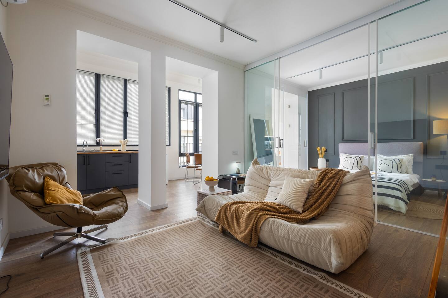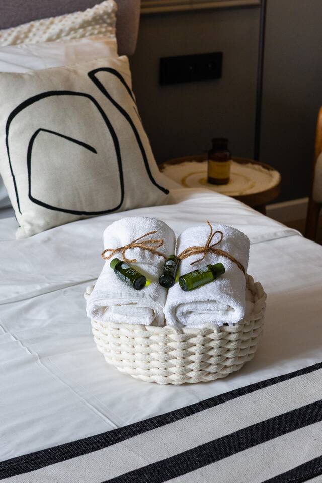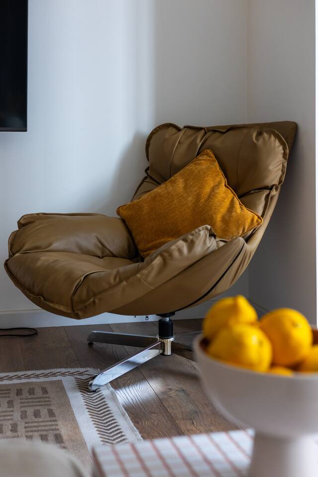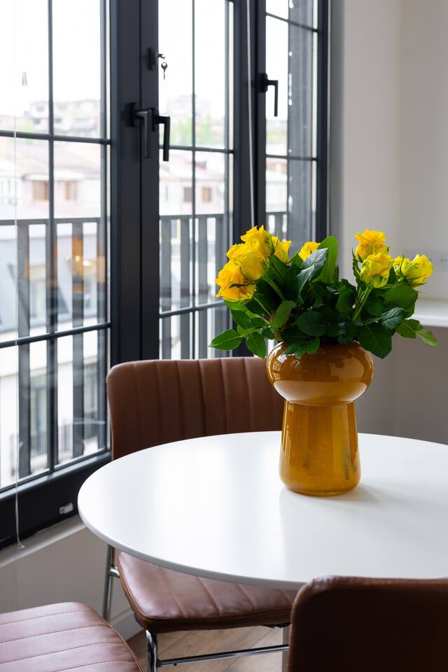 Welcome to Muse by Hotelise – Where Design Speaks and Space Breathes Every piece in Muse has been thoughtfully selected by its owner and designers to create a space that feels airy, artistic, and intimate. Bathed in whites and soft tones, this Scandinavian-style studio blends vintage flair with modern edges, giving it both character and comfort. The open-plan layout flows easily, with glass sliders defining the bedroom area. A super comfy sofa faces the large Smart TV, anchored by a bold piece of art that makes the whole room feel alive. Every furniture item — from the white round dining table to the leather-like chairs — is both functional and full of personality. The kitchen is fully equipped, featuring a dishwasher, microwave, oven, stove, fridge, and washer — all wrapped in clean, modern cabinetry. Top-to-bottom windows flood the space with natural light and open up to a French balcony, where you’ll also find a working desk and a stylish chair, ideal for remote work or a quiet creative moment. The 160x200 bed offers comfort with layered lighting options, while the bathroom is sleek and modern, with grey tiles, a black shower set, LED-lit mirror, and a powerful hairdryer. Muse is more than a stay — it’s a mood. A space to think, create, relax, and feel inspired.