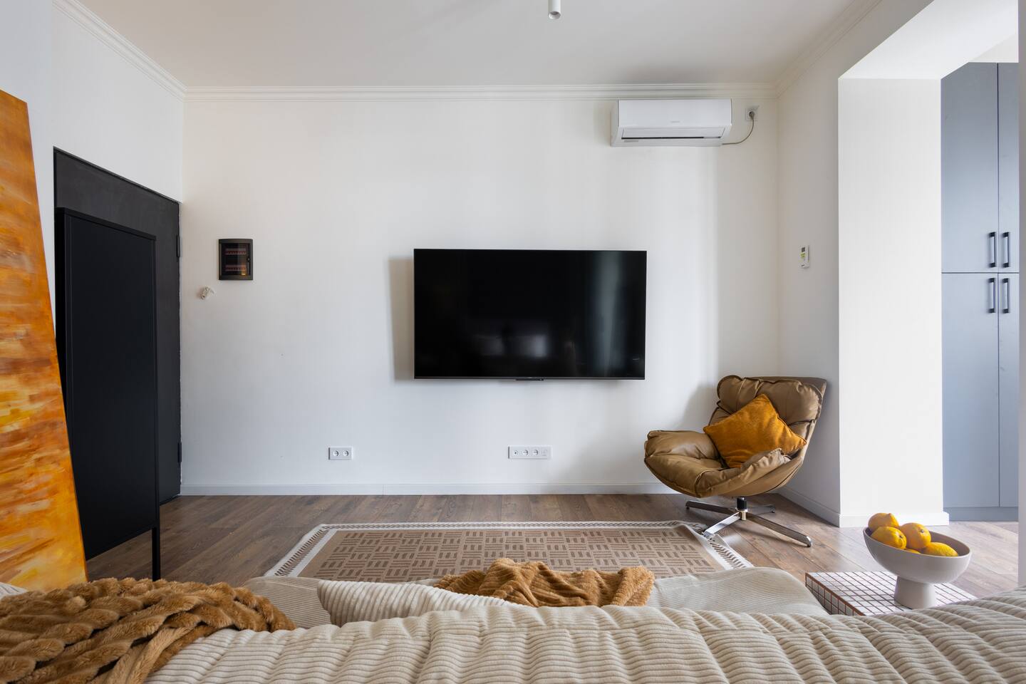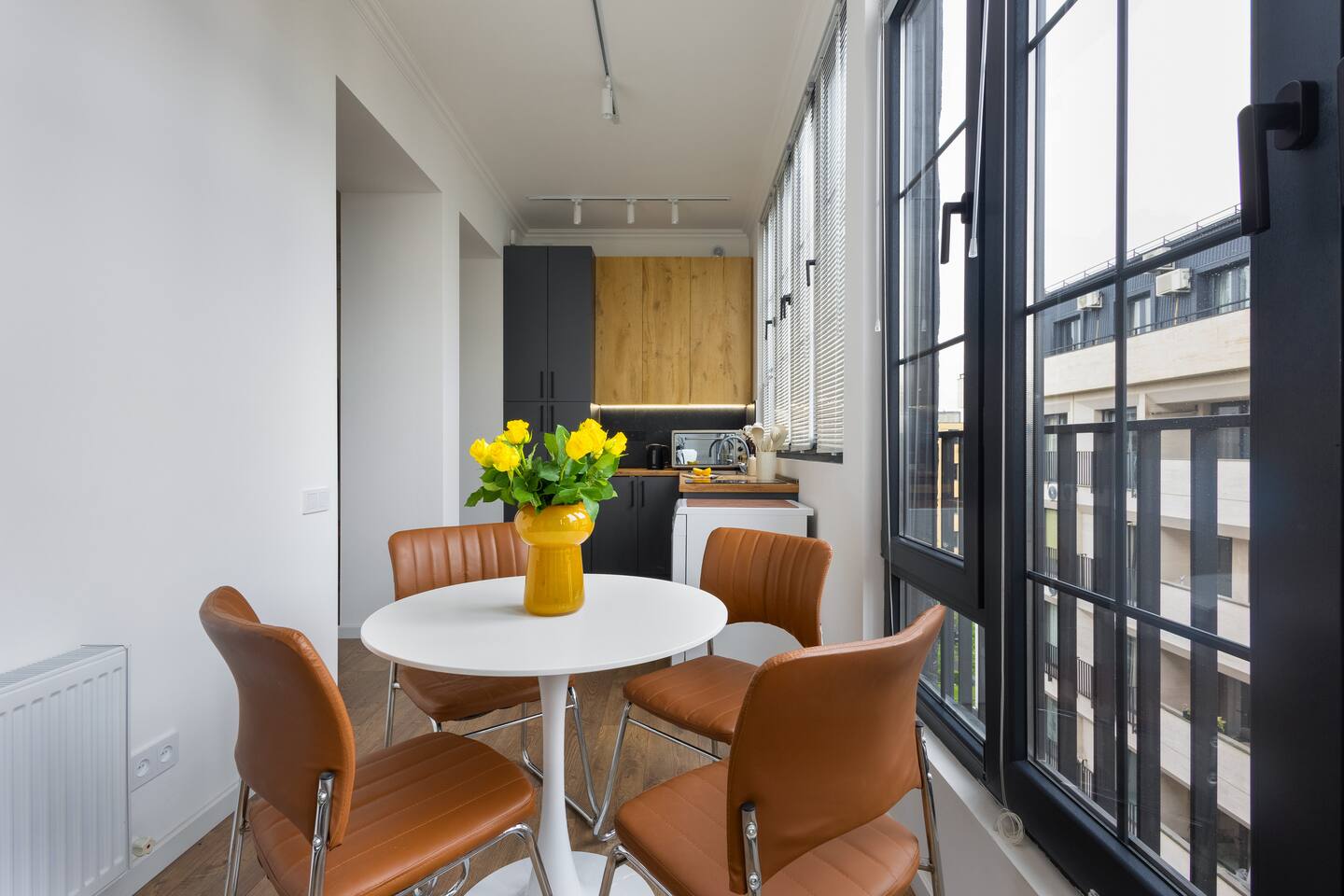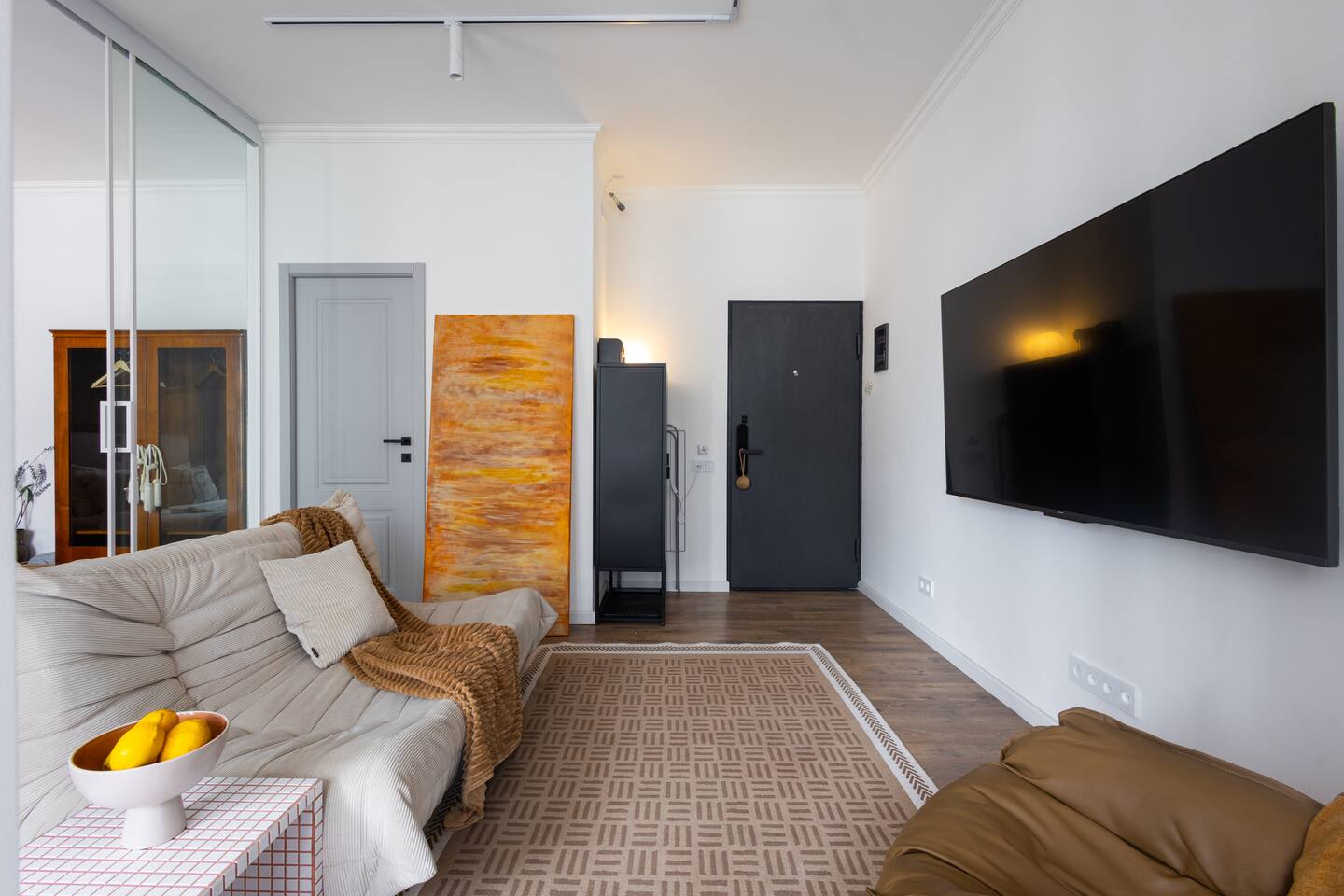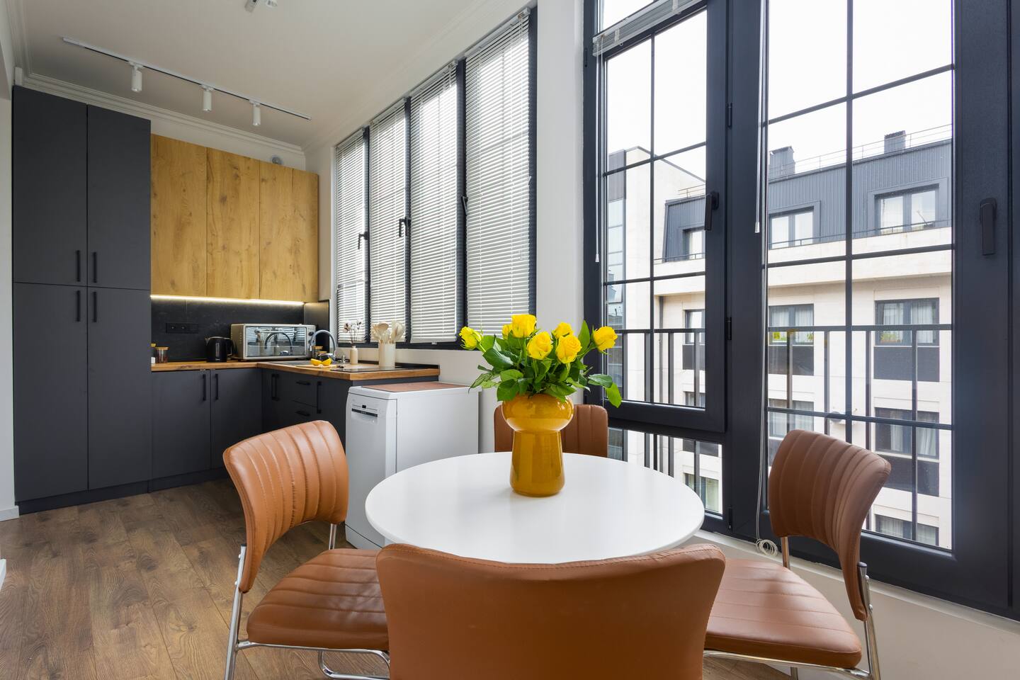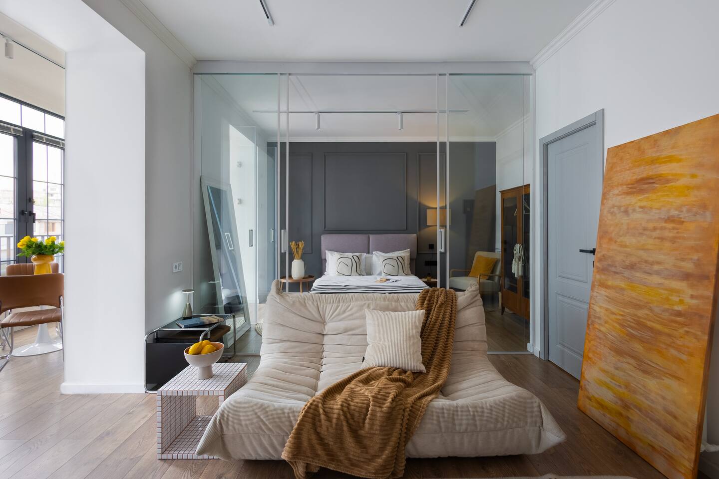 Welcome to Muse by Hotelise – Where Design Speaks and Space Breathes Every piece in Muse has been thoughtfully selected by its owner and designers to create a space that feels airy, artistic, and intimate. Bathed in whites and soft tones, this Scandinavian-style studio blends vintage flair with modern edges, giving it both character and comfort. The open-plan layout flows easily, with glass sliders defining the bedroom area. A super comfy sofa faces the large Smart TV, anchored by a bold piece of art that makes the whole room feel alive. Every furniture item — from the white round dining table to the leather-like chairs — is both functional and full of personality. The kitchen is fully equipped, featuring a dishwasher, microwave, oven, stove, fridge, and washer — all wrapped in clean, modern cabinetry. Top-to-bottom windows flood the space with natural light and open up to a French balcony, where you’ll also find a working desk and a stylish chair, ideal for remote work or a quiet creative moment. The 160x200 bed offers comfort with layered lighting options, while the bathroom is sleek and modern, with grey tiles, a black shower set, LED-lit mirror, and a powerful hairdryer. Muse is more than a stay — it’s a mood. A space to think, create, relax, and feel inspired.