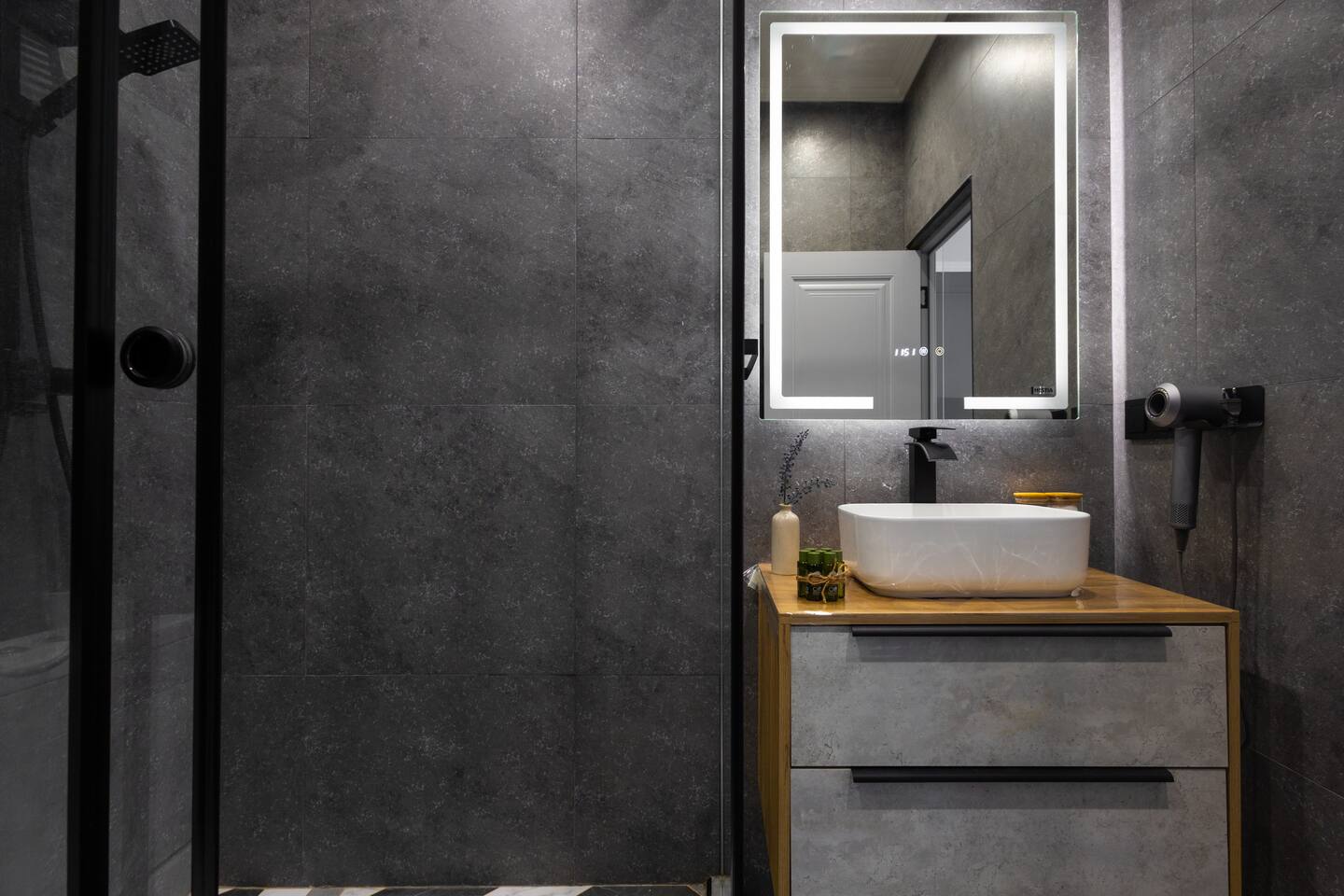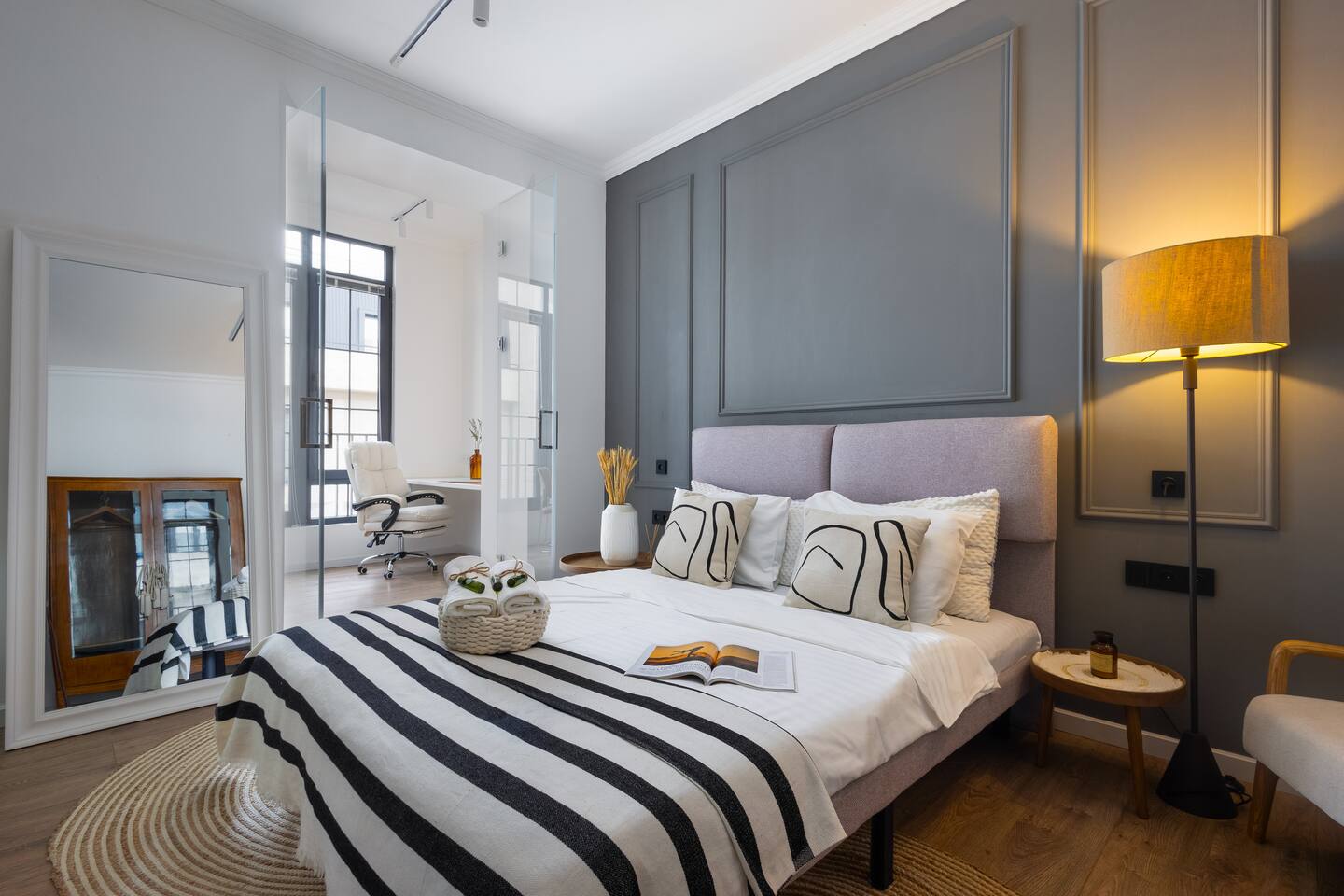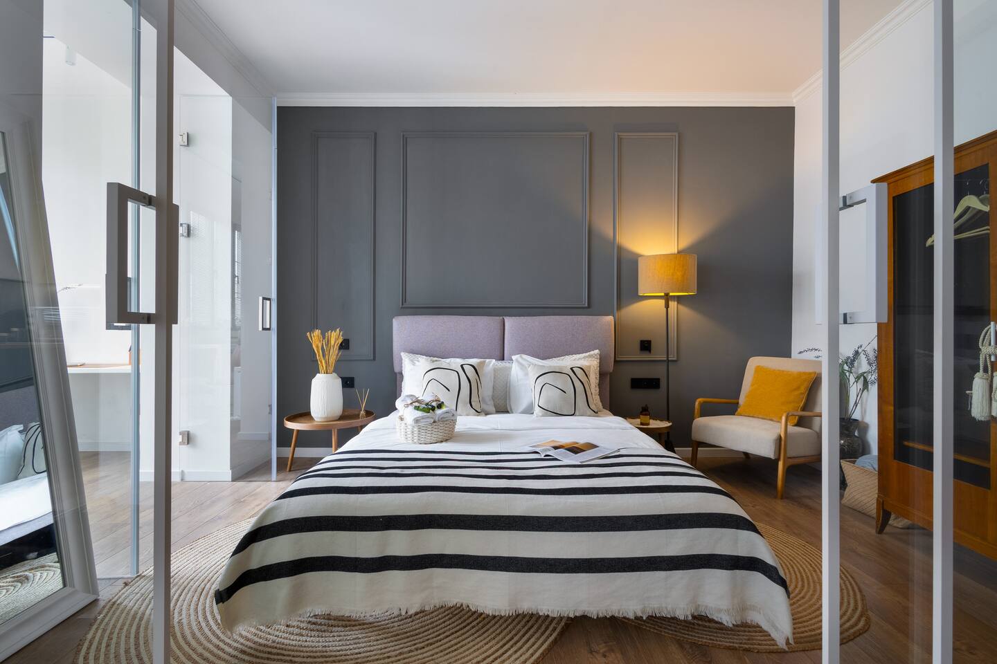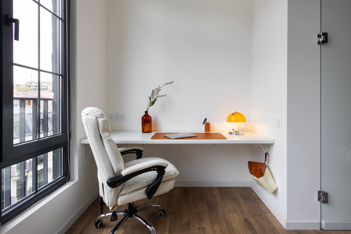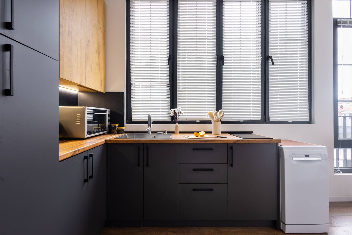 Welcome to Muse by Hotelise – Where Design Speaks and Space Breathes Every piece in Muse has been thoughtfully selected by its owner and designers to create a space that feels airy, artistic, and intimate. Bathed in whites and soft tones, this Scandinavian-style studio blends vintage flair with modern edges, giving it both character and comfort. The open-plan layout flows easily, with glass sliders defining the bedroom area. A super comfy sofa faces the large Smart TV, anchored by a bold piece of art that makes the whole room feel alive. Every furniture item — from the white round dining table to the leather-like chairs — is both functional and full of personality. The kitchen is fully equipped, featuring a dishwasher, microwave, oven, stove, fridge, and washer — all wrapped in clean, modern cabinetry. Top-to-bottom windows flood the space with natural light and open up to a French balcony, where you’ll also find a working desk and a stylish chair, ideal for remote work or a quiet creative moment. The 160x200 bed offers comfort with layered lighting options, while the bathroom is sleek and modern, with grey tiles, a black shower set, LED-lit mirror, and a powerful hairdryer. Muse is more than a stay — it’s a mood. A space to think, create, relax, and feel inspired.