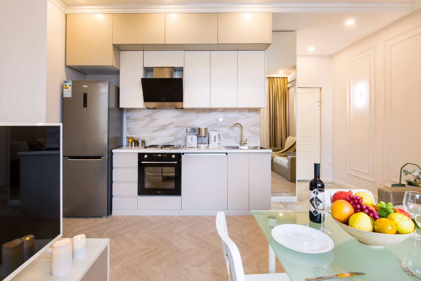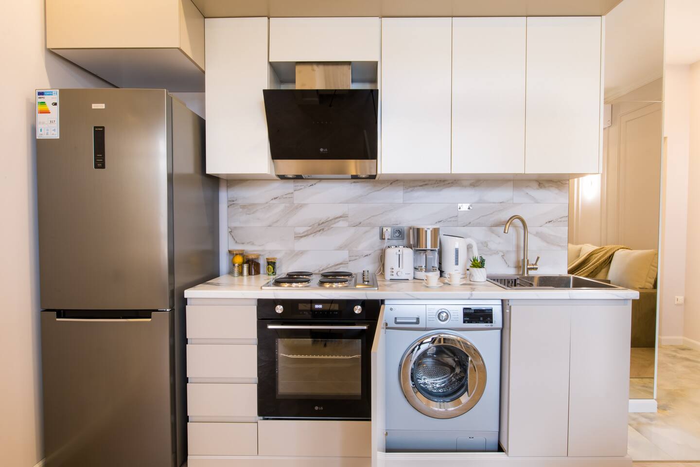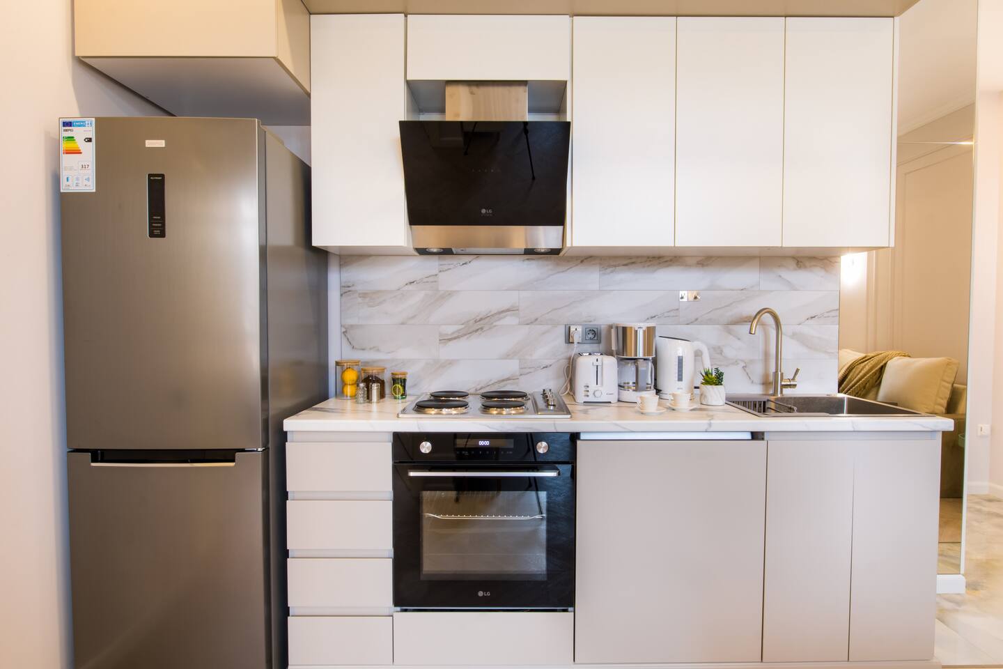 Welcome to "Olivia" by Hotelise, the perfect pairing to "Simona" next door, together offering the quintessential Hotelise experience. Designed for large groups, these neighboring apartments combine luxury, comfort, and modern convenience in a seamless manner. Building: "Olivia" is housed in a brand-new, premium building, equipped with multiple modern lifts, ensuring a smooth and convenient stay. The building is well-maintained, clean, and serviced to meet Hotelise's high standards. Living Room: The apartment features an open-plan living room with an integrated kitchen. The living area includes a sofabed and a dining table suitable for 4 people. Floor-to-ceiling glass doors open onto the balcony, and the abundant windows fill the space with natural light, creating an airy and bright atmosphere. The TV zone is equipped with a smart TV and a complimentary Netflix subscription, a standard in all Hotelise apartments. Kitchen: The kitchen is fully equipped to cater to all your culinary needs. It boasts a large fridge, an oven, a 4-burner electric stove, an extractor, a kettle, a toaster, and a coffee machine. Ample storage and a fully stocked kitchen ensure a hassle-free cooking experience. Bedroom: The bedroom is a haven of light and airiness, thanks to the top-to-bottom windows. It features side tables with lamps, perfect for reading, and blackout curtains to ensure a restful sleep. Bathroom: The bathroom is fresh and modern, with premium tiles and a premium shower set that provides good water pressure. Ample storage space is available, and, as always, Hotelise provides organic and sustainable hotel-quality toiletries from GFL Italy. Balcony: The balcony offers amazing views and a breath of fresh air, overlooking the football stadium. It's the perfect spot for enjoying morning coffees or evening wines, with a view that makes these moments truly special. "Olivia" is not just an apartment; it's an experience of refined urban living, offering everything you need for a memorable stay in the heart of the city.