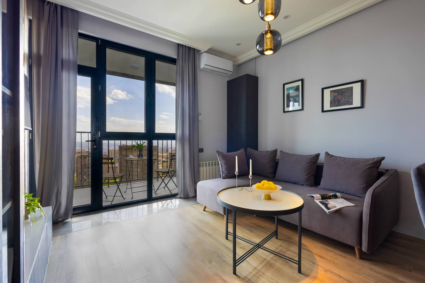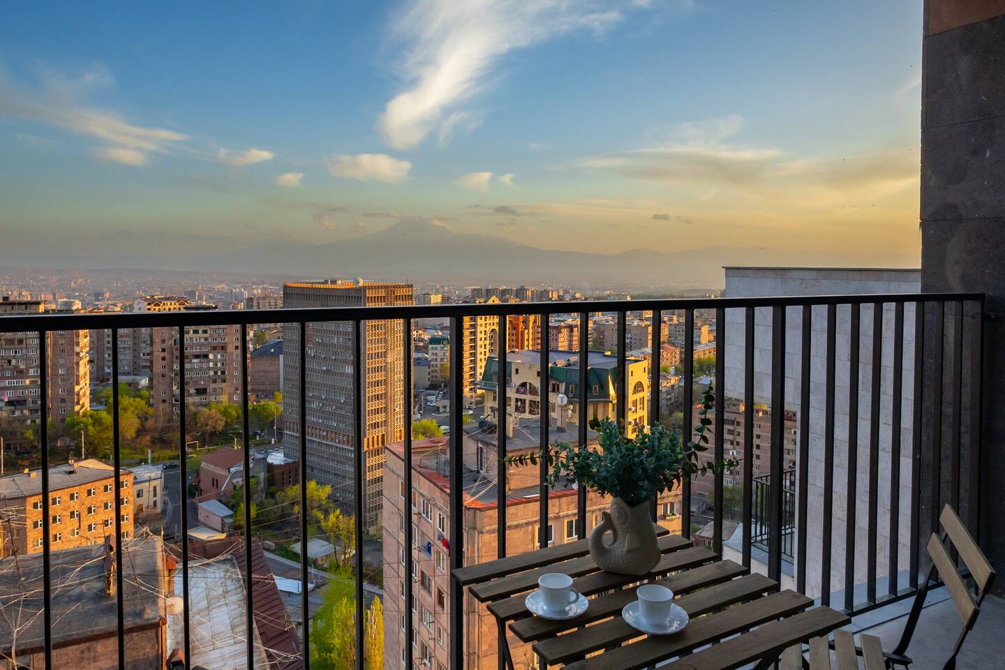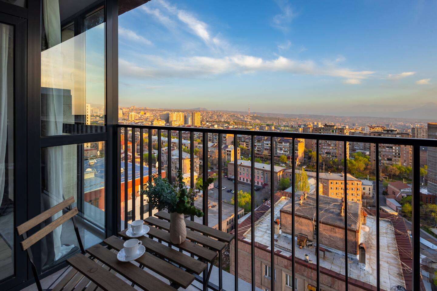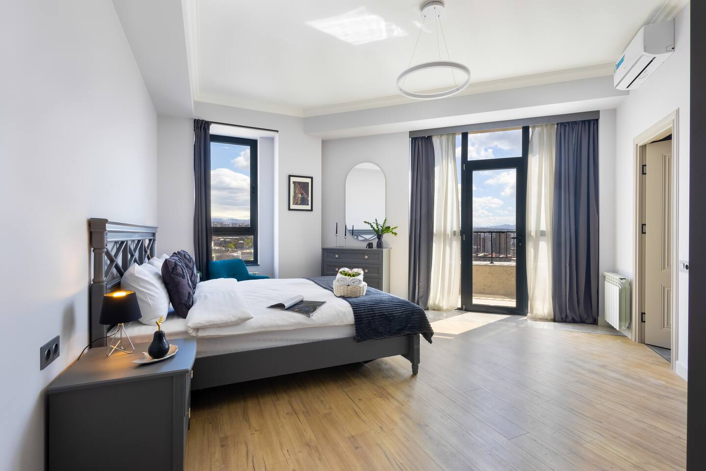 Welcome to Panora by Hotelise – Penthouse Living Above Yerevan Building: Panora is located in a brand-new building on Mamikonyants Street, 45/1, right at the top — the 15th floor penthouse. The apartment is newly refurbished with premium materials and custom-designed furniture, offering a clean, modern feel while maximizing comfort and style. Living Room & Kitchen: Step into a bright, open-plan living space featuring a large L-shaped sofabed facing the entertainment zone with a Smart TV. To the right, a balcony with outdoor furniture invites you for morning coffee or evening wine, surrounded by incredible city views. The living area flows naturally into the kitchen and dining space, where a large dining table connects beautifully to a fully equipped modern kitchen. You’ll find a dishwasher, oven, stove, extractor fan, high-end cabinets, and plenty of storage — everything set up for effortless living. Powerful AC keeps the space cool and comfortable year-round. Bedroom 1: This master bedroom feels like a dream — incredibly spacious, flooded with natural light, and lined with panoramic windows offering stunning views across Yerevan. It features direct access to the balcony, blackout curtains, AC, a walk-in wardrobe, and additional fitted wardrobes. The sense of openness and luxury gives this room the vibe of a celebrity suite. Bedroom 2: A comfortable second bedroom fitted with a single bed, workspace with a desk, storage units, and floor-to-ceiling windows leading to the balcony. Like the master, it comes with AC and modern built-in wardrobes, making it a perfect second bedroom for work or relaxation. Bathroom 1: Finished with premium tiles and fittings, this stylish bathroom includes a large shower cabin, LED-lit mirror, and thoughtful storage space — everything fresh, functional, and spotless. Bathroom 2: Equally premium, this second bathroom features a bathtub for when you feel like a soak, along with a washer and dryer, LED mirror, and more sleek storage. Perfect for longer stays or families. Balconies: This apartment isn’t just about living — it’s about experiencing Yerevan from above. The two balconies offer breathtaking, panoramic views of the city skyline and mountains beyond. Whether it’s sunrise coffees or sunset wines, the atmosphere here is something you’ll remember long after your stay. At Hotelise, we don’t just offer accommodation — we offer living, feeling, and creating memories. Panora is your chance to touch the sky above Yerevan and live the city from a truly spectacular perspective. Welcome home!