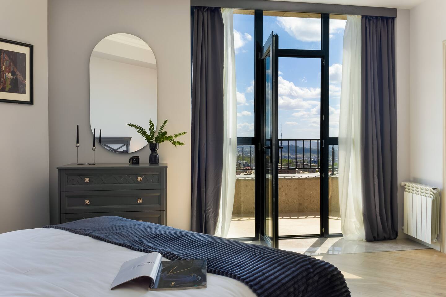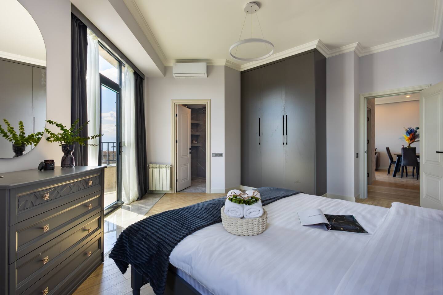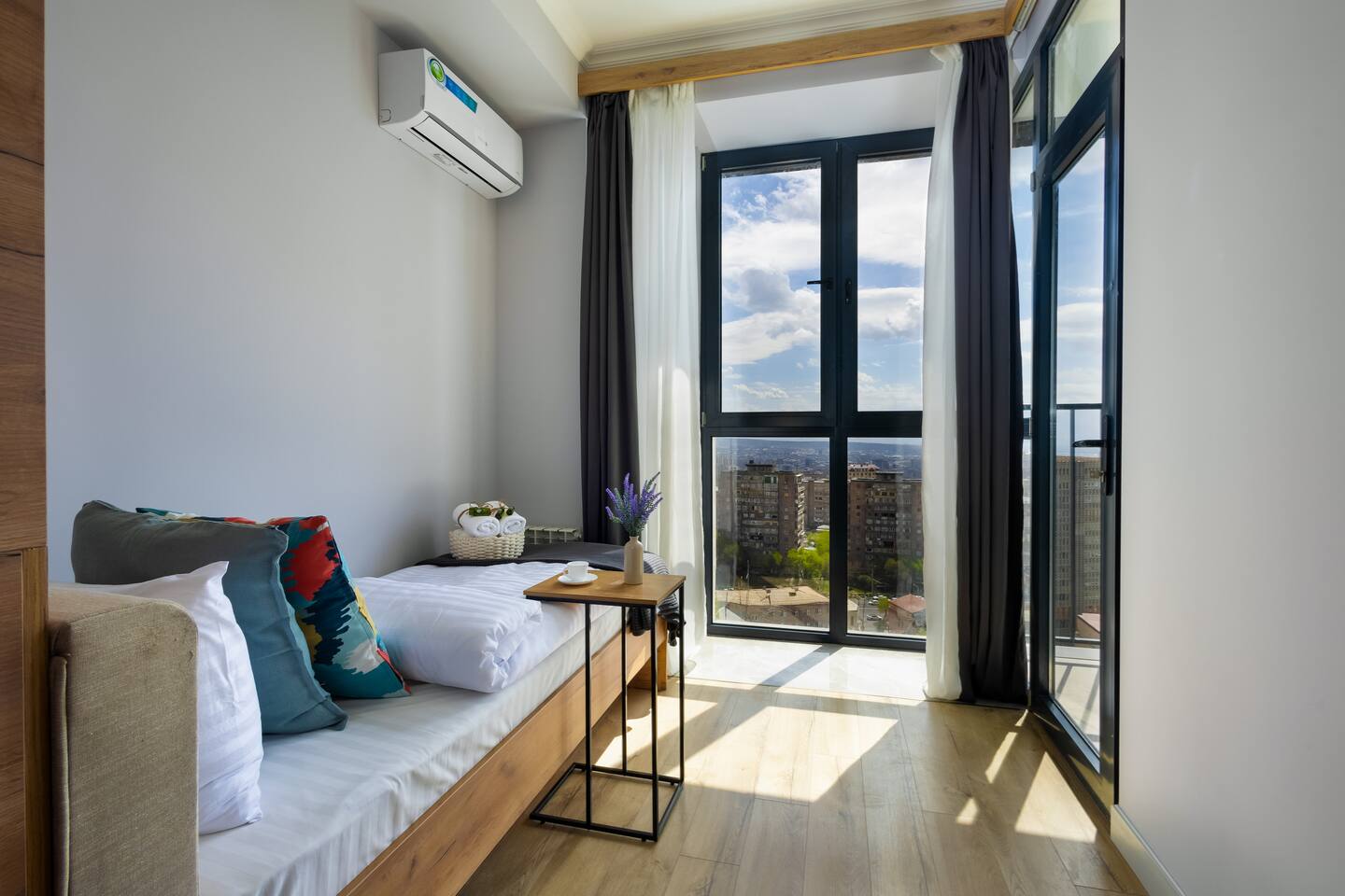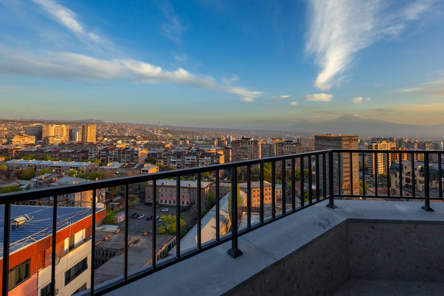 Welcome to Panora by Hotelise – Penthouse Living Above Yerevan Building: Panora is located in a brand-new building on Mamikonyants Street, 45/1, right at the top — the 15th floor penthouse. The apartment is newly refurbished with premium materials and custom-designed furniture, offering a clean, modern feel while maximizing comfort and style. Living Room & Kitchen: Step into a bright, open-plan living space featuring a large L-shaped sofabed facing the entertainment zone with a Smart TV. To the right, a balcony with outdoor furniture invites you for morning coffee or evening wine, surrounded by incredible city views. The living area flows naturally into the kitchen and dining space, where a large dining table connects beautifully to a fully equipped modern kitchen. You’ll find a dishwasher, oven, stove, extractor fan, high-end cabinets, and plenty of storage — everything set up for effortless living. Powerful AC keeps the space cool and comfortable year-round. Bedroom 1: This master bedroom feels like a dream — incredibly spacious, flooded with natural light, and lined with panoramic windows offering stunning views across Yerevan. It features direct access to the balcony, blackout curtains, AC, a walk-in wardrobe, and additional fitted wardrobes. The sense of openness and luxury gives this room the vibe of a celebrity suite. Bedroom 2: A comfortable second bedroom fitted with a single bed, workspace with a desk, storage units, and floor-to-ceiling windows leading to the balcony. Like the master, it comes with AC and modern built-in wardrobes, making it a perfect second bedroom for work or relaxation. Bathroom 1: Finished with premium tiles and fittings, this stylish bathroom includes a large shower cabin, LED-lit mirror, and thoughtful storage space — everything fresh, functional, and spotless. Bathroom 2: Equally premium, this second bathroom features a bathtub for when you feel like a soak, along with a washer and dryer, LED mirror, and more sleek storage. Perfect for longer stays or families. Balconies: This apartment isn’t just about living — it’s about experiencing Yerevan from above. The two balconies offer breathtaking, panoramic views of the city skyline and mountains beyond. Whether it’s sunrise coffees or sunset wines, the atmosphere here is something you’ll remember long after your stay. At Hotelise, we don’t just offer accommodation — we offer living, feeling, and creating memories. Panora is your chance to touch the sky above Yerevan and live the city from a truly spectacular perspective. Welcome home!
