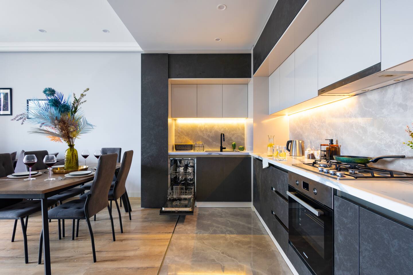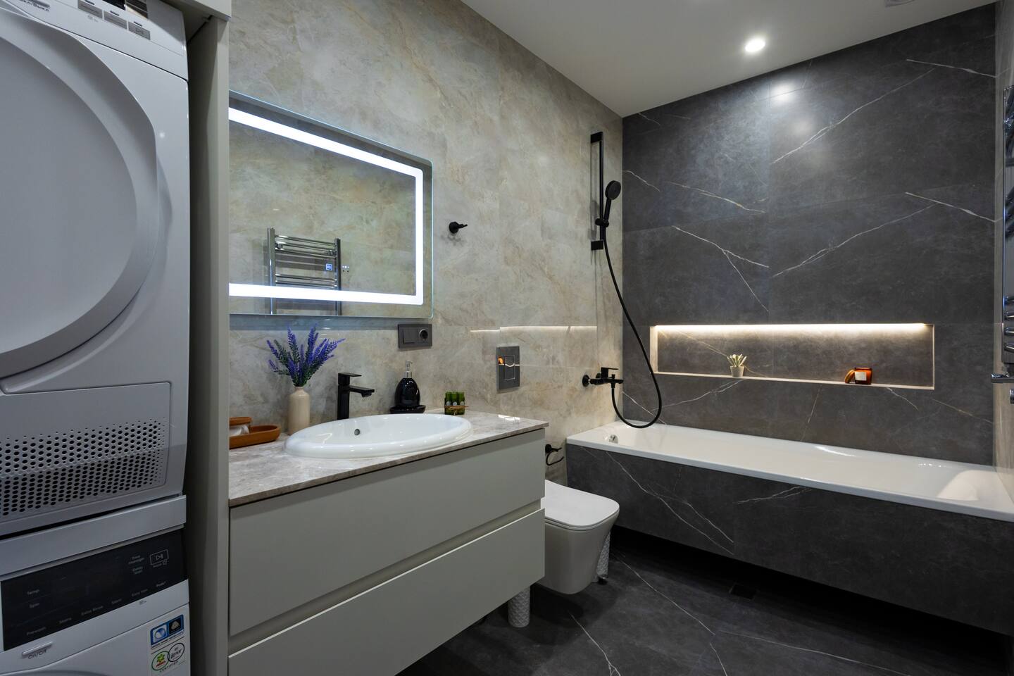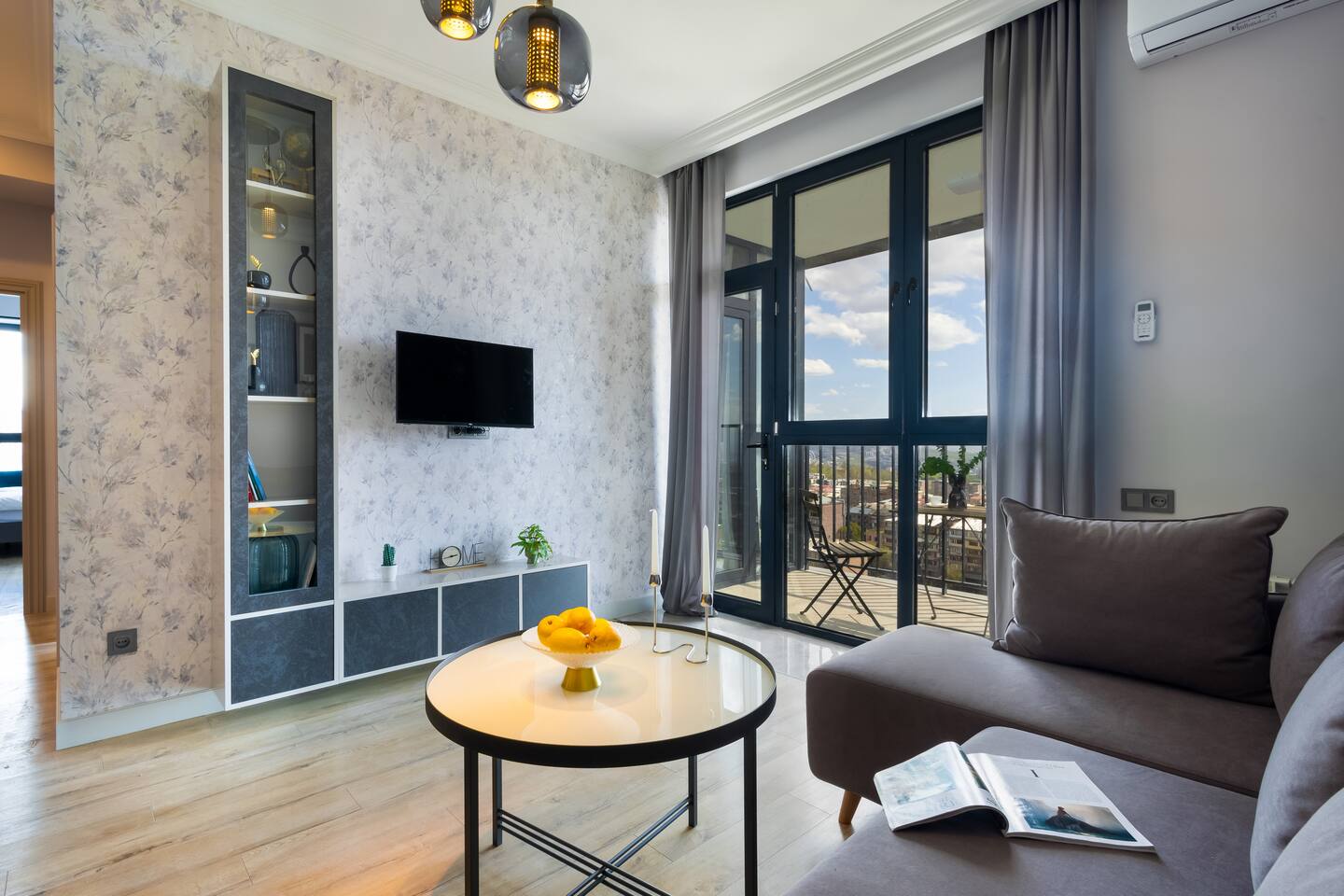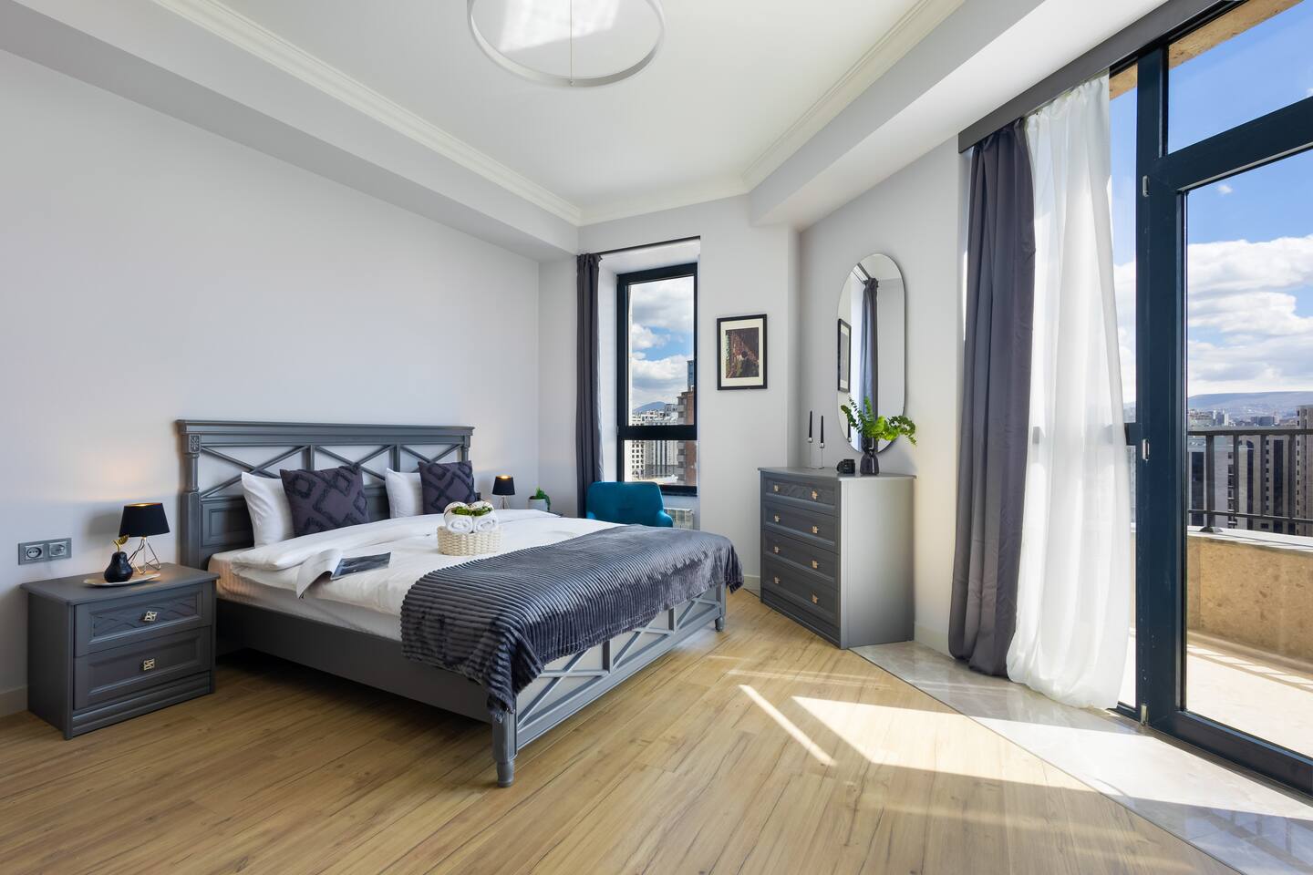 Welcome to Panora by Hotelise – Penthouse Living Above Yerevan Building: Panora is located in a brand-new building on Mamikonyants Street, 45/1, right at the top — the 15th floor penthouse. The apartment is newly refurbished with premium materials and custom-designed furniture, offering a clean, modern feel while maximizing comfort and style. Living Room & Kitchen: Step into a bright, open-plan living space featuring a large L-shaped sofabed facing the entertainment zone with a Smart TV. To the right, a balcony with outdoor furniture invites you for morning coffee or evening wine, surrounded by incredible city views. The living area flows naturally into the kitchen and dining space, where a large dining table connects beautifully to a fully equipped modern kitchen. You’ll find a dishwasher, oven, stove, extractor fan, high-end cabinets, and plenty of storage — everything set up for effortless living. Powerful AC keeps the space cool and comfortable year-round. Bedroom 1: This master bedroom feels like a dream — incredibly spacious, flooded with natural light, and lined with panoramic windows offering stunning views across Yerevan. It features direct access to the balcony, blackout curtains, AC, a walk-in wardrobe, and additional fitted wardrobes. The sense of openness and luxury gives this room the vibe of a celebrity suite. Bedroom 2: A comfortable second bedroom fitted with a single bed, workspace with a desk, storage units, and floor-to-ceiling windows leading to the balcony. Like the master, it comes with AC and modern built-in wardrobes, making it a perfect second bedroom for work or relaxation. Bathroom 1: Finished with premium tiles and fittings, this stylish bathroom includes a large shower cabin, LED-lit mirror, and thoughtful storage space — everything fresh, functional, and spotless. Bathroom 2: Equally premium, this second bathroom features a bathtub for when you feel like a soak, along with a washer and dryer, LED mirror, and more sleek storage. Perfect for longer stays or families. Balconies: This apartment isn’t just about living — it’s about experiencing Yerevan from above. The two balconies offer breathtaking, panoramic views of the city skyline and mountains beyond. Whether it’s sunrise coffees or sunset wines, the atmosphere here is something you’ll remember long after your stay. At Hotelise, we don’t just offer accommodation — we offer living, feeling, and creating memories. Panora is your chance to touch the sky above Yerevan and live the city from a truly spectacular perspective. Welcome home!