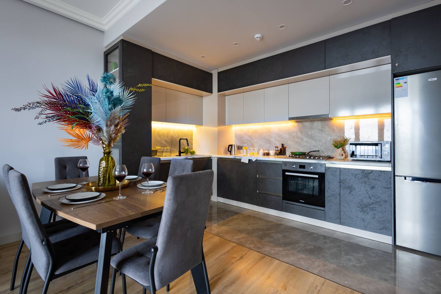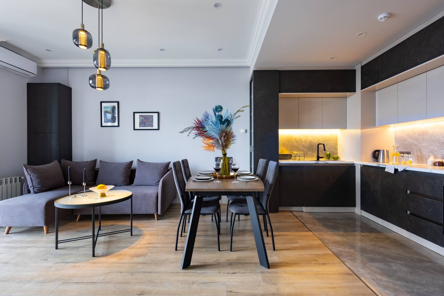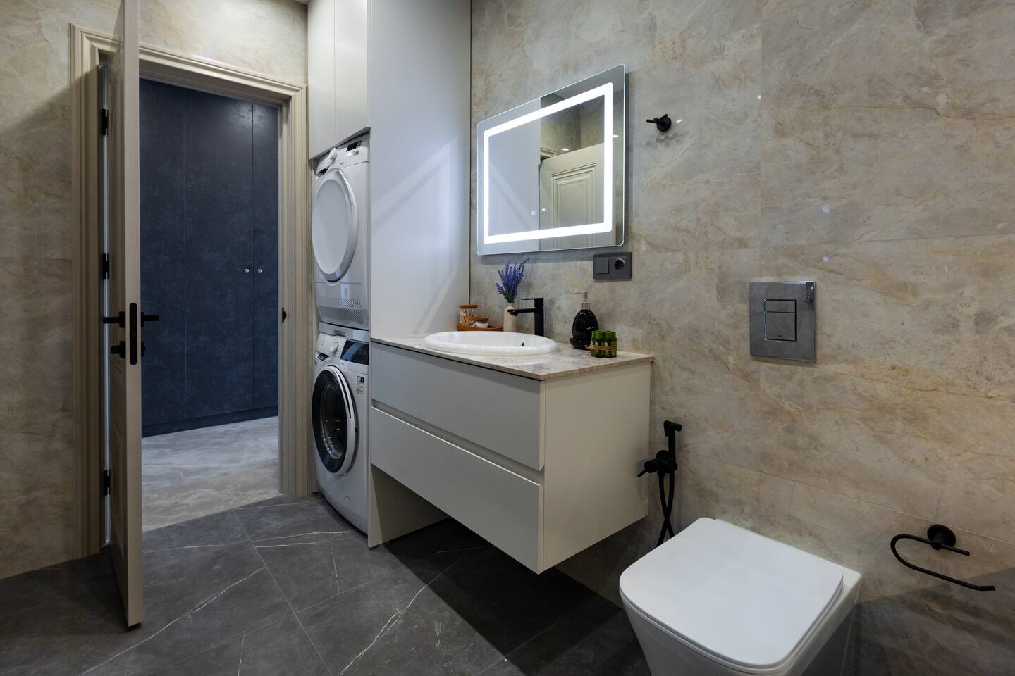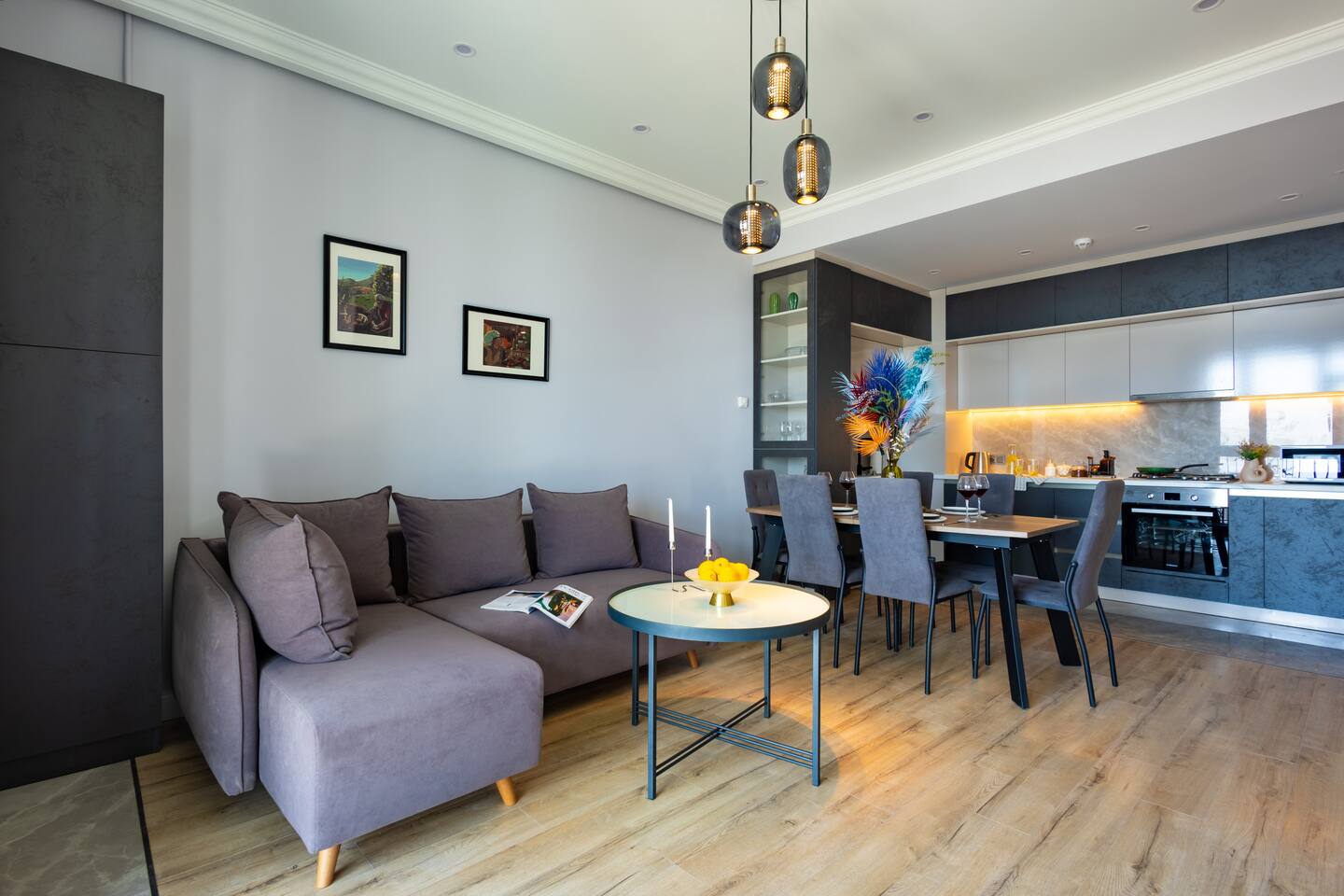 Welcome to Panora by Hotelise – Penthouse Living Above Yerevan Building: Panora is located in a brand-new building on Mamikonyants Street, 45/1, right at the top — the 15th floor penthouse. The apartment is newly refurbished with premium materials and custom-designed furniture, offering a clean, modern feel while maximizing comfort and style. Living Room & Kitchen: Step into a bright, open-plan living space featuring a large L-shaped sofabed facing the entertainment zone with a Smart TV. To the right, a balcony with outdoor furniture invites you for morning coffee or evening wine, surrounded by incredible city views. The living area flows naturally into the kitchen and dining space, where a large dining table connects beautifully to a fully equipped modern kitchen. You’ll find a dishwasher, oven, stove, extractor fan, high-end cabinets, and plenty of storage — everything set up for effortless living. Powerful AC keeps the space cool and comfortable year-round. Bedroom 1: This master bedroom feels like a dream — incredibly spacious, flooded with natural light, and lined with panoramic windows offering stunning views across Yerevan. It features direct access to the balcony, blackout curtains, AC, a walk-in wardrobe, and additional fitted wardrobes. The sense of openness and luxury gives this room the vibe of a celebrity suite. Bedroom 2: A comfortable second bedroom fitted with a single bed, workspace with a desk, storage units, and floor-to-ceiling windows leading to the balcony. Like the master, it comes with AC and modern built-in wardrobes, making it a perfect second bedroom for work or relaxation. Bathroom 1: Finished with premium tiles and fittings, this stylish bathroom includes a large shower cabin, LED-lit mirror, and thoughtful storage space — everything fresh, functional, and spotless. Bathroom 2: Equally premium, this second bathroom features a bathtub for when you feel like a soak, along with a washer and dryer, LED mirror, and more sleek storage. Perfect for longer stays or families. Balconies: This apartment isn’t just about living — it’s about experiencing Yerevan from above. The two balconies offer breathtaking, panoramic views of the city skyline and mountains beyond. Whether it’s sunrise coffees or sunset wines, the atmosphere here is something you’ll remember long after your stay. At Hotelise, we don’t just offer accommodation — we offer living, feeling, and creating memories. Panora is your chance to touch the sky above Yerevan and live the city from a truly spectacular perspective. Welcome home!