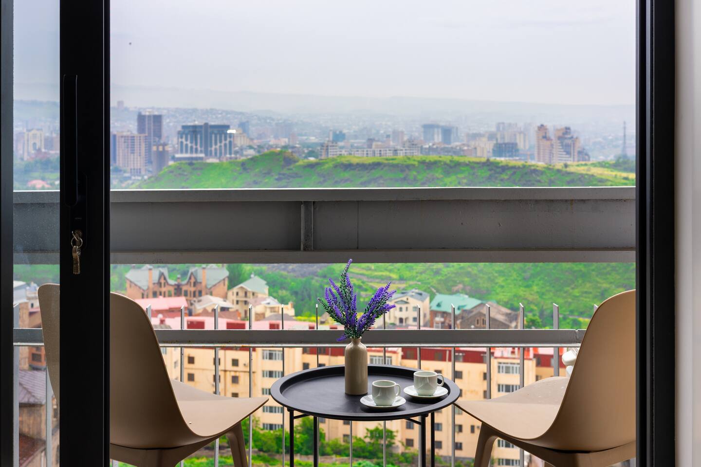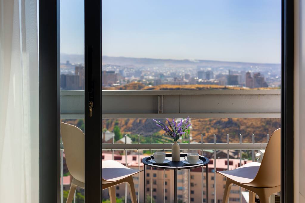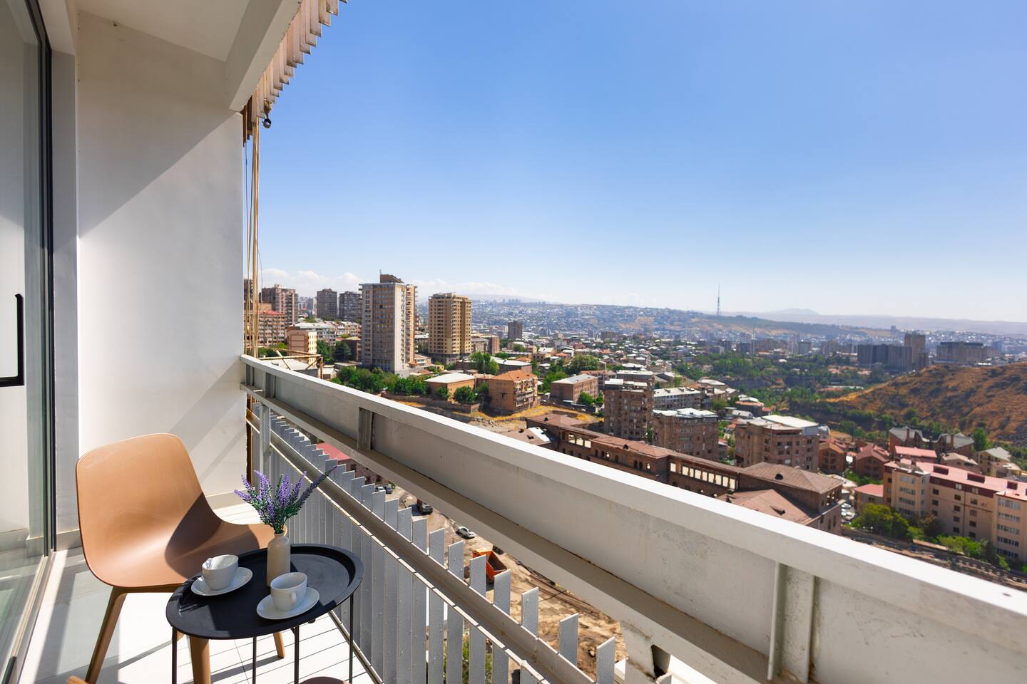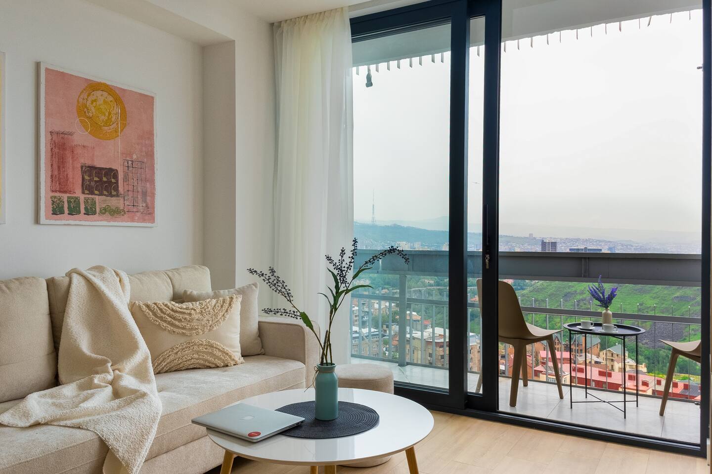 Perched on the 9th floor at 8 Orbeli Brothers Street, Pastel by Hotelise overlooks the breathtaking Hrazdan Canyon. With sweeping, unforgettable views and soft, designer touches throughout, this compact gem blends comfort, charm, and modern elegance — ideal for a romantic getaway or a stylish city break. ⸻ Living Room & Kitchen: Step into a light-filled open-plan living area where design meets comfort. A super comfy sofa (that easily turns into a bed) sits beneath custom wall art, with massive floor-to-ceiling sliding windows opening onto a private patio. The view? Simply breathtaking. The fully equipped kitchen has everything you need — from microwave, stove, and oven to an integrated large fridge and a sleek dishwasher. Loads of storage makes it feel more like home. Bedroom: Airy, calm, and beautifully styled, the bedroom offers direct access to the balcony with the same spectacular view. A brand-new 160x200 premium bed and mattress guarantee restful sleep. You’ll also find practical wardrobe space and ambient lighting to complete the experience. Bathroom: Modern and elegant, the bathroom features premium grey tiling, a powerful walk-in shower, great water pressure, LED-lit mirror, and quality fixtures throughout — everything you need to refresh in style. Balcony: The crown jewel of Pastel. Step out onto the balcony and take in canyon views that are nothing short of soul-stirring. Whether it’s a morning coffee or a sunset wine, this spot creates the kind of memories you’ll never forget. ⸻ Welcome to Pastel by Hotelise — a peaceful, stylish nest with views to fall for. ♥ At Hotelise, we create memories one stay at a time.