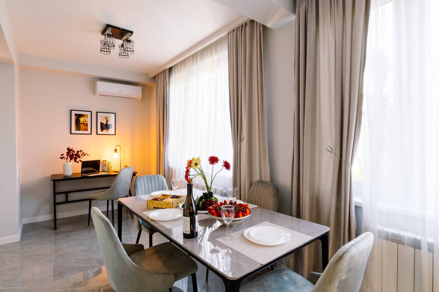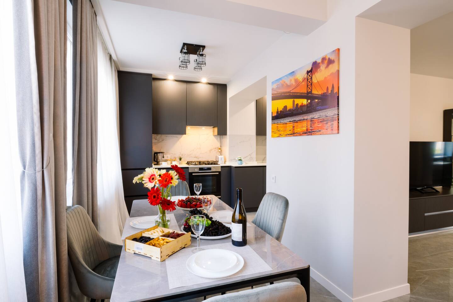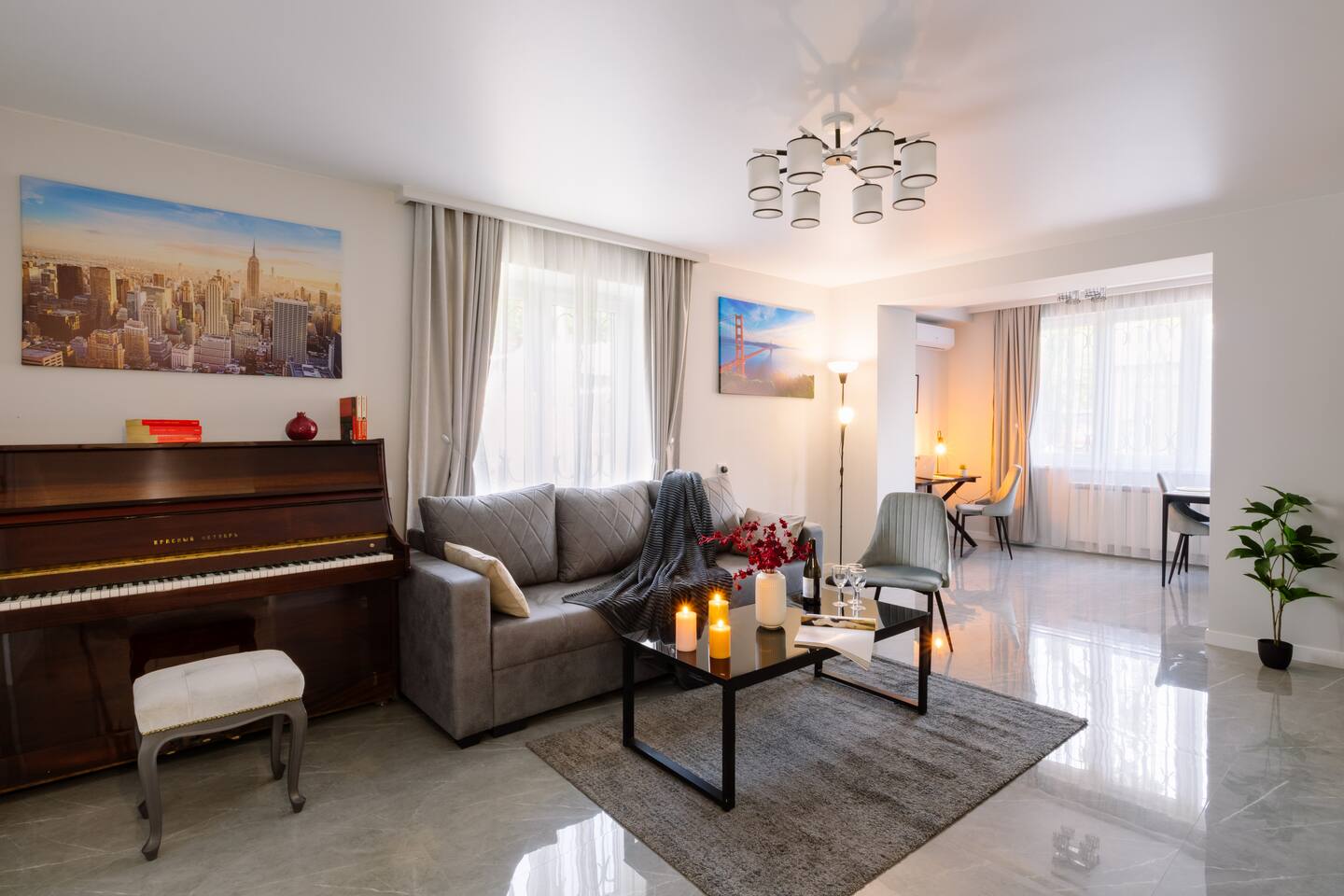 Location & Address: Situated on Babayan street, our apartment provides you with front-row seats to the famous Victory Park. Enjoy the refreshing clean air and all the delightful activities the park has to offer. The Living Room: A space that exudes light and freedom, our living room features an eye-catching piano that sets a unique tone. Newly refurbished with light, airy colors, the room boasts a high-quality sofa bed, side chairs, and a coffee table, all facing an elegant display cabinet. With tasteful wall art, stylish shades, and luxurious carpeting, this space connects seamlessly with the premium kitchen for an open, inviting feel. The Full Kitchen: Straight out of a design magazine, our brand-new, bespoke kitchen is the heart of the home. Fully equipped with a stove, oven, extractor, high-end kitchen tap, coffee machine, and dishwasher, its quartz countertops and flashbacks add a touch of luxury. A dining table seating six invites you to enjoy unforgettable meals together in this stunning setting. Bedroom 1: Experience relaxation and calm in our first bedroom. Custom-built furniture, luxury curtains, and a king-size bed with a premium mattress create a haven of tranquility. The brave choice of blue for the furniture results in an extraordinary space filled with light from the large windows. You'll find ample storage, a TV, air conditioning, and a wardrobe with a mirror for your convenience. Bedroom 2: Our second bedroom features a king-size bed and an extra single bed, all with premium mattresses. Designed with a predominantly white color palette, the room offers plenty of storage, a full-size mirror, and beautiful wall art. Let the abundant light and the cozy rug underfoot comfort and welcome you. The Full Bathroom: Indulge yourself in our bathroom's premium-quality shower set, featuring a cabin shower with great water pressure. A washing machine and LED mirror add practicality, while the storage spaces keep your toiletries neatly organized. The stunning interplay between the black and white porcelain tiles creates an elegant aesthetic. Our apartment in Yerevan is designed to create an unforgettable stay just for you. This remarkable apartment, with its thoughtful design and luxury amenities, is more than just a place to stay. It's a space where memories are made, where each day of your visit can start with a glance at the Victory Park and end in a comfortable, stylish setting. We've curated each room with care, ensuring your utmost comfort and satisfaction. You're not just booking a vacation home; you're setting the stage for an unforgettable experience. So, why wait? Begin your adventure in Yerevan in style and luxury – we can't wait to welcome you to your home away from home!
