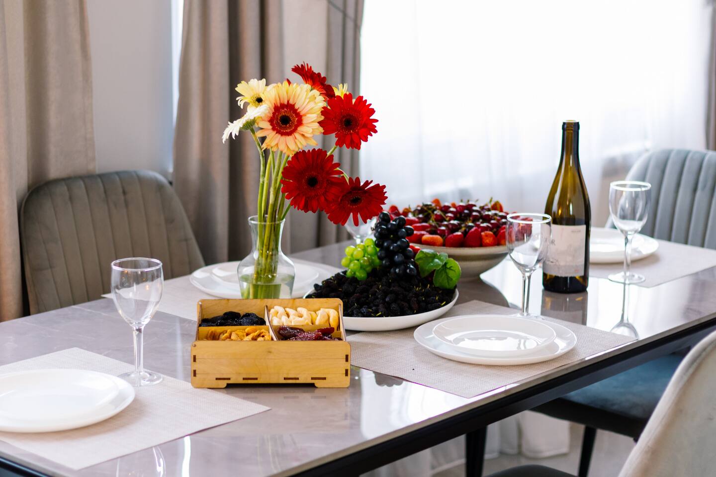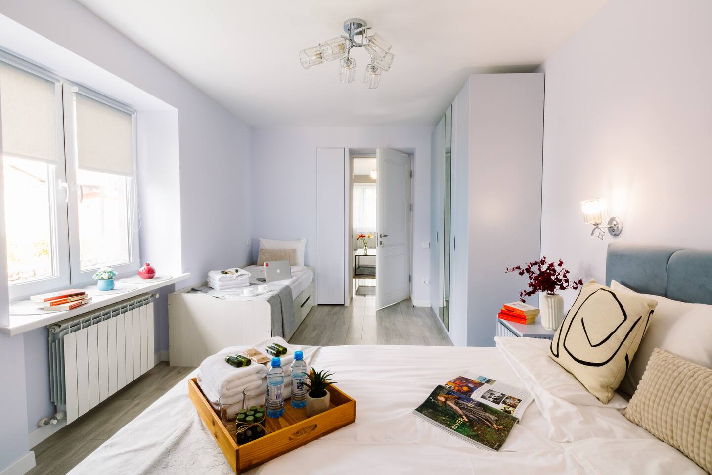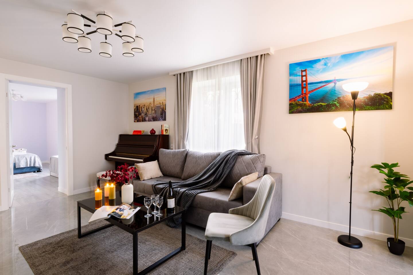 Location & Address: Situated on Babayan street, our apartment provides you with front-row seats to the famous Victory Park. Enjoy the refreshing clean air and all the delightful activities the park has to offer. The Living Room: A space that exudes light and freedom, our living room features an eye-catching piano that sets a unique tone. Newly refurbished with light, airy colors, the room boasts a high-quality sofa bed, side chairs, and a coffee table, all facing an elegant display cabinet. With tasteful wall art, stylish shades, and luxurious carpeting, this space connects seamlessly with the premium kitchen for an open, inviting feel. The Full Kitchen: Straight out of a design magazine, our brand-new, bespoke kitchen is the heart of the home. Fully equipped with a stove, oven, extractor, high-end kitchen tap, coffee machine, and dishwasher, its quartz countertops and flashbacks add a touch of luxury. A dining table seating six invites you to enjoy unforgettable meals together in this stunning setting. Bedroom 1: Experience relaxation and calm in our first bedroom. Custom-built furniture, luxury curtains, and a king-size bed with a premium mattress create a haven of tranquility. The brave choice of blue for the furniture results in an extraordinary space filled with light from the large windows. You'll find ample storage, a TV, air conditioning, and a wardrobe with a mirror for your convenience. Bedroom 2: Our second bedroom features a king-size bed and an extra single bed, all with premium mattresses. Designed with a predominantly white color palette, the room offers plenty of storage, a full-size mirror, and beautiful wall art. Let the abundant light and the cozy rug underfoot comfort and welcome you. The Full Bathroom: Indulge yourself in our bathroom's premium-quality shower set, featuring a cabin shower with great water pressure. A washing machine and LED mirror add practicality, while the storage spaces keep your toiletries neatly organized. The stunning interplay between the black and white porcelain tiles creates an elegant aesthetic. Our apartment in Yerevan is designed to create an unforgettable stay just for you. This remarkable apartment, with its thoughtful design and luxury amenities, is more than just a place to stay. It's a space where memories are made, where each day of your visit can start with a glance at the Victory Park and end in a comfortable, stylish setting. We've curated each room with care, ensuring your utmost comfort and satisfaction. You're not just booking a vacation home; you're setting the stage for an unforgettable experience. So, why wait? Begin your adventure in Yerevan in style and luxury – we can't wait to welcome you to your home away from home!