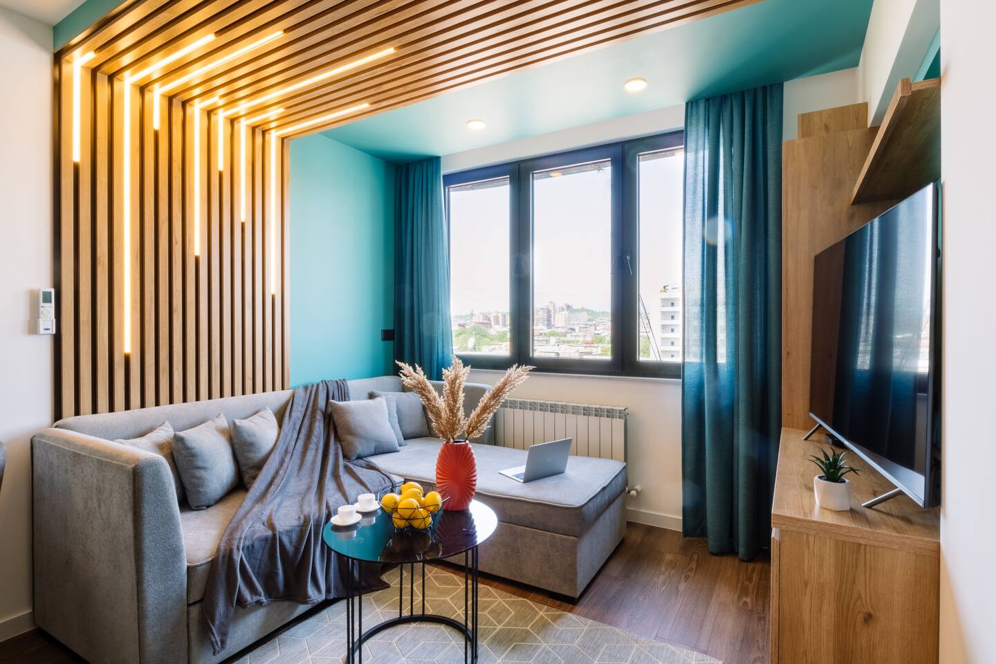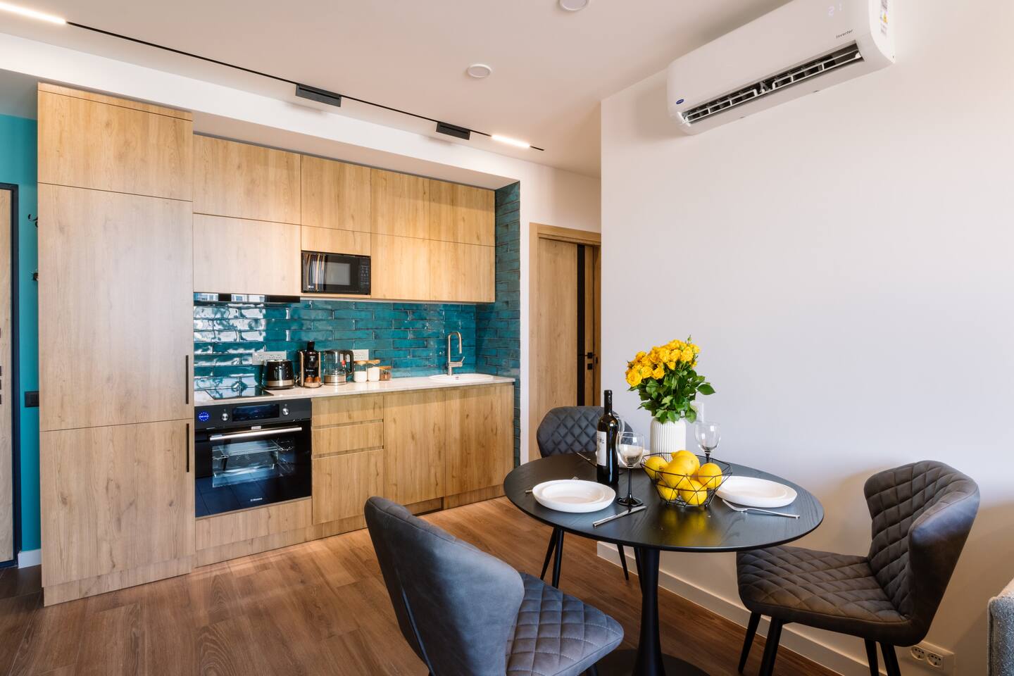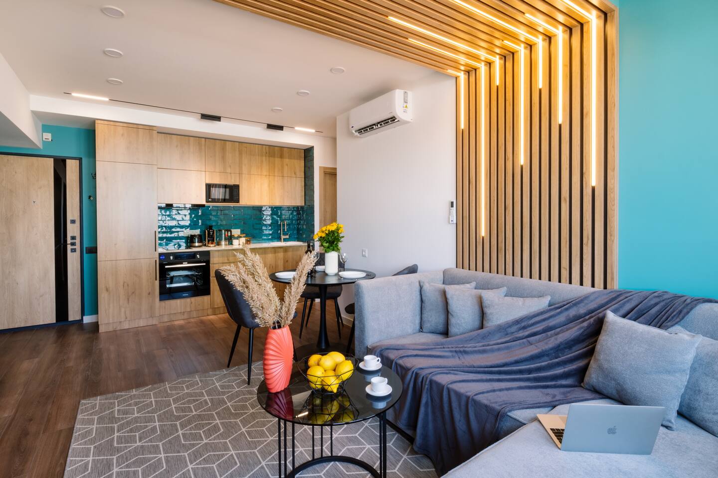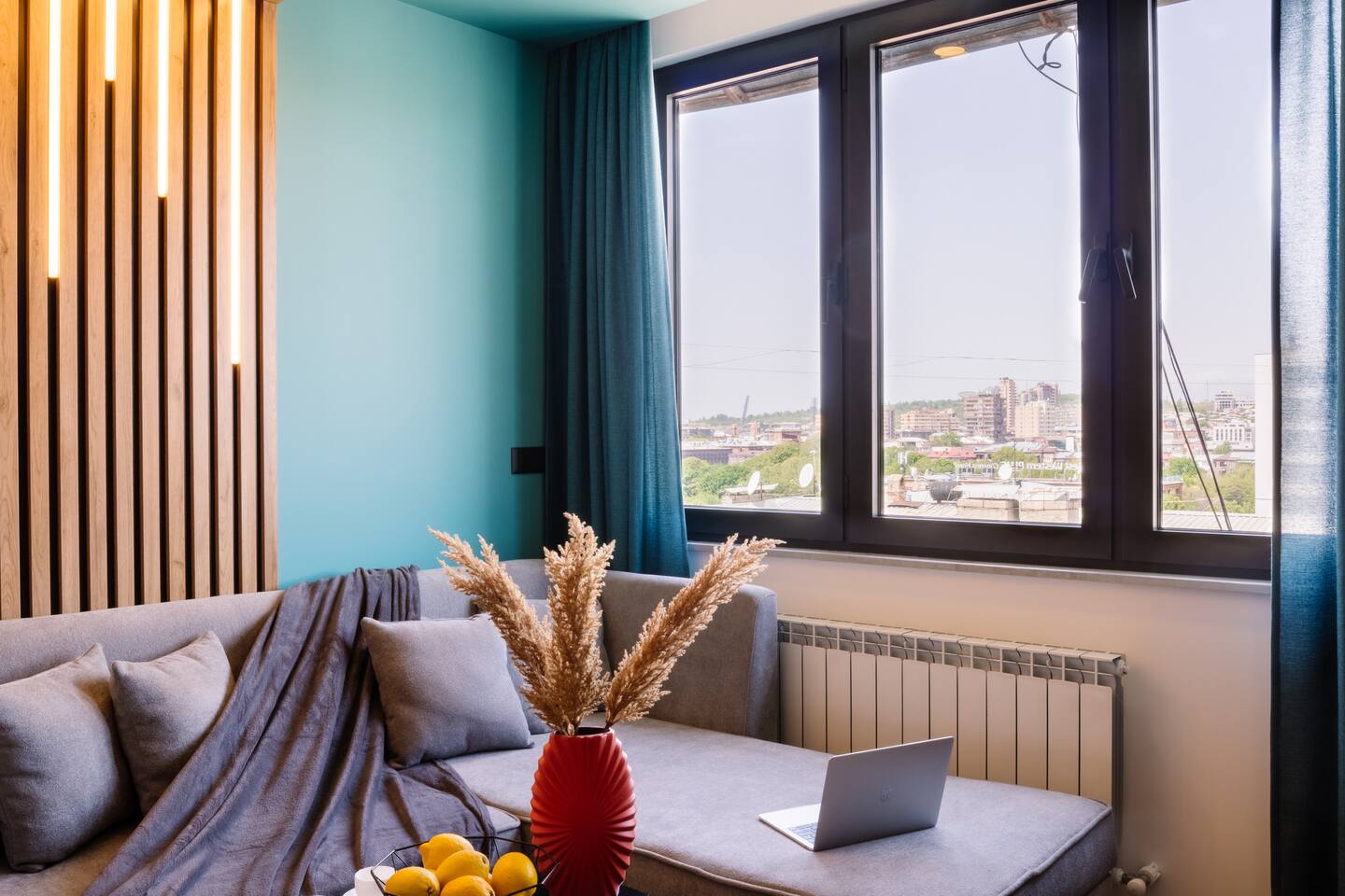 Introducing Sapphire: A Symphony of Style and Light Location: Situated at the prime location of Khorenatsi 25, Sapphire places you just a 4-minute walk from Republic Square and within easy reach of three main parks—offering an unparalleled blend of urban convenience and natural beauty. Living Room: Enter the Sapphire living room, a blend of deep blue tones and dynamic lighting that creates a captivating atmosphere. Furnished with a premium sofa bed, a large TV with complimentary Netflix, and distinctive wall art, this space radiates an electric vibe. A Crosley Vinyl Player adds retro charm, while LED lights connect the ceiling and walls, celebrating modern living with timeless elegance. Kitchen: Discover culinary elegance in the Sapphire kitchen, adorned with classic wood-style cabinets and top-notch appliances including a fridge, freezer, oven, stove, and dishwasher. The space combines functionality with style, featuring ample storage and a modern extractor. A chic breakfast bar and striking backsplash add to the inviting ambiance, making it a perfect blend of warmth and modernity. Bedroom: Enter the bedroom and be enveloped in a world of subtle elegance and comfort. The super premium mattress, surrounded by soft, easy colors and numerous pillows, promises a heavenly sleep. The room features full-length windows that flood the space with light, dark shades for tranquility, and dedicated reading lights. A working desk in the bedroom adds to the thoughtful layout. Bathroom: The bathroom is outfitted with luxurious tiles and features a high-end shower set, an LED mirror, and an integrated washer and dryer for utmost convenience. Every detail, from the cabin shower to the ample storage, reflects sophistication and quality. Building: Reside in a heritage building that combines historical charm with contemporary amenities, including a new modern lift, ensuring every aspect of your stay is seamless. Dive into the Sapphire experience, where every detail is curated for those who appreciate the finer things. From the electrifying ambiance to the thoughtful blend of the old and new, Sapphire is not just a place to stay—it's a destination to experience and cherish