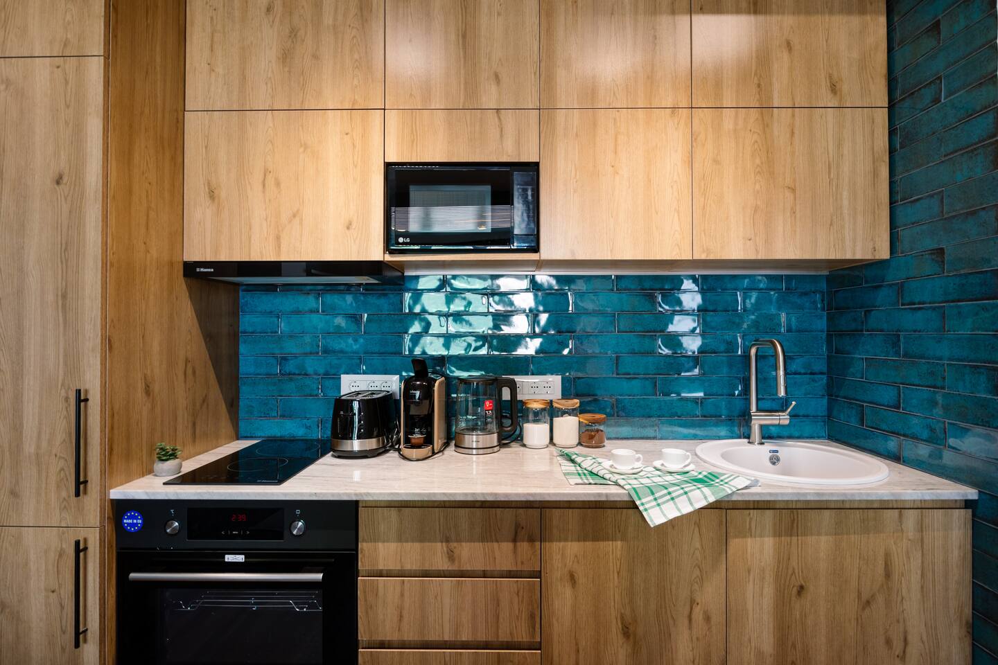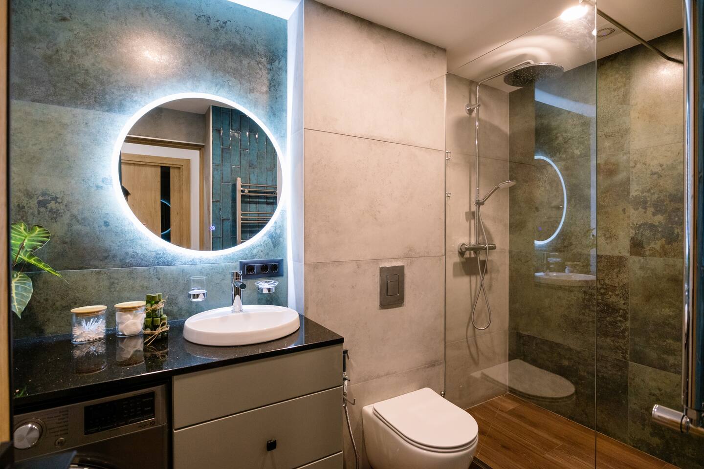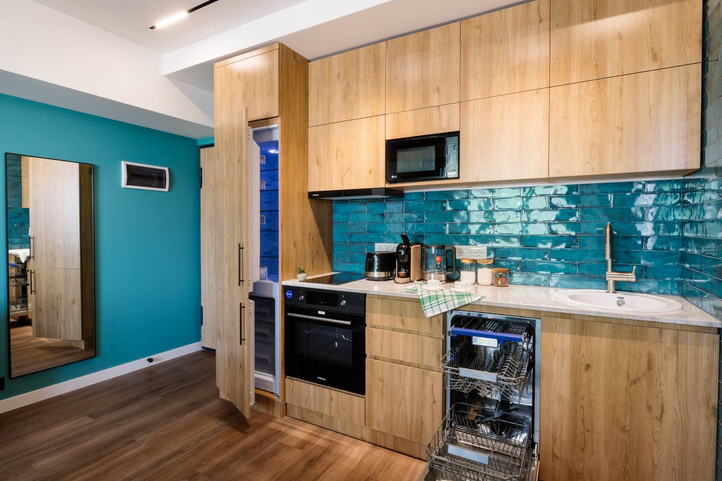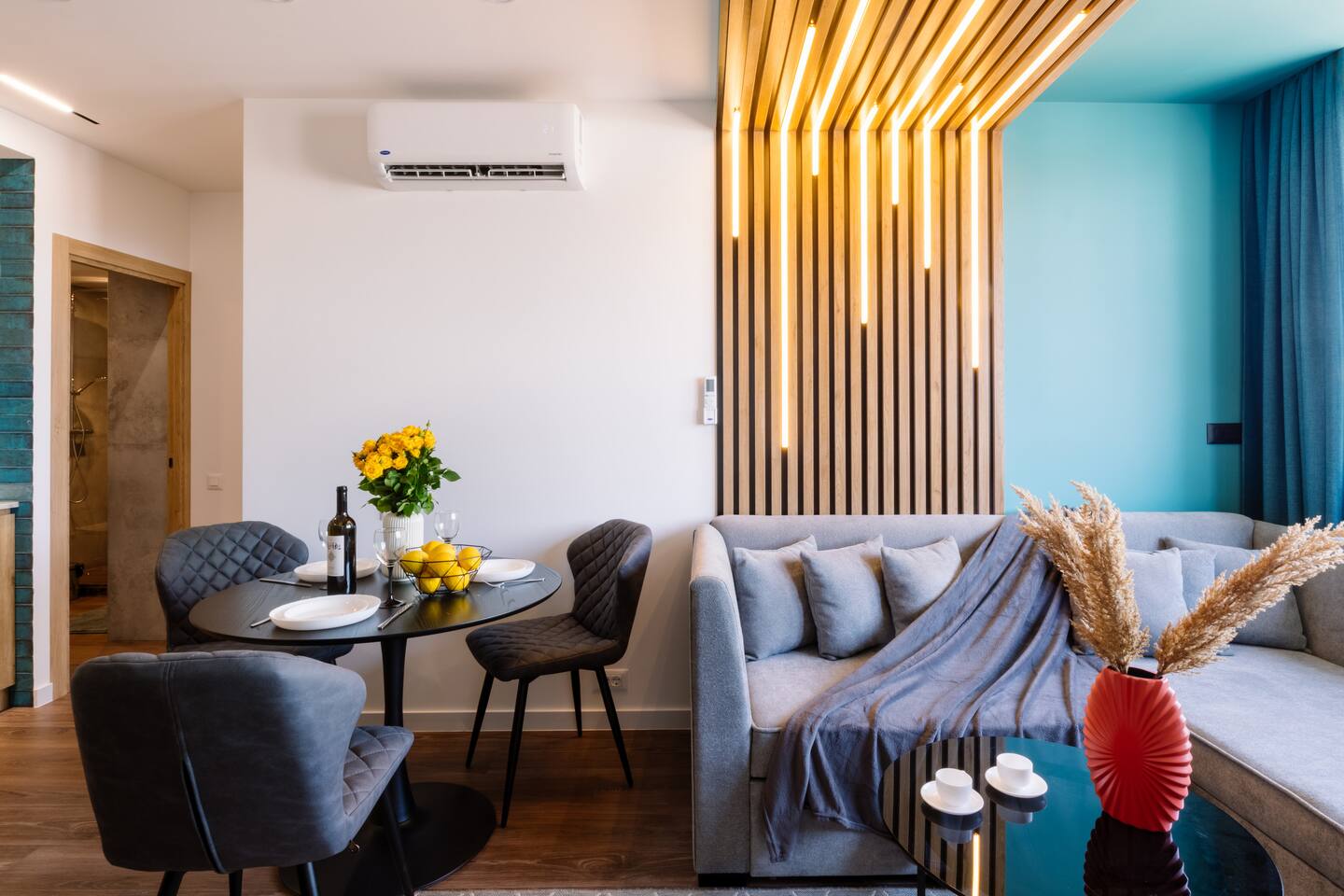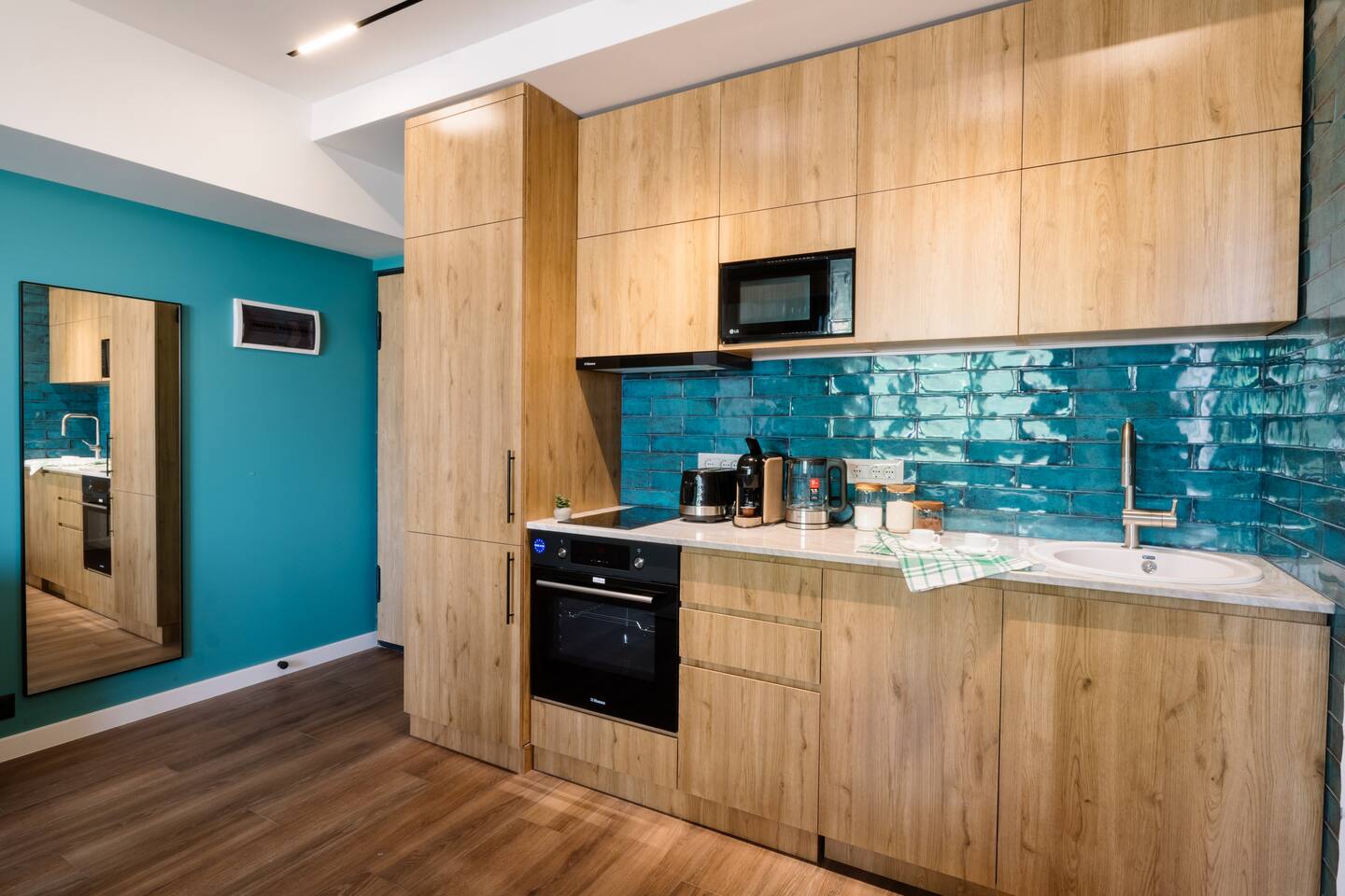 Introducing Sapphire: A Symphony of Style and Light Location: Situated at the prime location of Khorenatsi 25, Sapphire places you just a 4-minute walk from Republic Square and within easy reach of three main parks—offering an unparalleled blend of urban convenience and natural beauty. Living Room: Enter the Sapphire living room, a blend of deep blue tones and dynamic lighting that creates a captivating atmosphere. Furnished with a premium sofa bed, a large TV with complimentary Netflix, and distinctive wall art, this space radiates an electric vibe. A Crosley Vinyl Player adds retro charm, while LED lights connect the ceiling and walls, celebrating modern living with timeless elegance. Kitchen: Discover culinary elegance in the Sapphire kitchen, adorned with classic wood-style cabinets and top-notch appliances including a fridge, freezer, oven, stove, and dishwasher. The space combines functionality with style, featuring ample storage and a modern extractor. A chic breakfast bar and striking backsplash add to the inviting ambiance, making it a perfect blend of warmth and modernity. Bedroom: Enter the bedroom and be enveloped in a world of subtle elegance and comfort. The super premium mattress, surrounded by soft, easy colors and numerous pillows, promises a heavenly sleep. The room features full-length windows that flood the space with light, dark shades for tranquility, and dedicated reading lights. A working desk in the bedroom adds to the thoughtful layout. Bathroom: The bathroom is outfitted with luxurious tiles and features a high-end shower set, an LED mirror, and an integrated washer and dryer for utmost convenience. Every detail, from the cabin shower to the ample storage, reflects sophistication and quality. Building: Reside in a heritage building that combines historical charm with contemporary amenities, including a new modern lift, ensuring every aspect of your stay is seamless. Dive into the Sapphire experience, where every detail is curated for those who appreciate the finer things. From the electrifying ambiance to the thoughtful blend of the old and new, Sapphire is not just a place to stay—it's a destination to experience and cherish