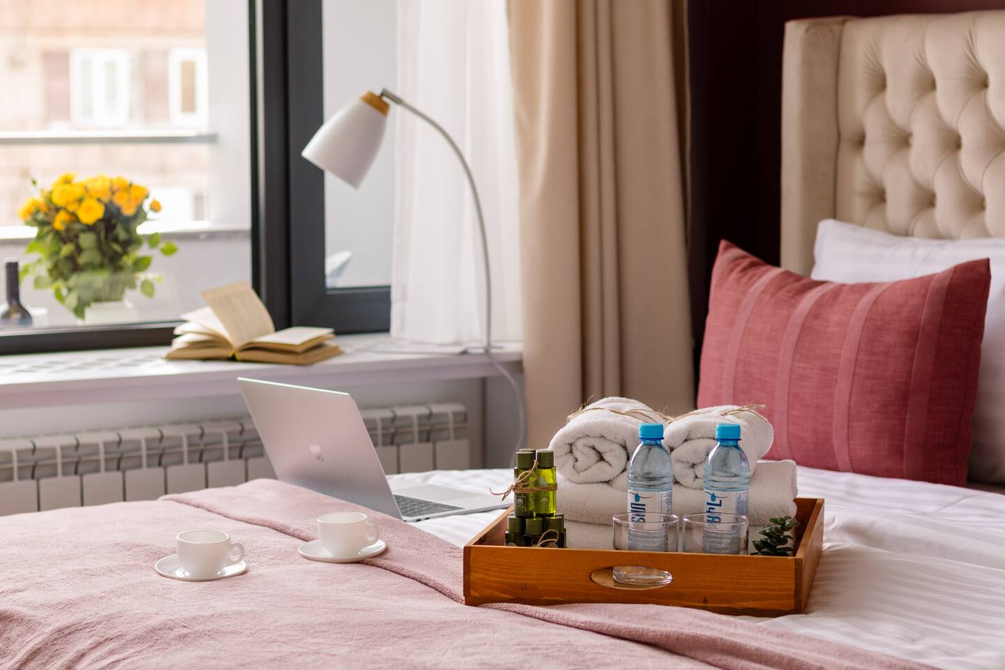 Introducing Scarlet: A Symphony of Style and Light Location: Nestled at Khorenatsi 25, Scarlet is just a 4-minute stroll from Republic Square and surrounded by three of the city’s majestic parks. It’s the perfect urban oasis. Living Room: Step into the sleek, open-plan living room, where every element sings in harmony. The premium sofa bed invites you to relax in front of a large TV equipped with complimentary Netflix. The room is styled with tasteful wall art and ambient lighting, and features a Crosley Vinyl Player that adds a nostalgic charm, reminiscent of a classic jazz club. A well-placed desk provides a convenient workspace. Kitchen: The kitchen is a marvel of design, with premium blue cabinetry that offers a timeless elegance. It's equipped with a fridge, freezer, oven, stove, and dishwasher. Ample storage and an extractor fan make it as functional as it is beautiful. The breakfast bar is the heart of this space—ideal for morning coffee or evening cocktails. Bedroom: Enter the serene bedroom and be greeted by calming hues and luxurious textures. The super premium mattress promises sublime comfort, and floor-to-ceiling windows offer a flood of natural light, complete with dark shades for a peaceful slumber. Thoughtful touches include reading lights and ample wardrobe space. Bathroom: The bathroom features high-end tiles, a premium shower set, and an LED mirror that adds a touch of modern luxury. It also includes a washer, dryer, and ample storage, ensuring convenience and elegance. Balcony: Step out onto the balcony and savor your morning coffee as the city wakes up around you. The journey from the kitchen to this peaceful retreat is simply delightful. Building: Scarlet is housed in a heritage building, seamlessly blending historic charm with modern amenities, including a new lift. "Scarlet" is more than just an apartment; it’s a destination of elegance and charm. Each detail is meticulously crafted, inviting guests to immerse themselves in a world where design meets sophistication. Experience Scarlet, where every stay is not just a visit, but a memorable journey into the heart of the city’s cultural tapestry.