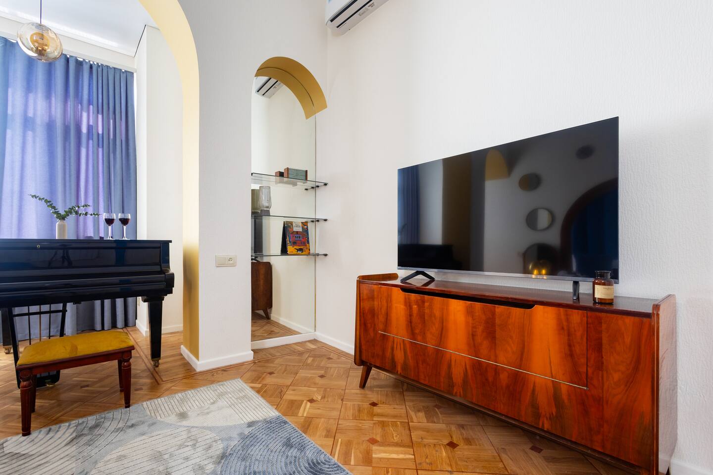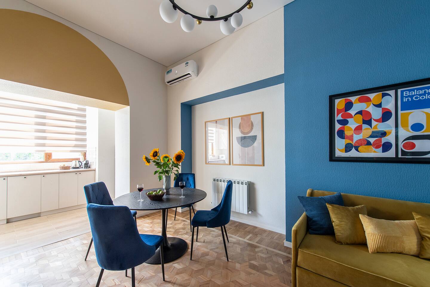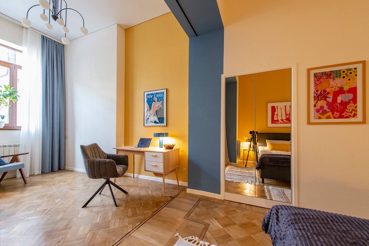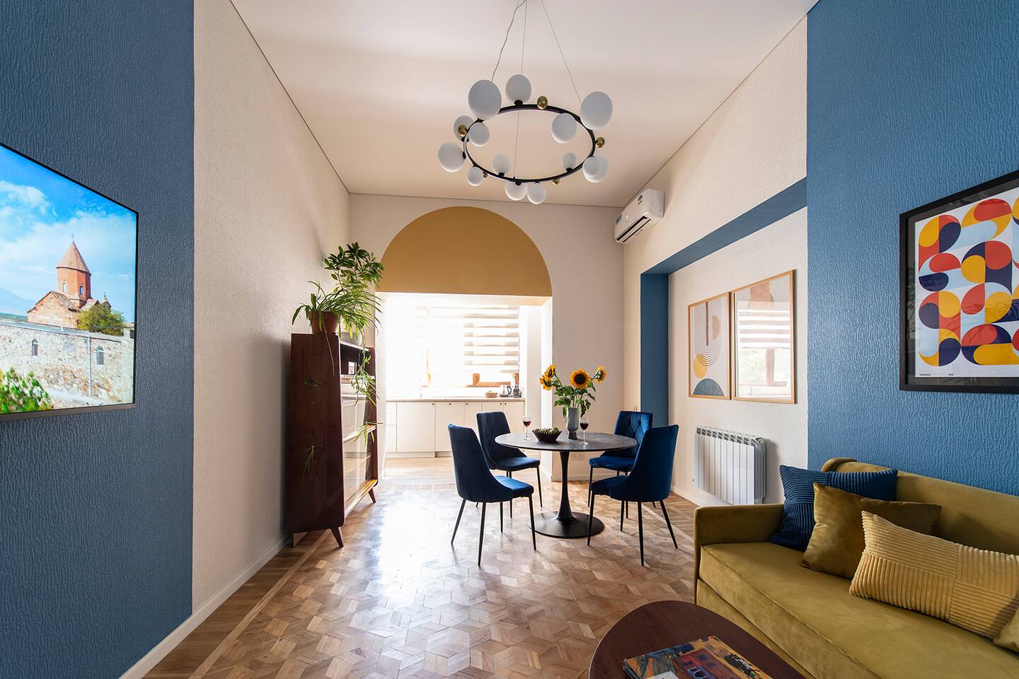 🎼 Symphonia by Hotelise - Where Heritage Meets Bold Design 📍 Location Set on 1 Silva Kaputikyan Street, Symphonia is tucked into one of Yerevan’s most refined quarters — the quiet side of Baghramyan Avenue, lined with embassies, leafy parks, and cultural institutions. Sharing its building with the Silva Kaputikyan Museum, the home of Armenia’s legendary poetess, this address is deeply woven into the city’s intellectual and artistic fabric. Cascade, Lovers’ Park, and the National Assembly are all a short walk away. ⸻ 🏛️ The Story This space is more than a listing , it’s the result of a family’s devotion to legacy. The owners, once neighbors of Silva Kaputikyan, chose not to sell, but to create something timeless with Hotelise: a residence where heritage is reimagined with modern design. Today, Symphonia is featured in several design publications for its masterful harmony of eras, materials, and moods. ⸻ 🛋️ Living Room & Kitchen Step into a vibrant symphony of colour: bold electric blues, deep mustards, and sun-drenched wood textures. The living space is a curated composition vintage bookshelf and clock beside a sleek modern TV, artistic lighting, and abstract wall art that lives effortlessly among the textures. The kitchen is spacious, bright, and fully equipped: ✓ Dishwasher ✓ Oven ✓ Free-standing fridge ✓ Microwave ✓ Full dining setup with a stylish round table and plush chairs. ⸻ 🛏 Bedroom 1 - The Arch & the Piano This room is a showstopper. A sculptural feature headboard, flanked by a collection of designer mirrors and a golden-arched passage that frames a grand piano. Add velvet textiles, ambient lighting, a soft area rug, elegant side tables, and a smart TV , and you’re living in what feels like a scene from a design magazine. Plenty of wardrobe space completes the experience. ⸻ 🛏 Bedroom 2 - Yellow Glow & Loft Vibes Warm yellow tones and mirrored wardrobes reflect natural light beautifully. This bedroom includes a dedicated desk, perfect for remote work, and leads up a set of elegant wooden steps to a cozy lofted chill-out nook — ideal for reading or an afternoon pause. ⸻ 🚿 Bathroom Fully renovated with tasteful mosaic tiles, an enclosed glass shower cabin, LED-lit mirror, and clean modern finishes. Spa-like and spotless. ⸻ 🚽 WC Room Separate and equally stylish, fitted with all-new sanitary ware. ⸻ 🌟 The Experience Even the corridors are a visual journey — with curated wall art, mood lighting, and a sense of calm sophistication that carries through every corner. ⸻ 💫 Stay with Hotelise At Hotelise, we don’t just manage properties — we curate homes that tell stories. With over 130+ uniquely designed spaces across Yerevan, London, and beyond, our mission is to create design-led stays that feel like they were made just for you. Symphonia is one of our proudest chapters.