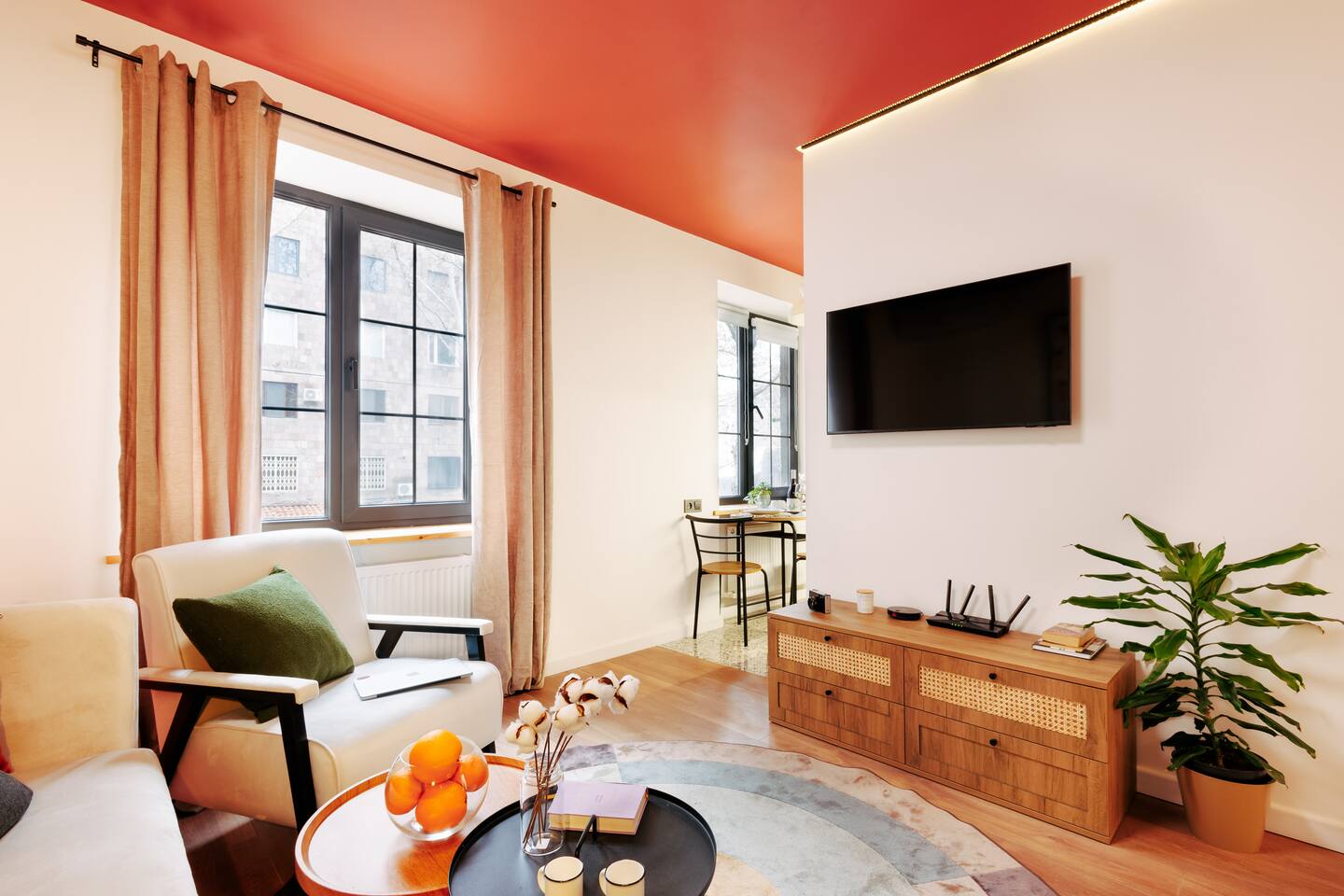 Welcome to Terracotta by Hotelise – Where Warm Design Meets Central Convenience Terracotta is a brand-new studio, thoughtfully designed and lovingly furnished to provide a unique and comfortable stay. Located at Zakyan 2, it boasts a prime location just a minute’s walk from Republic Square, nestled in a charming 5-floor stone building on the second floor. The name Terracotta reflects the earthy, vibrant accents chosen by our designers, creating a cozy and welcoming ambiance. This property is fresh, stylish, and ready to host its first guests with care and charm. Living Zone: This open-plan studio combines a bedroom and living room in a seamless, stylish layout. A comfortable sofa, a crafty rug, and a chic armchair create a vibey environment, perfectly positioned in front of the TV zone for relaxation. The bedroom is elegantly zoned behind a decorative glass wall, offering privacy while maintaining the airy feel. Thoughtful details like cushions, wall art, and decor elements add a touch of warmth, complemented by the powerful AC for year-round comfort. Bed size is 190x200cm. The living area flows effortlessly into a fully-fitted kitchen equipped with brand-new appliances, including a microwave, stove, dishwasher, and fridge—perfect for cooking or enjoying a quick coffee. Bathroom: The bathroom is a highlight of the studio, featuring stunning terracotta tones, metro tile design, and premium fixtures. With a luxurious shower set, large mirror, washing machine, and ample storage, it’s both functional and stylish. Terracotta exudes positivity and charm, making it one of our favorite additions to Hotelise. Whether it’s the thoughtful design, central location, or cozy vibe, every corner of this studio invites you to relax and enjoy. At Hotelise, we create more than just stays—we create spaces where memories begin. Book your stay at Terracotta and experience the best of Yerevan in style!