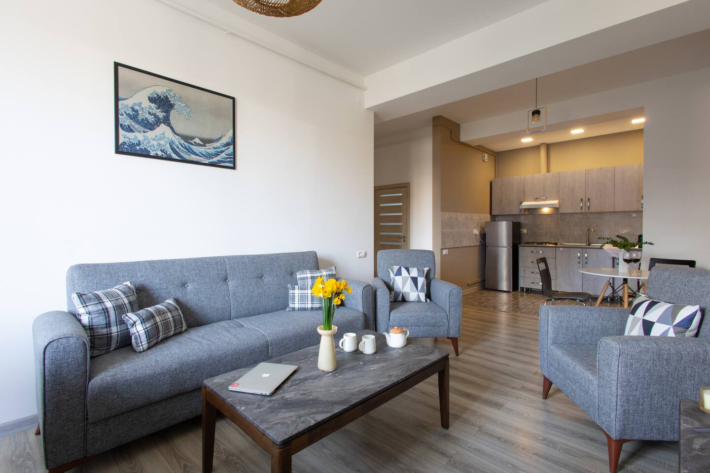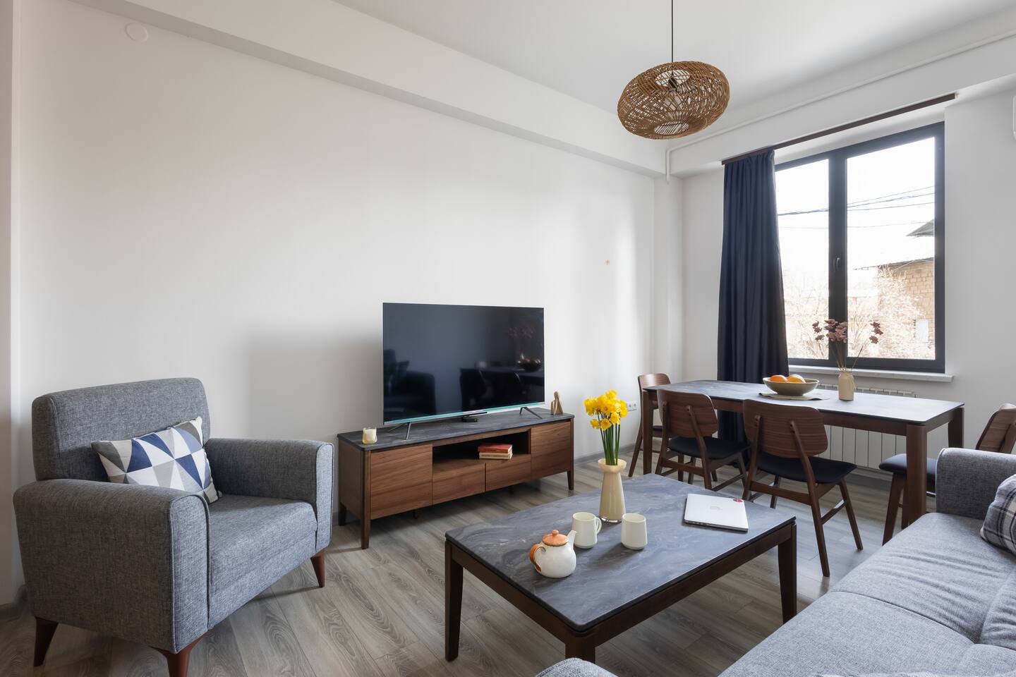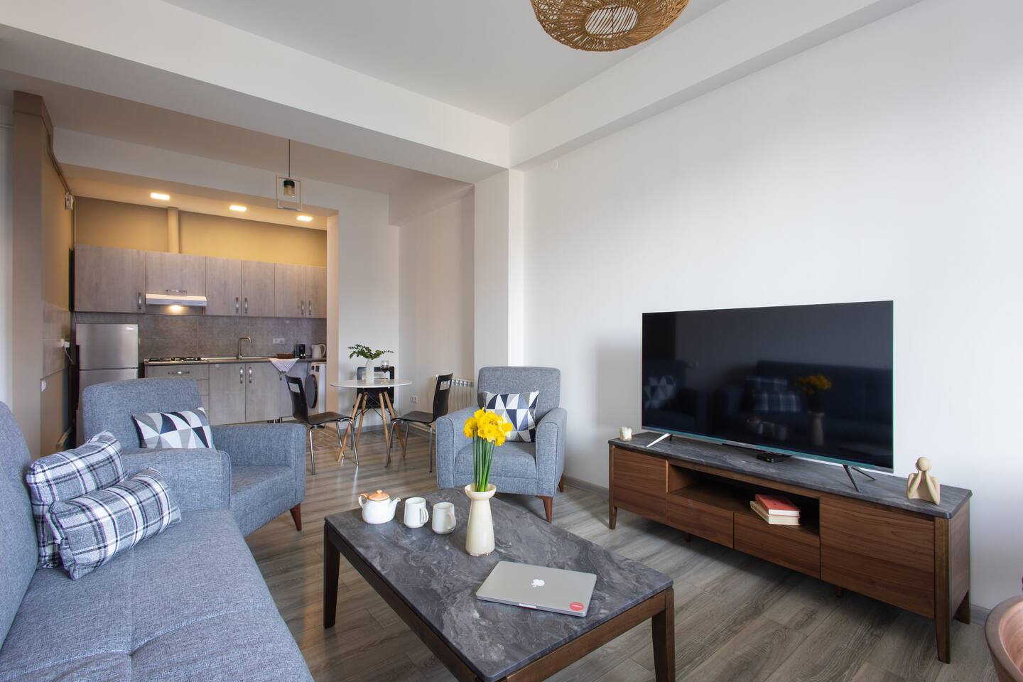 Welcome to 'Monarque " by Hotelise This modern and cozy apartment is located in one of Yerevan’s most peaceful and scenic areas — Monument, Vahagn Davtyan 1/4. Enjoy fresh air, beautiful city views, and a quiet neighborhood just minutes from the Cascade and city center. Perfect for travelers who want both relaxation and easy access to Yerevan’s main attractions. The area is considered one of the most elite residential districts in Yerevan, offering a perfect balance between tranquility and convenience. Surrounded by greenery and elegant residential buildings, the neighborhood is ideal for guests who want to enjoy a quiet, safe, and comfortable stay while still being close to the city center. The famous Monument Park area is just a short walk away, where you can enjoy panoramic views of Yerevan, Mount Ararat on clear days, walking paths, and relaxing outdoor spaces. The Cascade Complex, cafes, restaurants, and central Yerevan are only a few minutes by car. The apartment itself is located in a newly built, modern elite building with a clean entrance, secure access, and a well-maintained environment. The building offers a peaceful residential feel, perfect for both short and long stays. Inside, the home is bright, stylish, and thoughtfully designed with a modern aesthetic. The apartment features contemporary furniture, clean lines, and a comfortable layout that makes you feel at home from the moment you enter. The bedroom is spacious, bright, and designed for maximum comfort and relaxation. It features a high-quality, comfortable mattress that ensures a restful night’s sleep after a day exploring Yerevan. In the living room the bed turns into a comfortable sofa -bed. Make your stay unforgettable with Hotelise