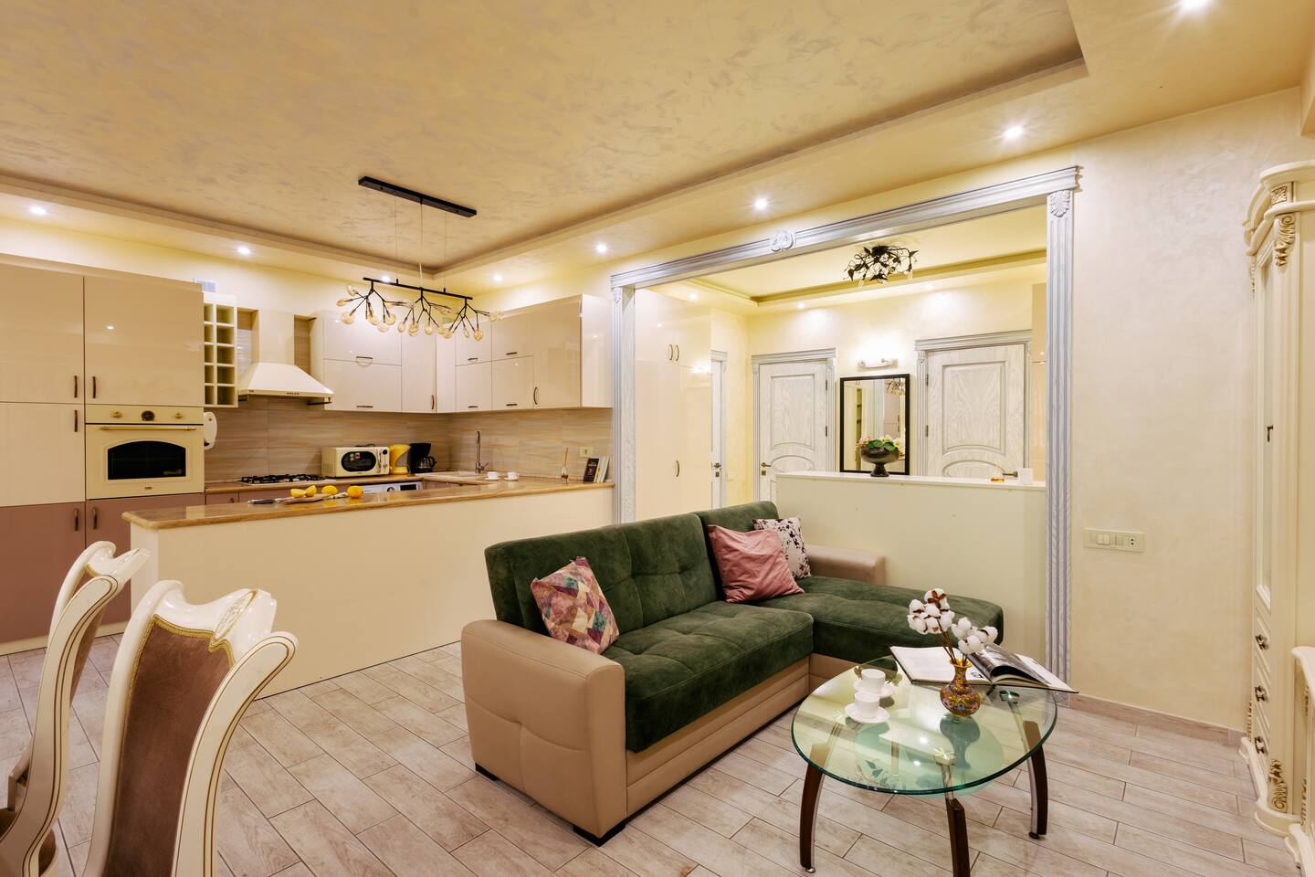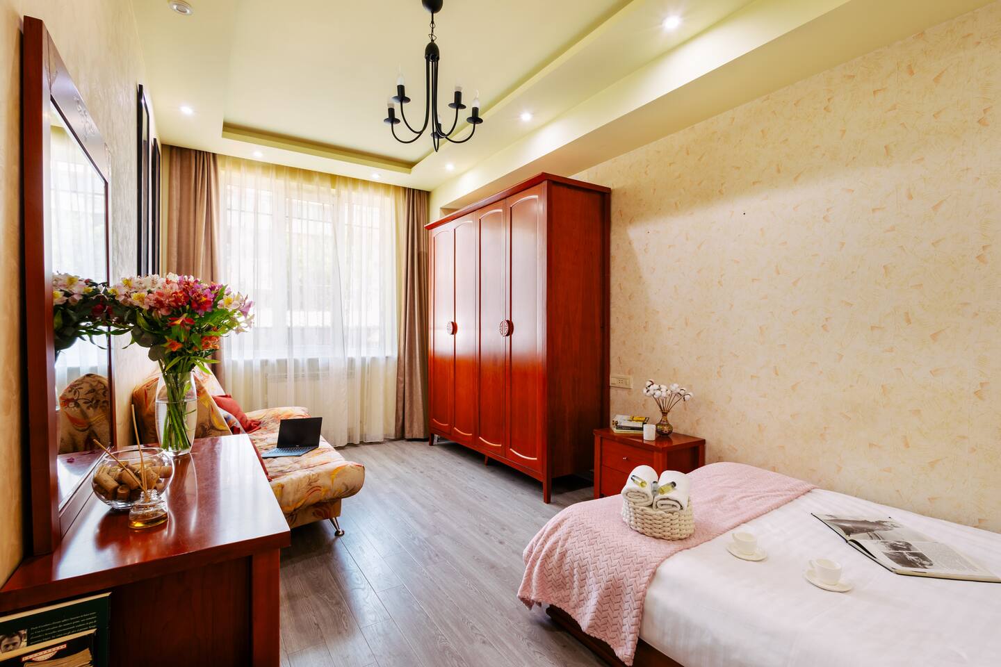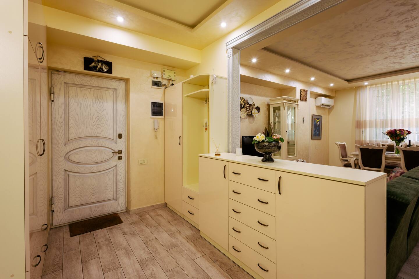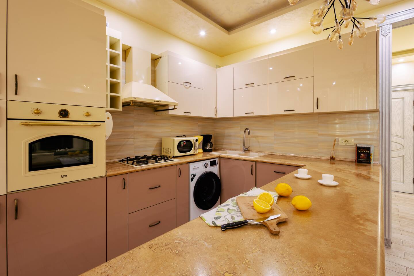 Welcome to "Zircon" by Hotelise – A Spacious Stay in Central Yerevan "Zircon" is an apartment offering plenty of space and comfort, with a touch of old-style charm. While the interior does not reflect the very modern style refurbishment, this apartment is perfect for those seeking ample sleeping arrangements in the heart of Yerevan. With 2 large bedrooms and plenty of sleeping options, including 2 sofa beds, a king-size bed, and a single bed, this home is ideal for families or larger groups. Location: Situated on Yeznik Koghbatsi Street, 2, the apartment offers a fantastic central location. You’ll be just steps away from supermarkets, coffee spots, parks, and within minutes of Republic Square, Saryan Street, and Aram Street, where Yerevan's best entertainment can be found. Despite being in such a prime spot, the building is tucked away from the street, ensuring a quiet stay. Living Room with Kitchen: The open-plan living room features a large L-shaped sofa, perfect for relaxing in front of the TV. A coffee table and large dining table for 6 provide space for meals and socializing. The kitchen is well-equipped, with an oven, microwave, washer, and coffee machine. There’s plenty of storage and all the cooking essentials you need. The room also benefits from a large A/C unit to keep you cool, as well as a full-length mirror that adds to the spacious feel. Bedroom 1: This large bedroom features a queen-size bed with bedside tables and soft lighting, perfect for a relaxing night's sleep. A chest of drawers with a mirror and a wardrobe offer plenty of storage space. The room also has blackout curtains to ensure a restful stay. An ensuite bathroom with a bathtub adds extra convenience. Bedroom 2: The second bedroom includes a single bed, a sofa that converts into a sofa bed, and a wardrobe for storage. Like the main bedroom, it is equipped with blackout curtains for comfort. Bathrooms: The ensuite bathroom in the main bedroom includes a bathtub, while a second full bathroom with a shower cabin is available for the rest of the apartment, making it ideal for larger groups. At Hotelise, we pride ourselves on offering comfortable, well-located spaces that make your stay memorable. "Zircon" combines space, convenience, and a central location, making it perfect for exploring Yerevan.
